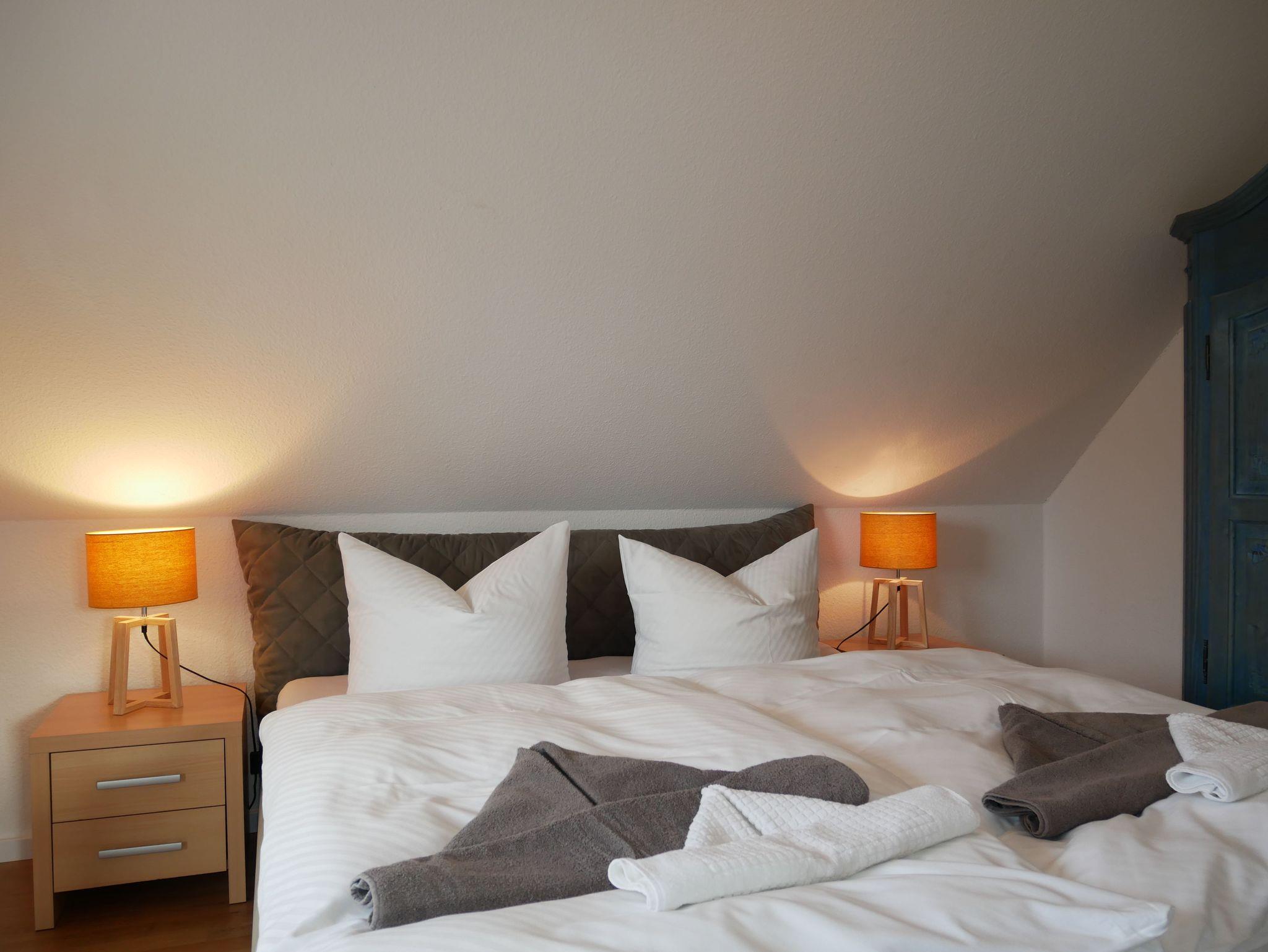 Ein helles und freundliches Schlafzimmer begrüßt sie mit einem Doppelbett und einem Kleiderschrank.