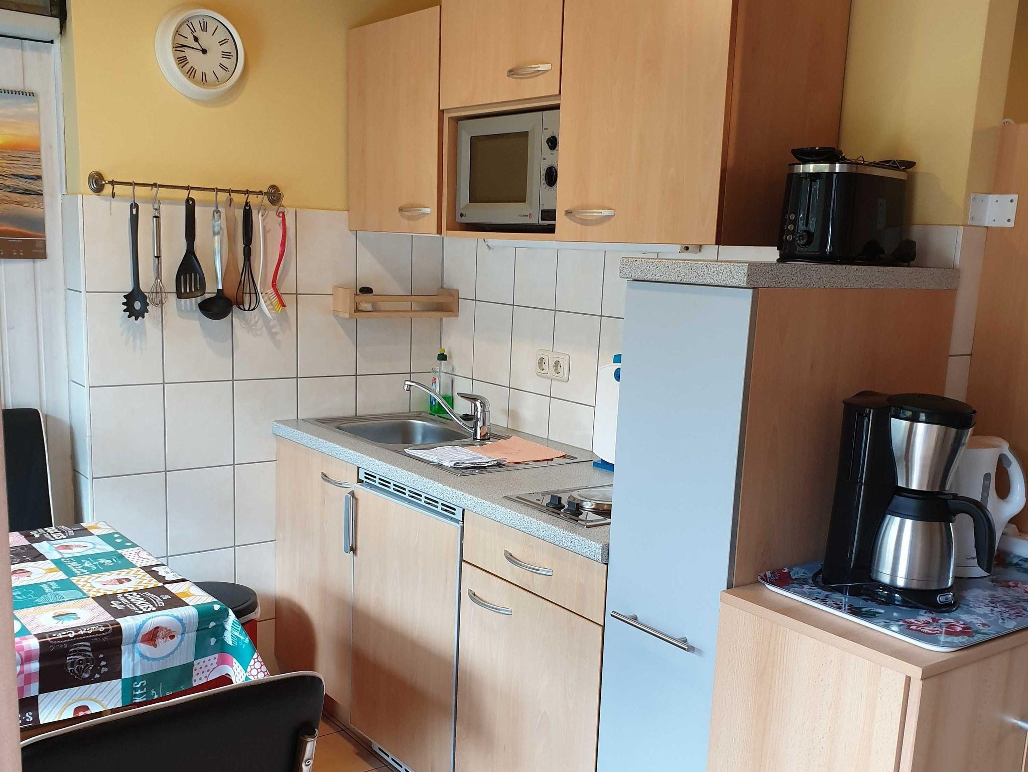 gut ausgestattete Pantryküche mit Herd, Wasserkocher, Gläser, Geschirr, Besteck, Mikrowelle, Kaffeemaschine, Toaster, Kühlschrank, Staubsauger + Kabel, CD/DVD Player, Kinderreisebett und Hochstuhl