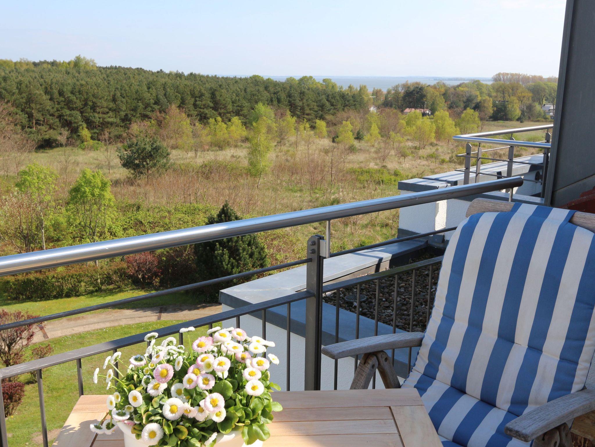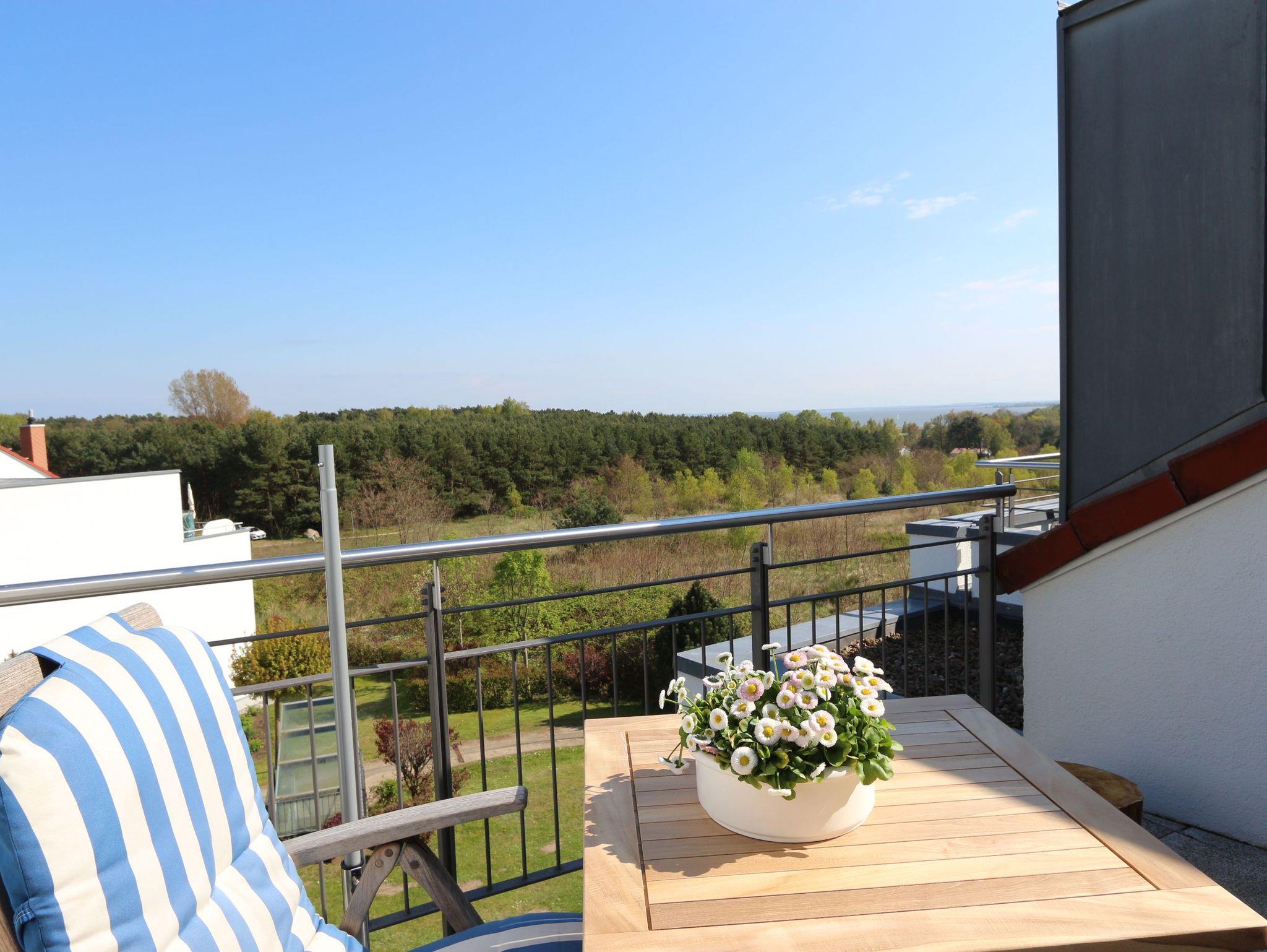 Die Penthousewohnung Nr. 6 mit 2 Dachterrassen befindet sich im 2. Obergeschoß der Residenz Bellevue in 17454 Zinnowitz, Heimweg 7 und bietet einen herrlichen Blick auf das Umfeld und die Landschaft, mit Wald und Achterwasser.