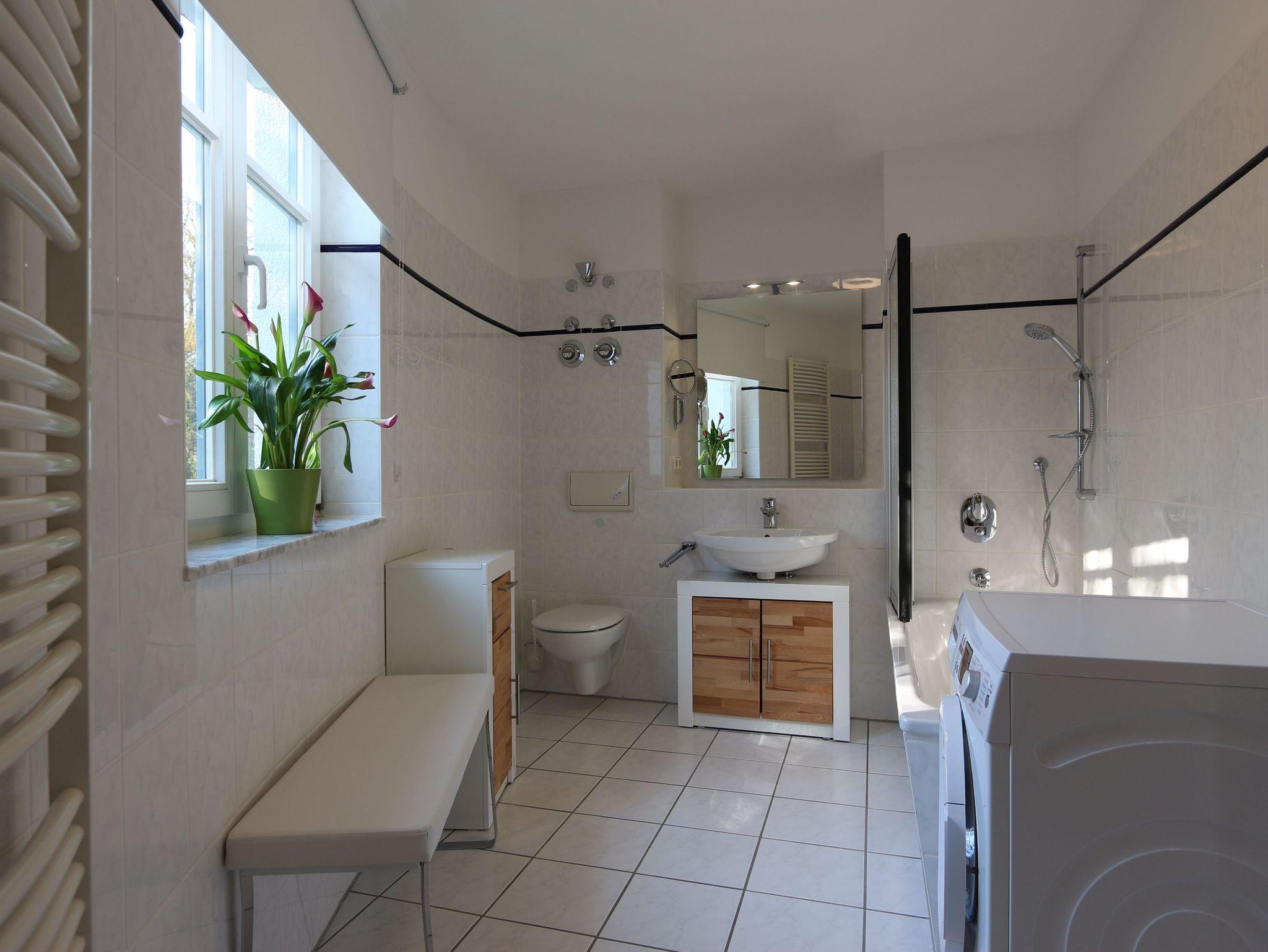 • Bad mit Badewanne und Duschabtrennung, Waschmaschine und Handtuchtrockenheizkörper.