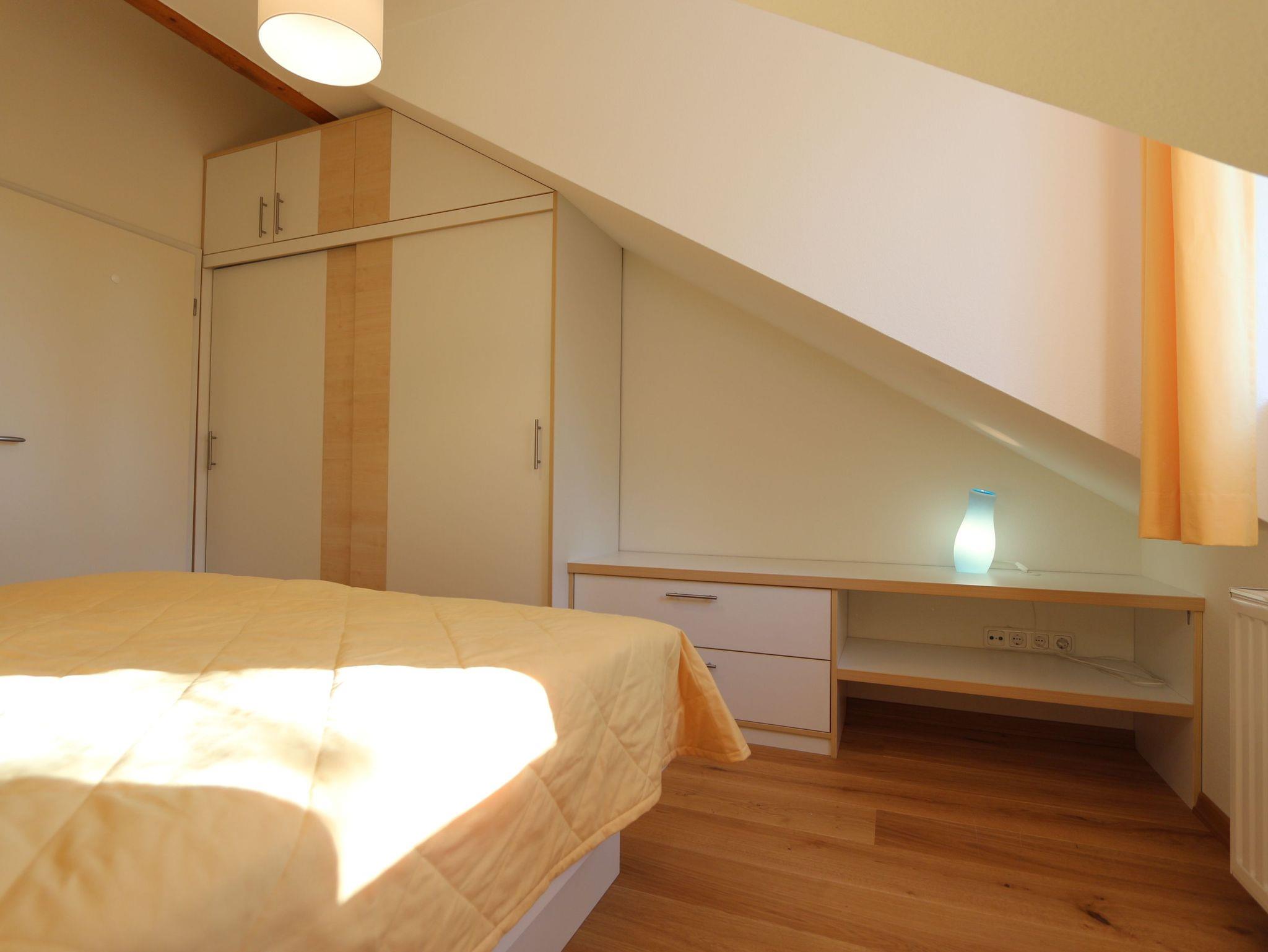 • Schlafzimmer mit Doppelbett (ca. 180 x 200 cm) für 2 Personen und Kleiderschrank.