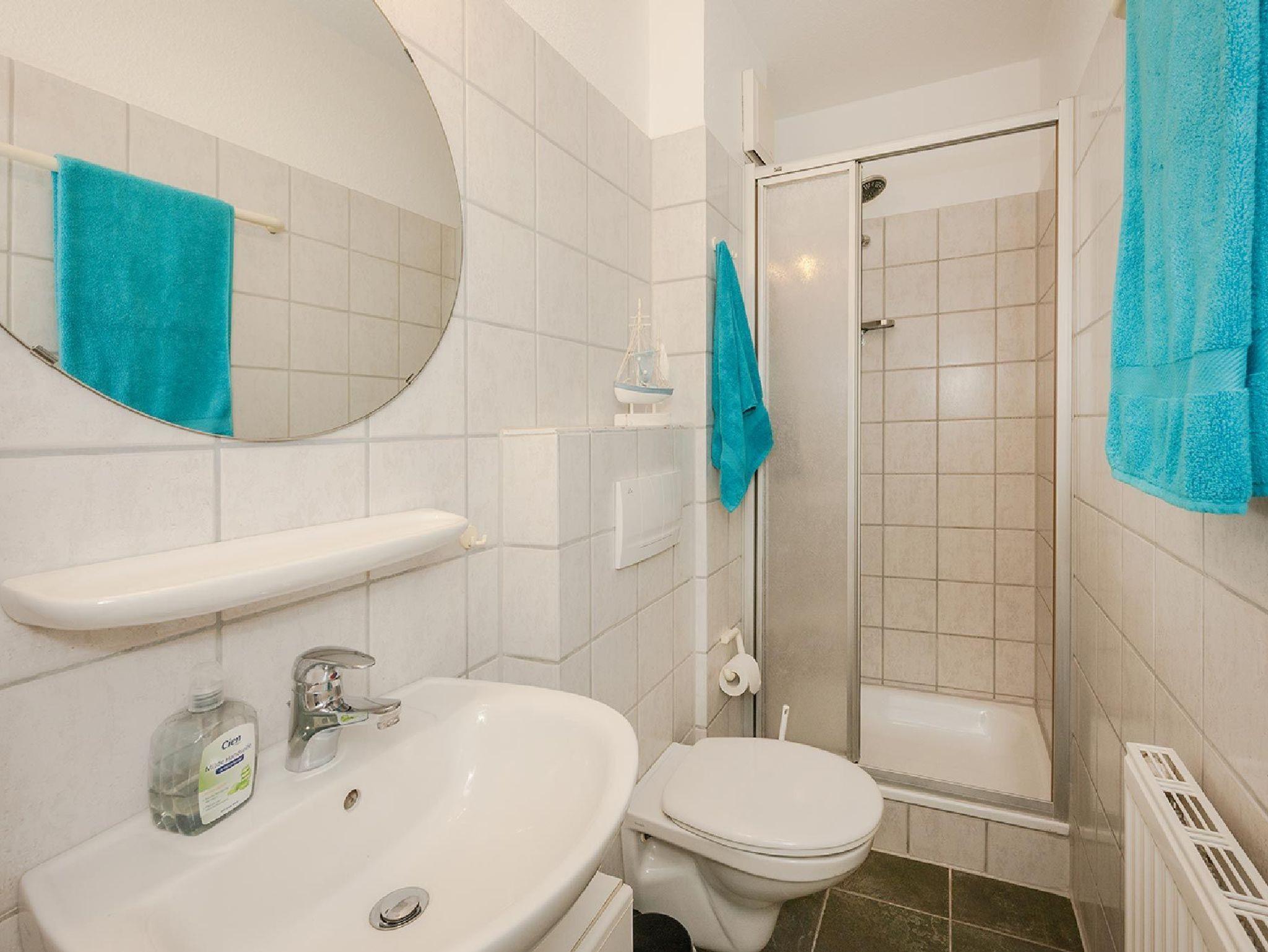 Das Badezimmer verfügt über eine Dusche und WC.