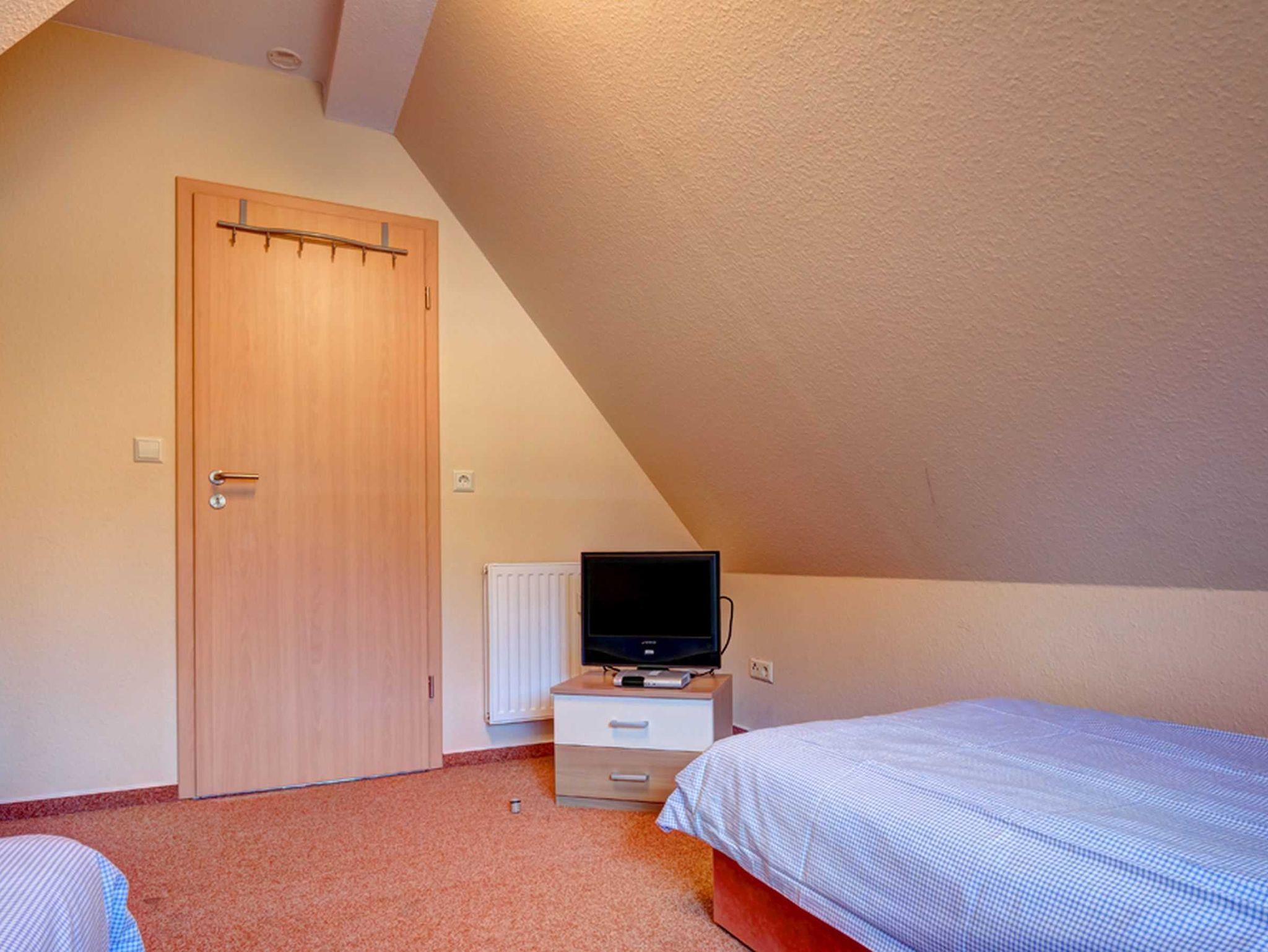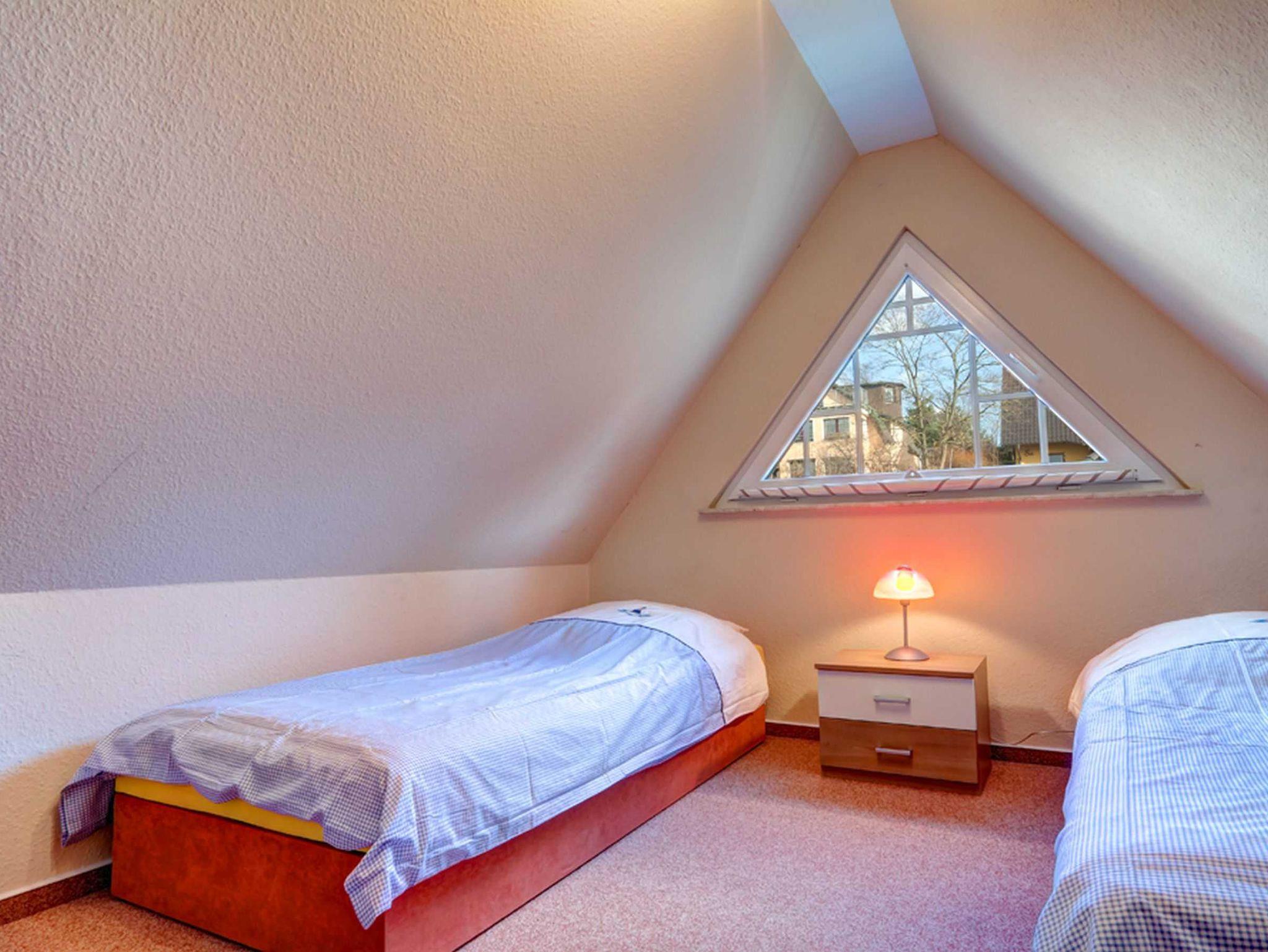 Im zweiten, etwas kleineren Schlafzimmer mit schönem Dreiecksfenster sind zwei Liegen mit jeweils 0,90m breiter Liegefläche. ein großer Kleiderschrank und 2 Nachtschränkchen untergebracht.