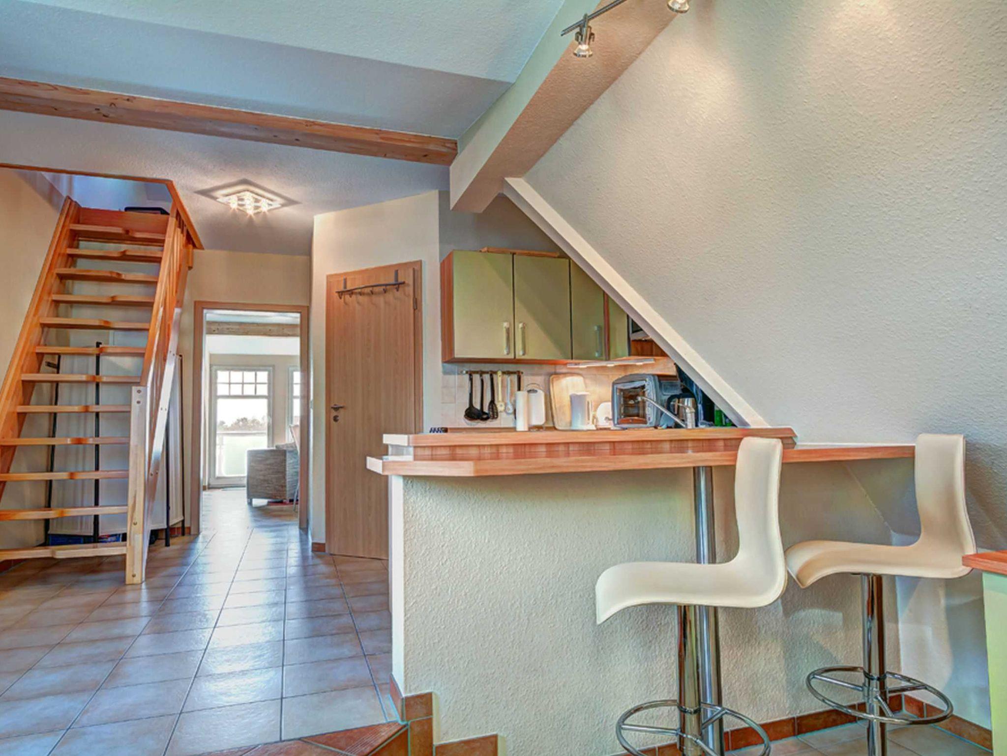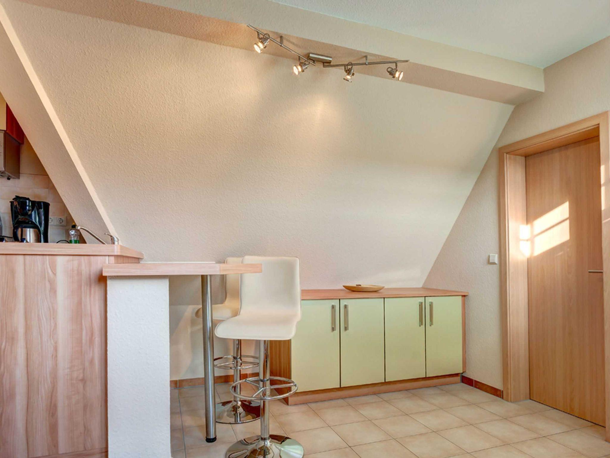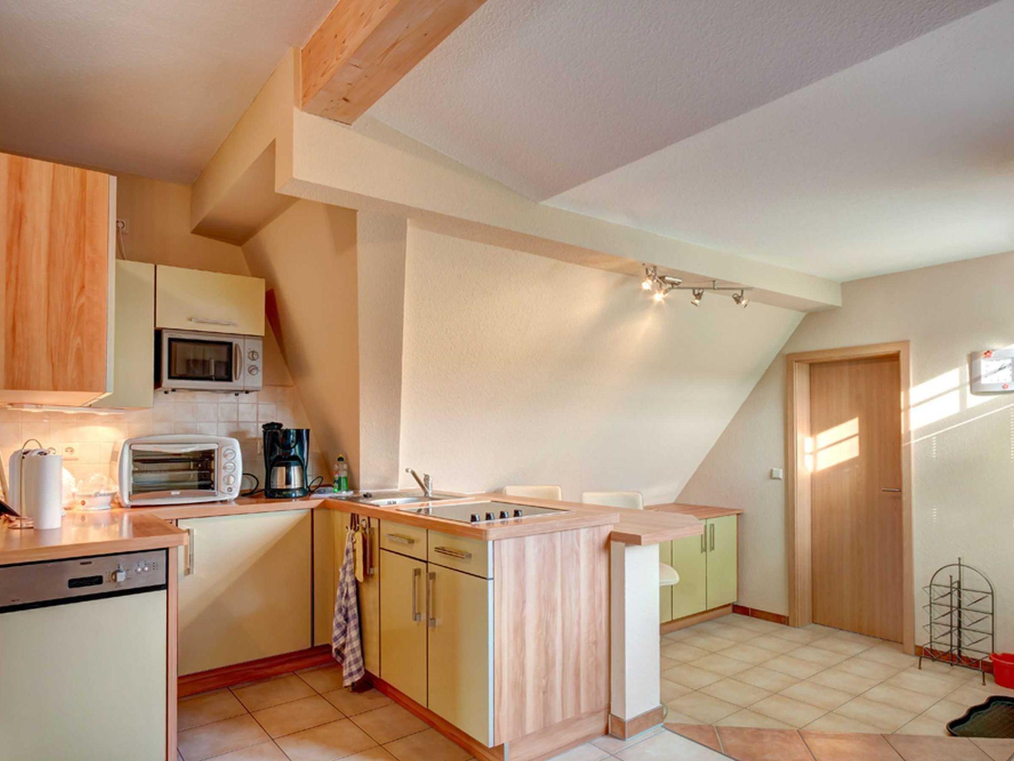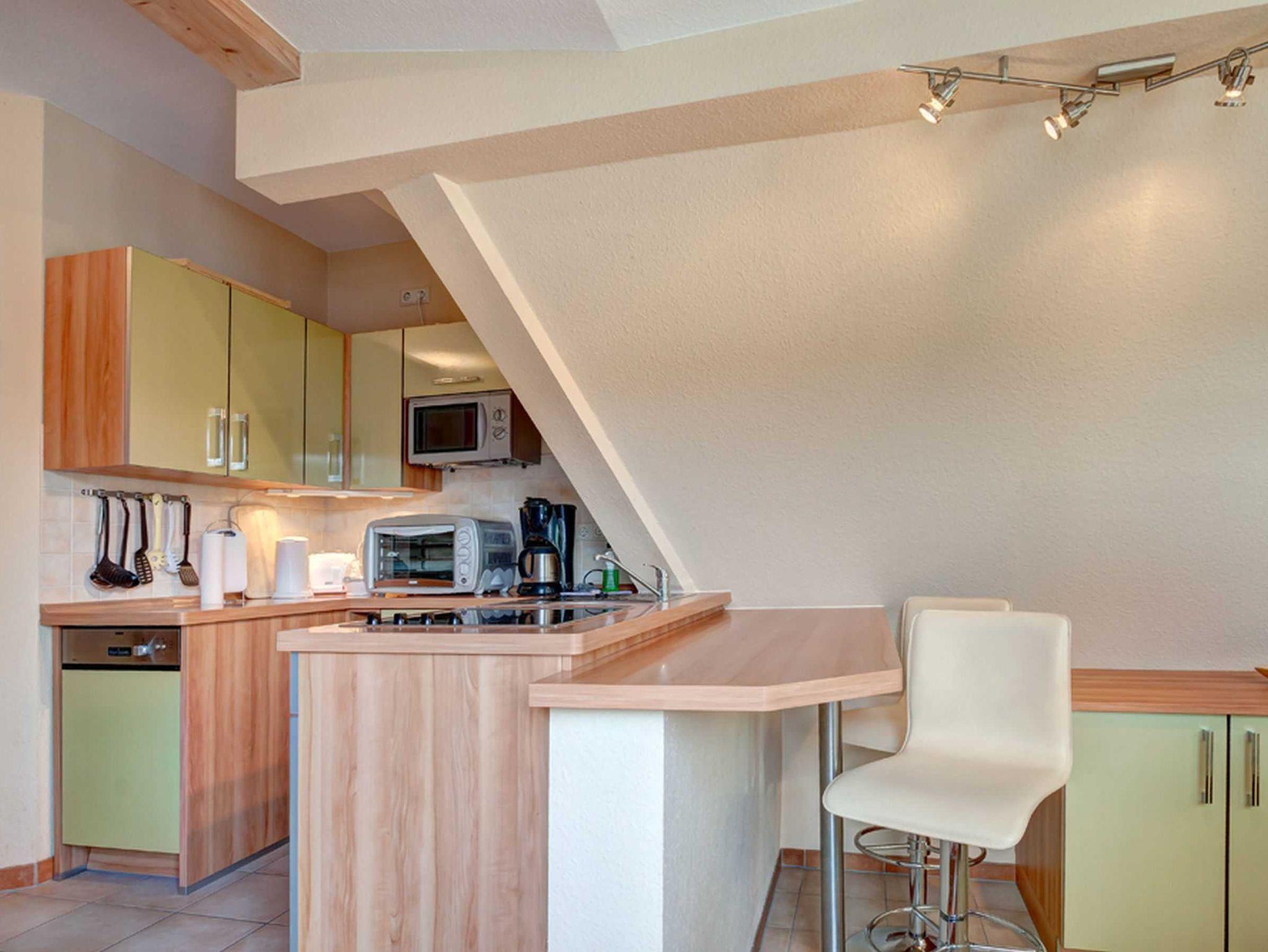Die Küche ist komplett eingerichtet, mit Backofen und Cerankochfeld, Geschirrspüler, Kühlschrank, Mikrowelle, Kaffeemaschine, Toaster und Wasserkocher. Ein eingebauter Tresen mit 2 Barhockern eröffnet die Möglichkeit eines gemütlichen Drinks.