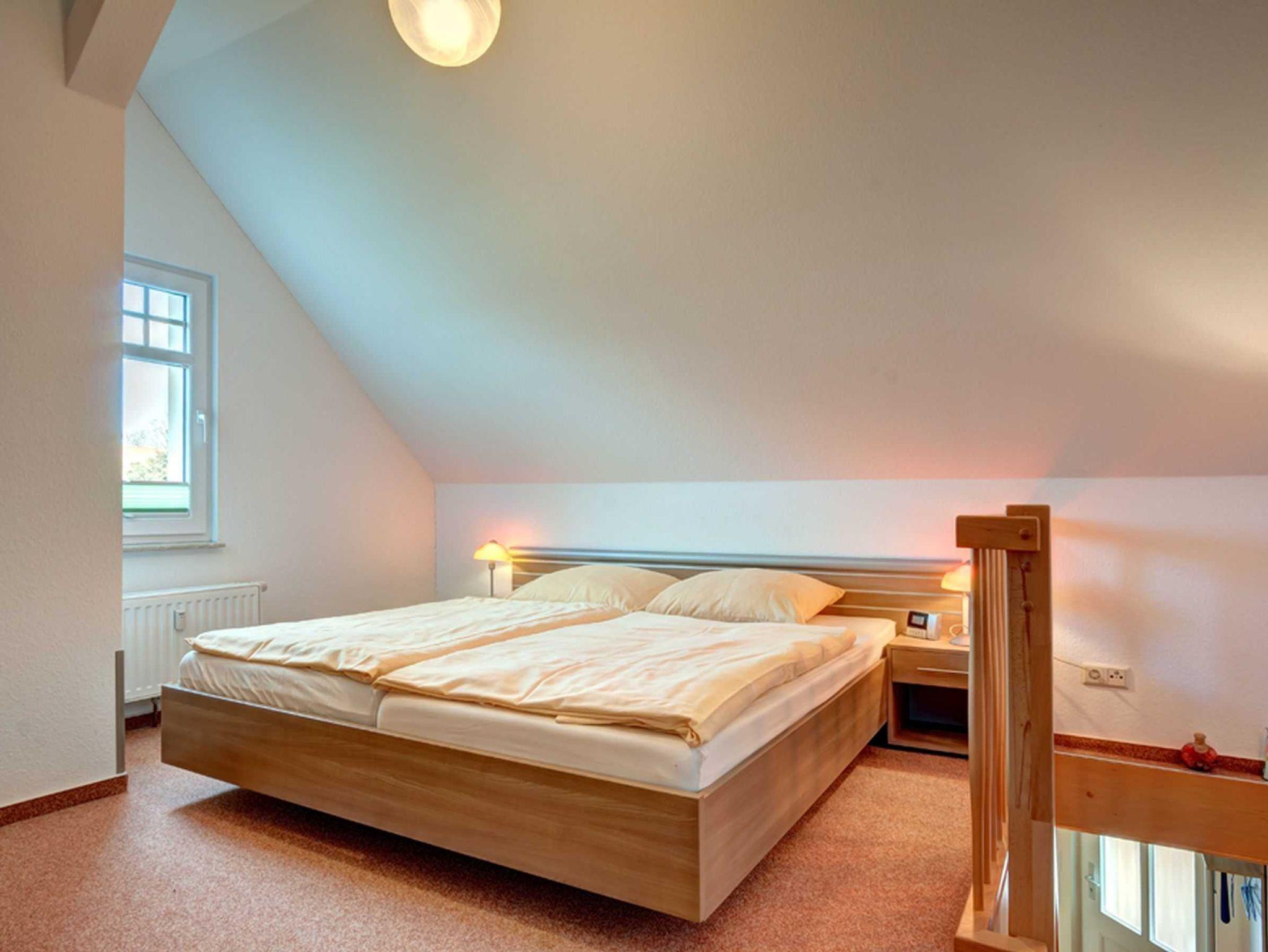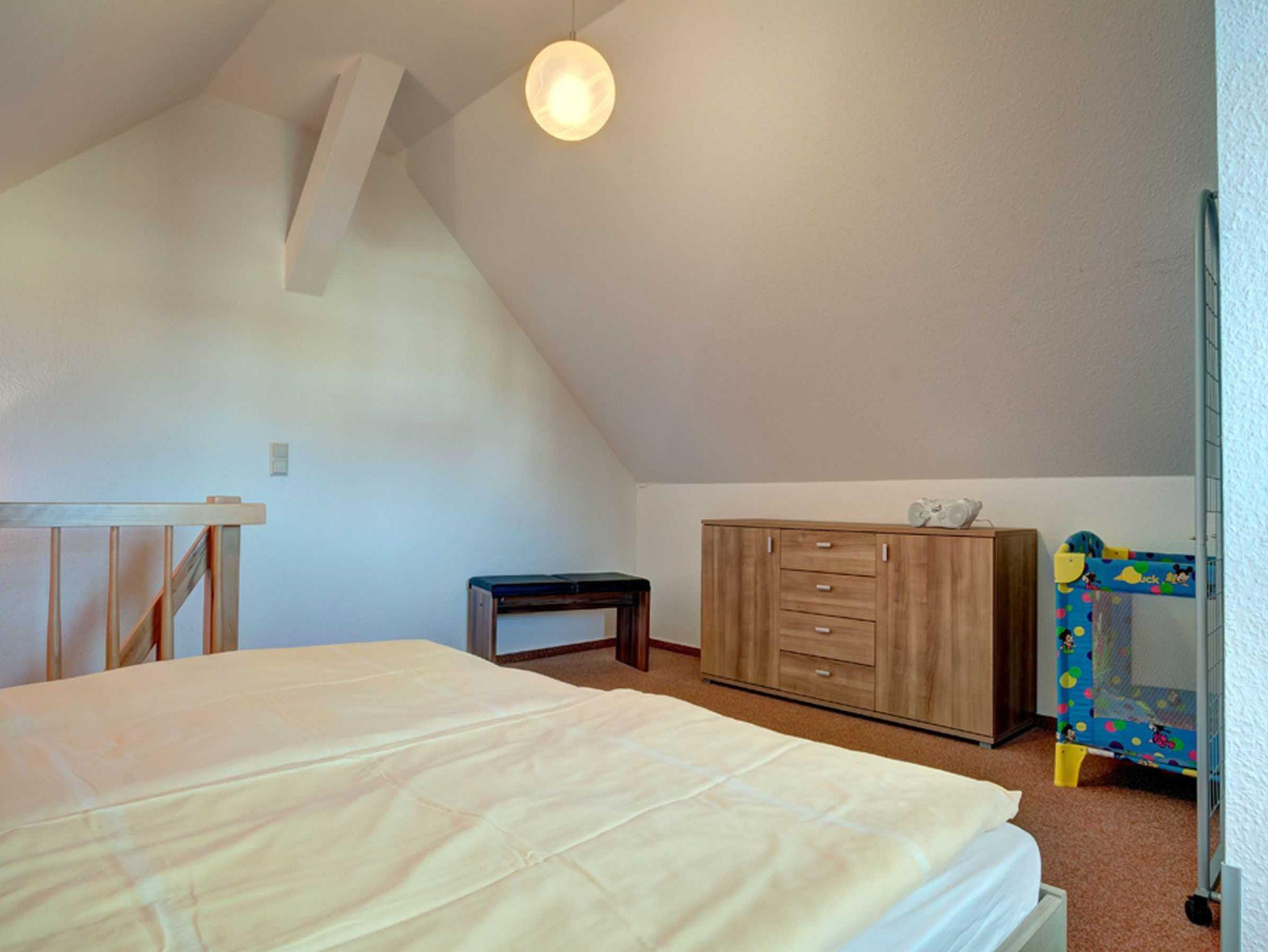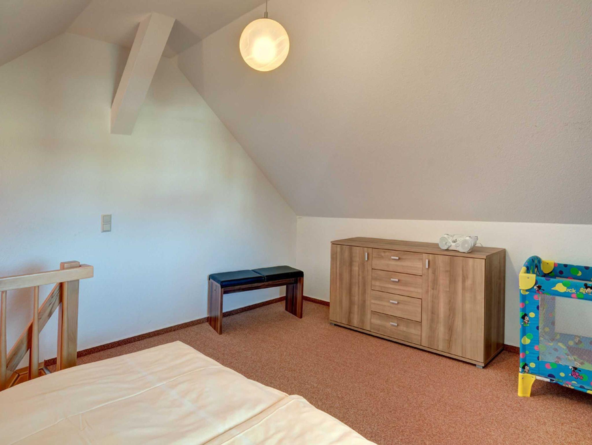 Das Schlafzimmer befindet sich im Dachgeschoss, erreichbar über eine Raumspartreppe. Hier stehen Ihnen ein großes Doppelbett mit 1,80 m breiter Liegefläche, sowie eine geräumige Kommode zur Verfügung.