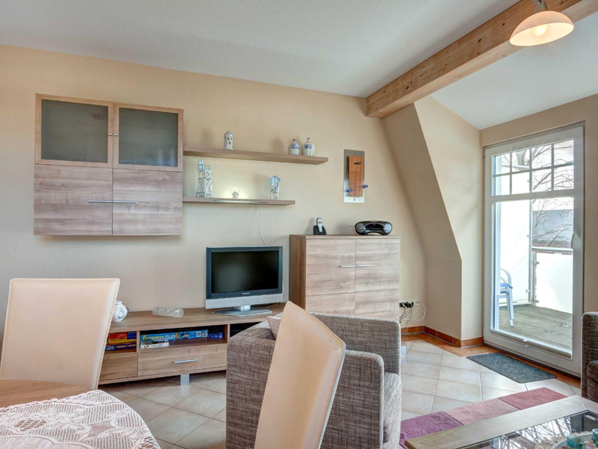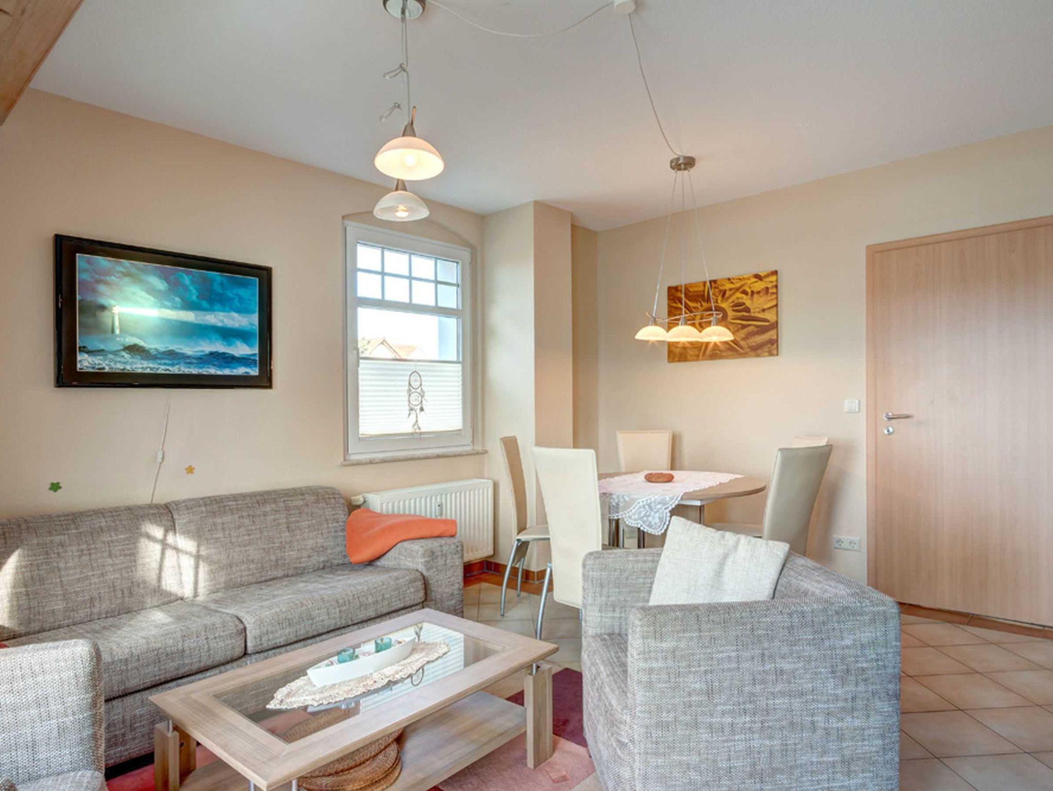 Für wohnliches Ambiente sorgen eine gemütliche Sitzecke ein moderne Schrankkombination, ein großer Flachbildfernseher, ein ausziehbarer Esstisch mit 6 Stühlen, ein DVD- Player, sowie ein CD-Radio. Das Wohnzimmer verfügt über eine Maxi-Sitzecke mit modernster Schlaffunktion, welche mit wenigen Handgriffen zu einem Doppelbett mit Kaltschaummatratze umfunktioniert werden kann.