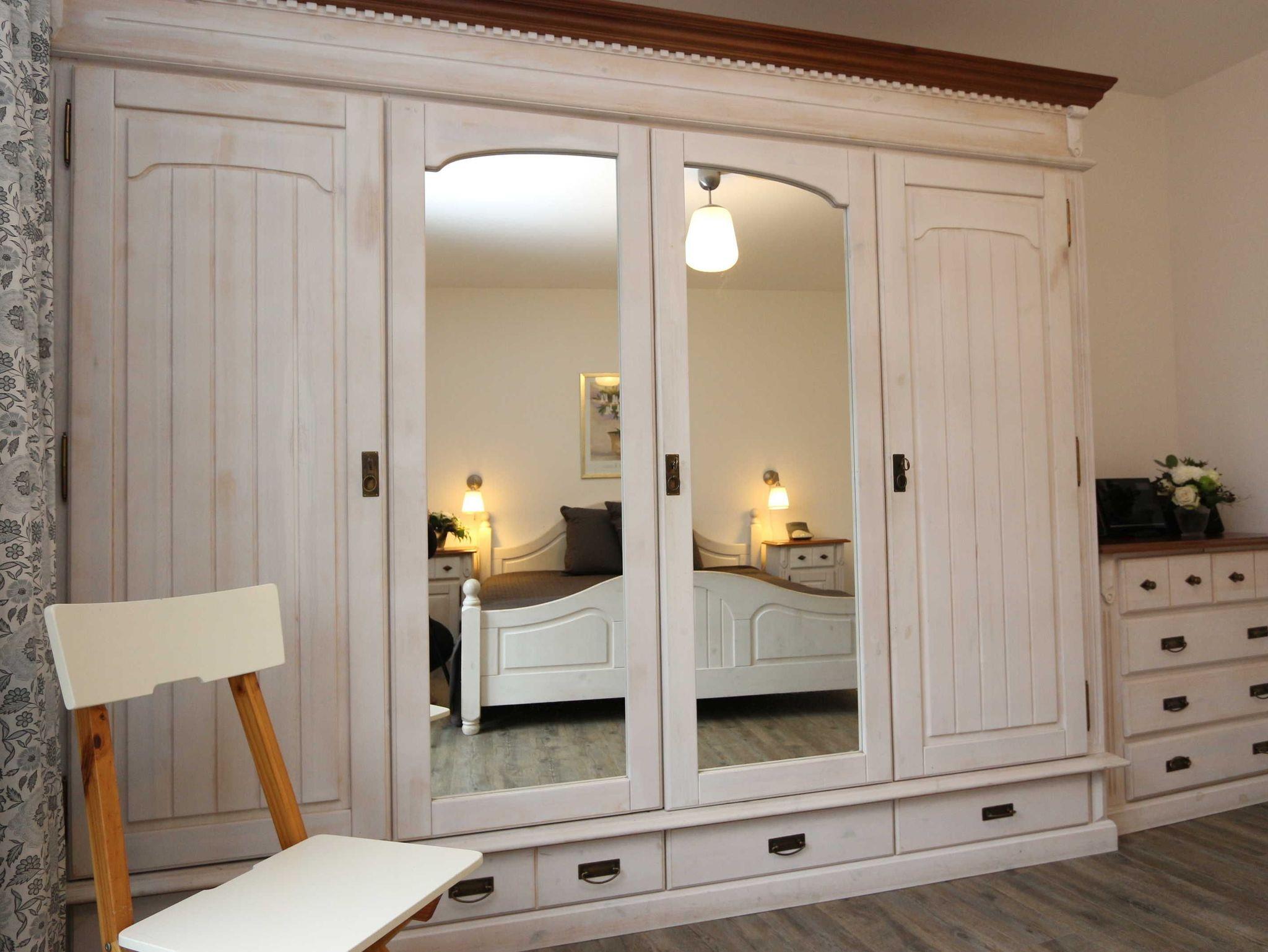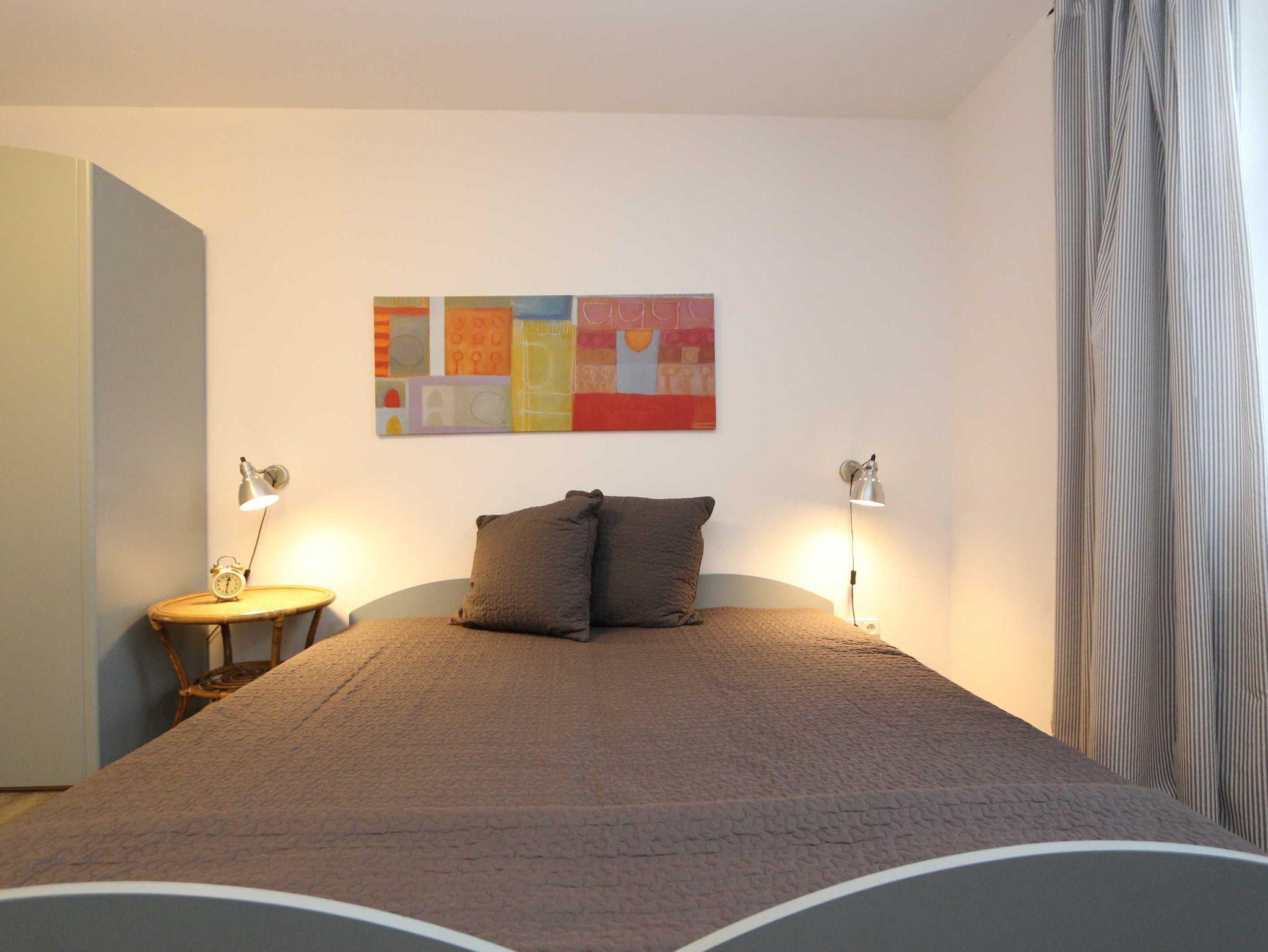 • Ein Schlafzimmer mit einem Doppelbett (ca. 1,80 x 2,00 m), einem großen Kleiderschrank, einer Komode und einer Musikanlage.