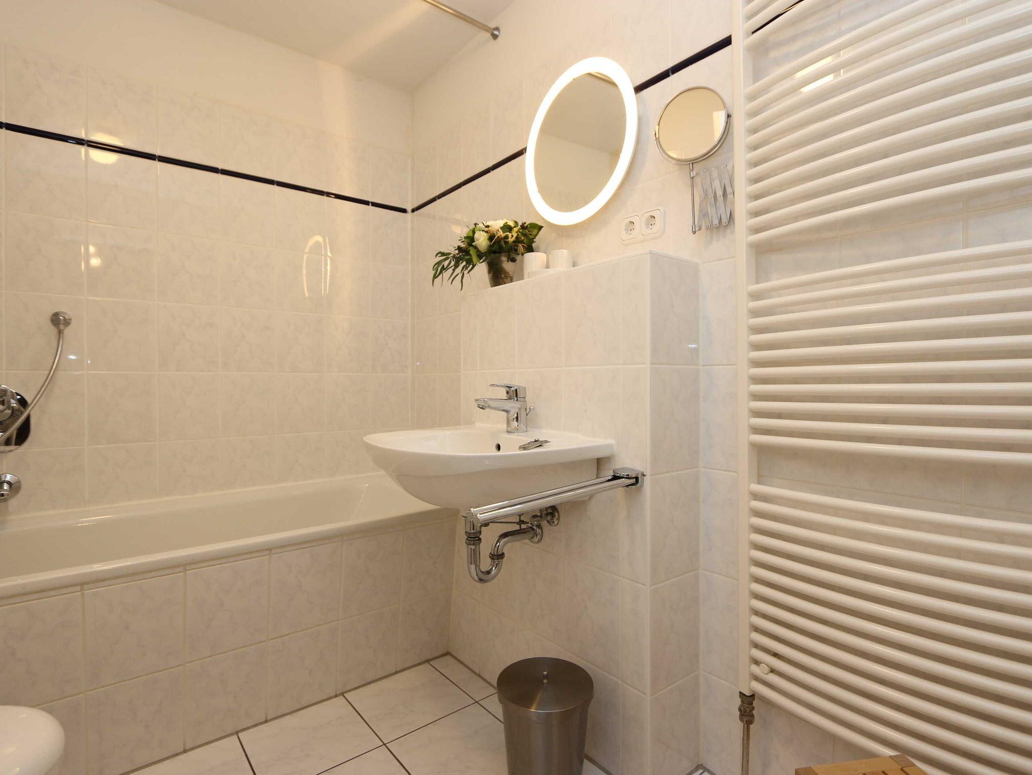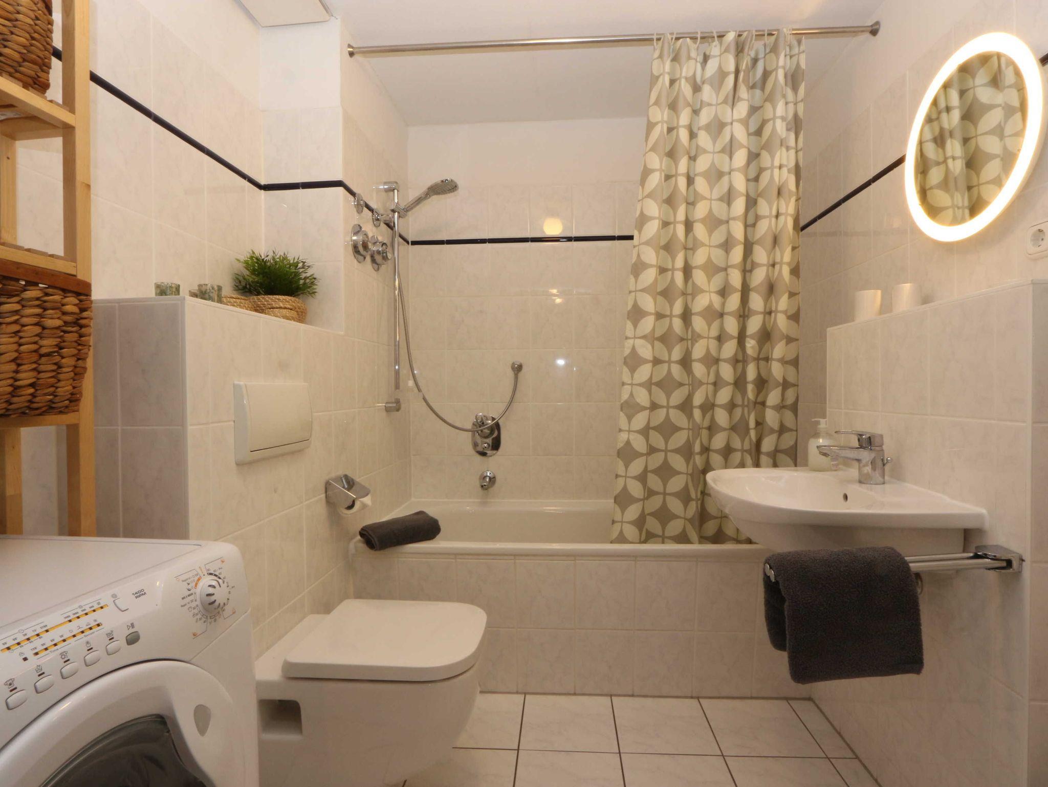 • Ein Badezimmer mit Badewanne, WC, Waschbecken, Handtuchtrockenheizkörper und Waschtrockner.