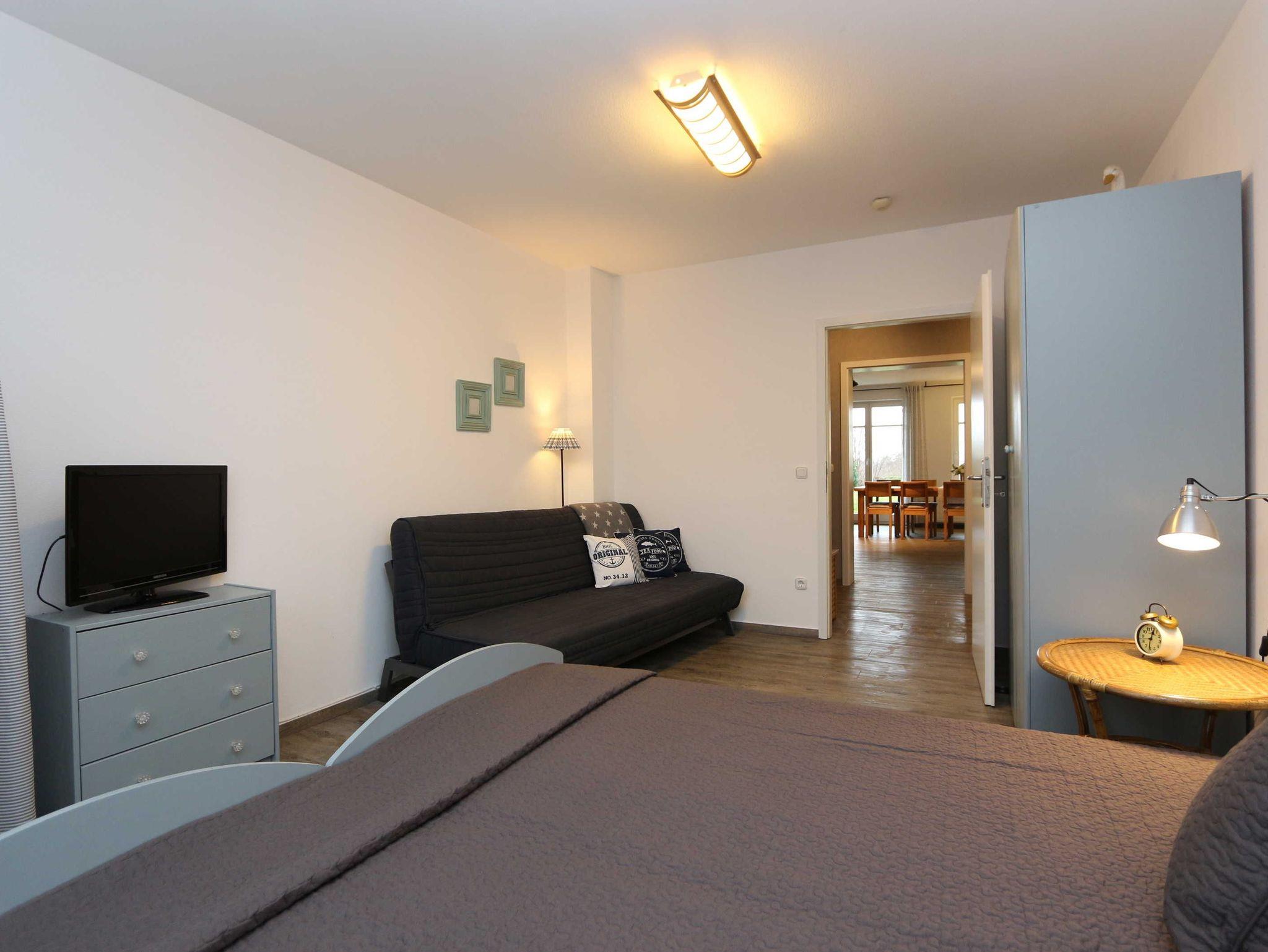 • Ein Kinderzimmer mit 2 zusammenstehenden Einzelbetten (ca. 0,9 x 2,00 m), einem Schlafsofa (ca. 1,20 x 2,00 m), einem Kleiderschrank, einer Komode und einem Flachbild-Fernseher.