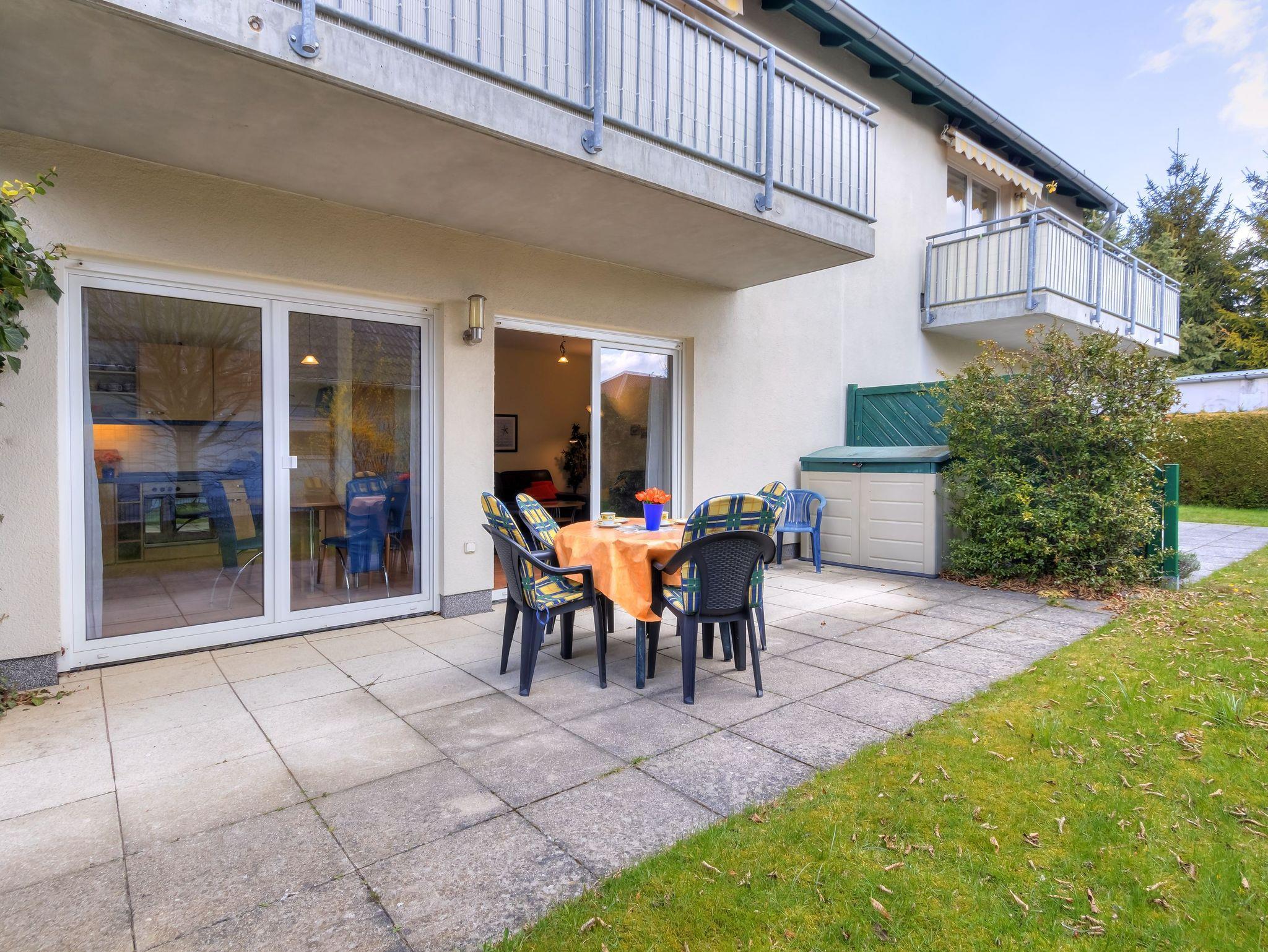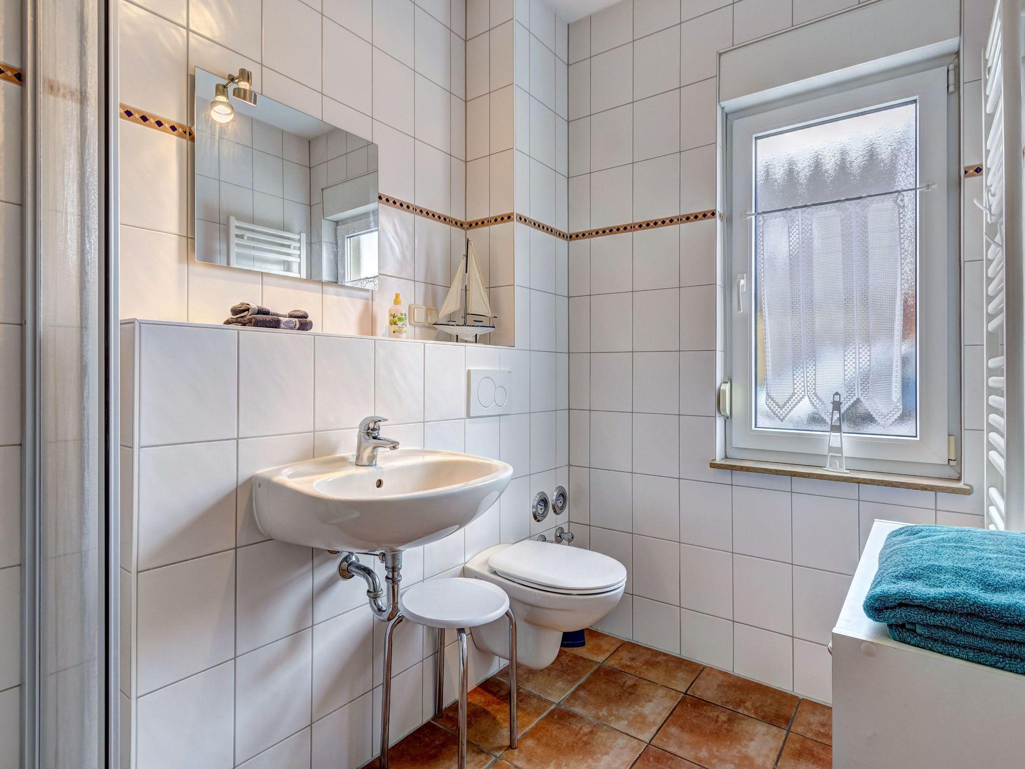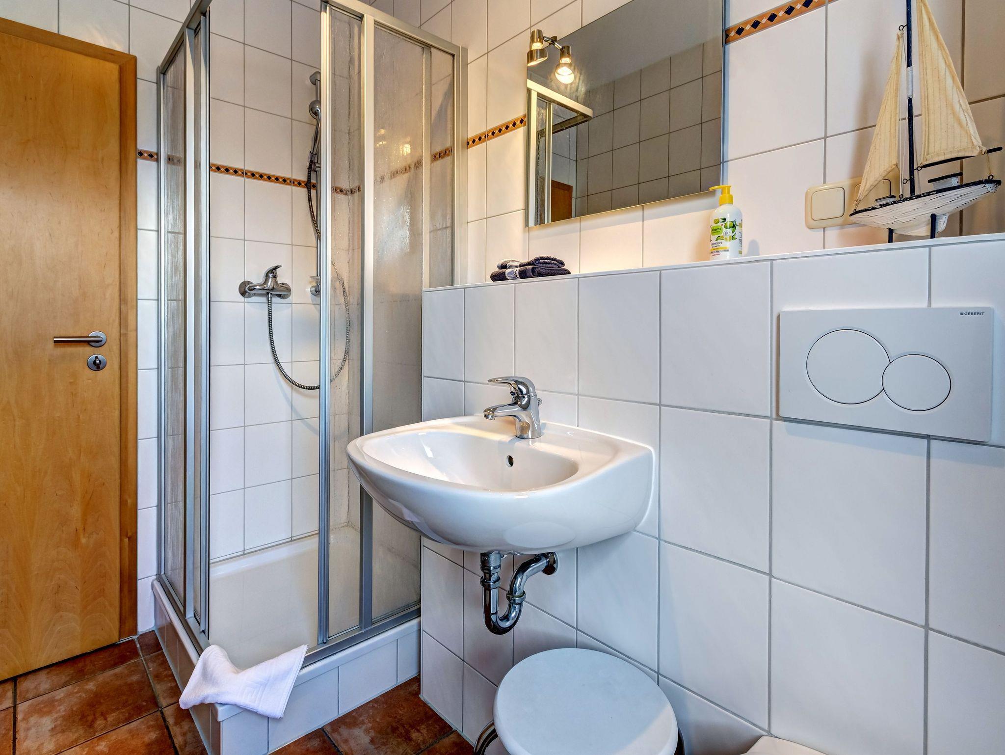Das Badezimmer ist mit Dusche und WC ausgestattet. Zur Fewo geöhrt eine Terrasse mit Gartenmöbeln.