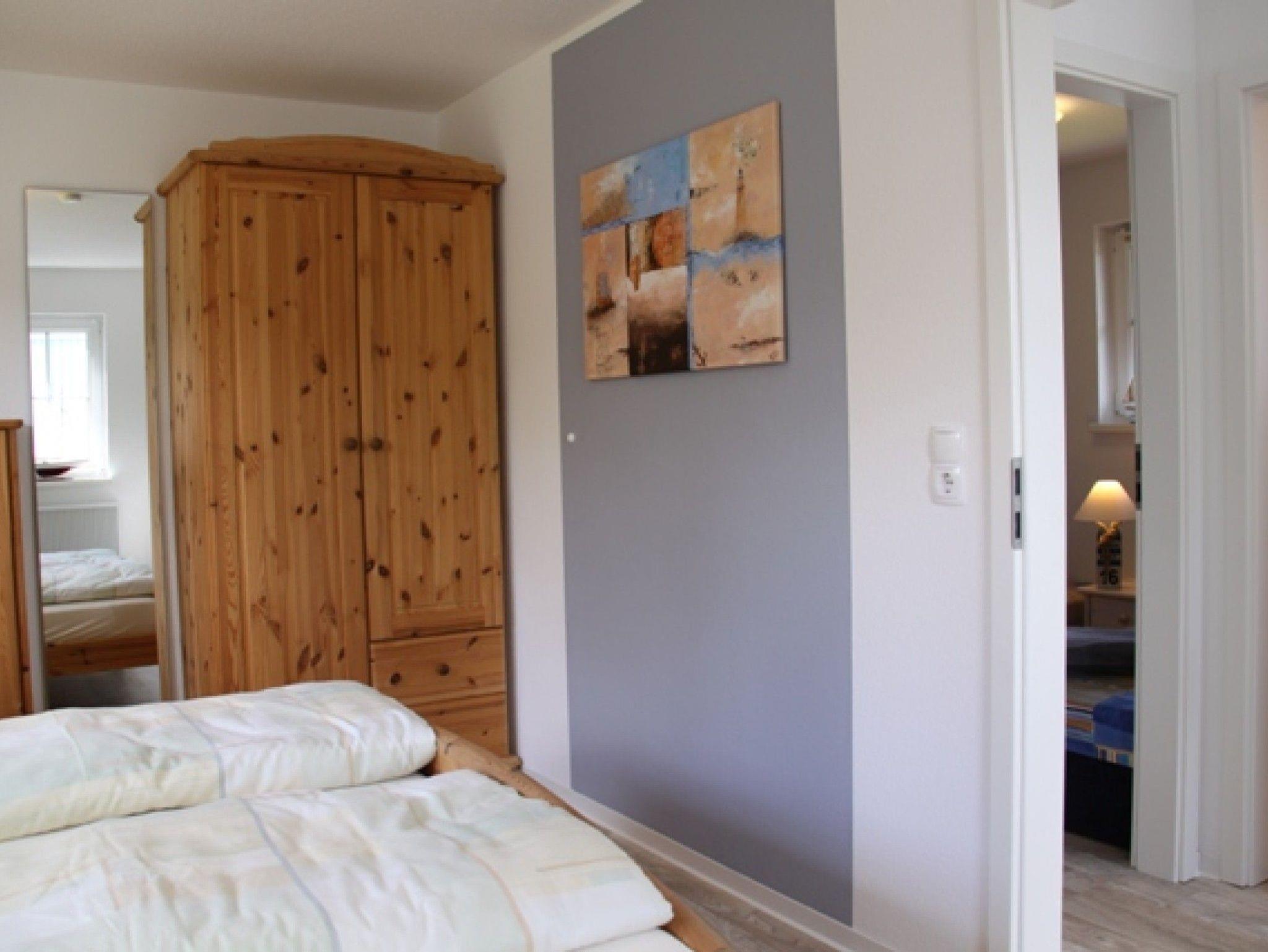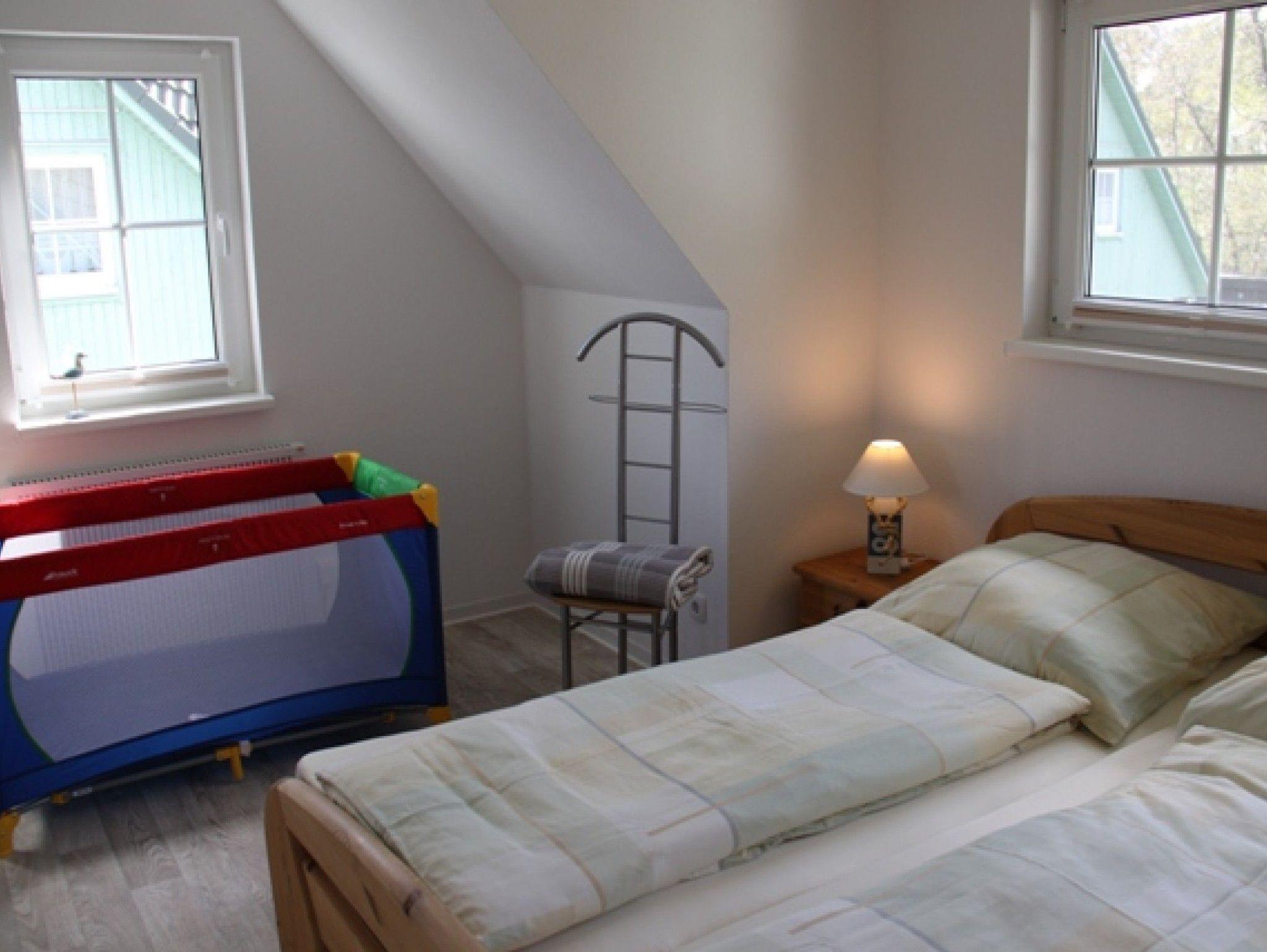 1 Schlafzimmer mit Doppelbett und Schrank sowie Kinderreisebett