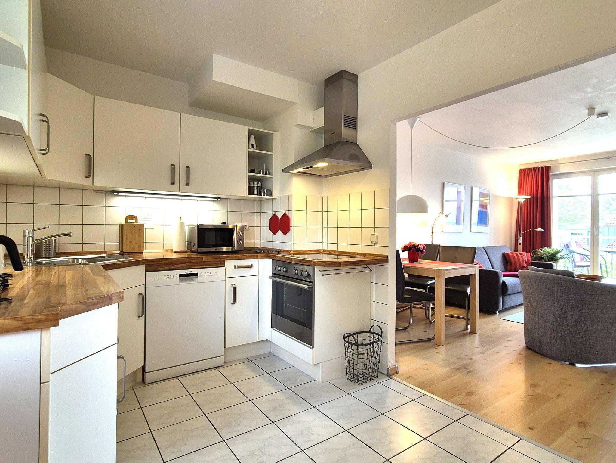 Ferienwohnung (Nr. 12) für bis zu 4 Personen (ca. 56 m²) im 1.OG mit Wohn- und Esszimmer mit offener Küche, 1 Schlafzimmer, 1 Bad und 1 überdachter Balkon.