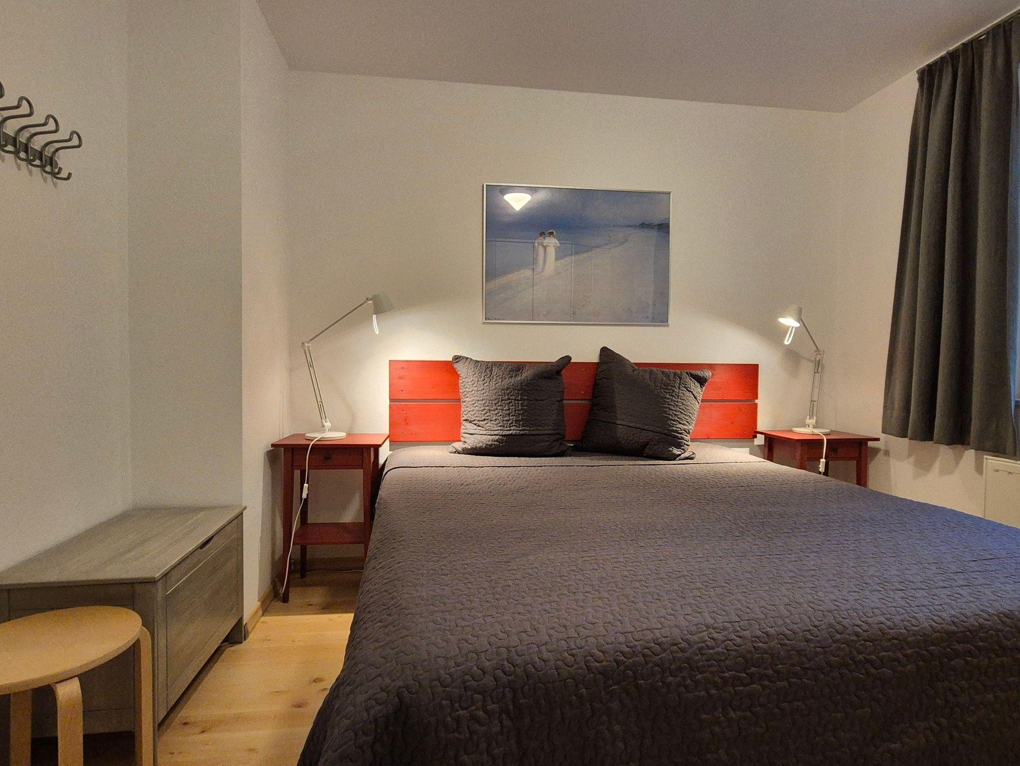 • Schlafzimmer mit Doppelbett (Liegefläche 1,80 x 2,00 cm), einem Kleiderschrank, zwei Nachtischen mit Nachtischlampen, zwei Hockern, zwei Garderoben und einem großen Spiegel.