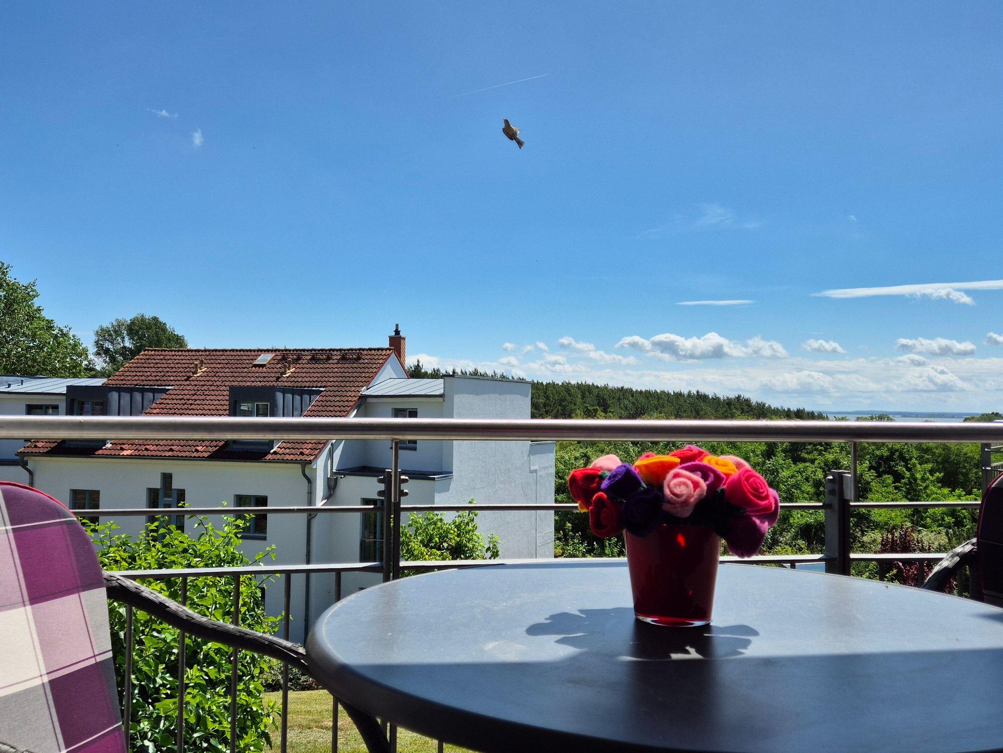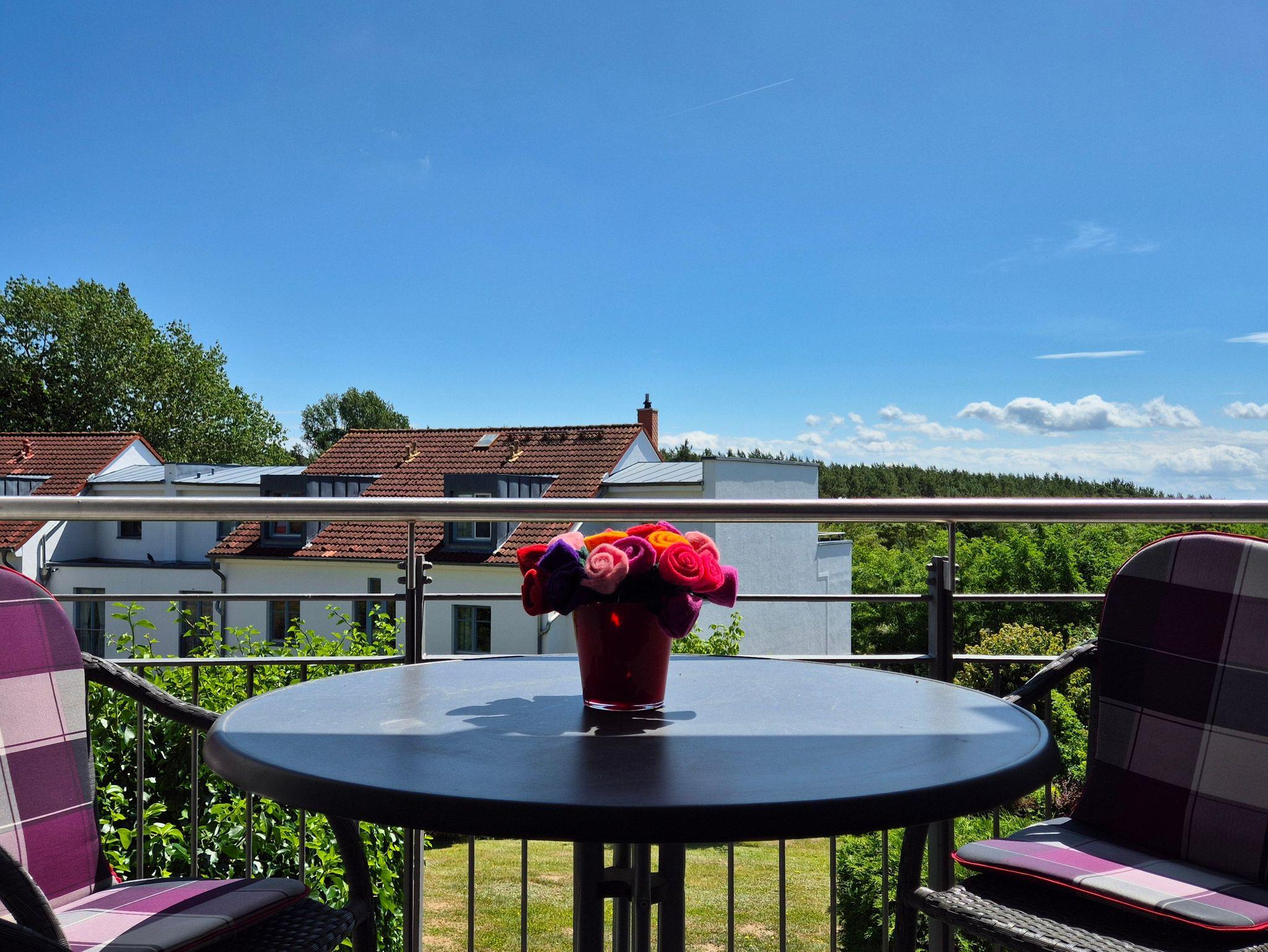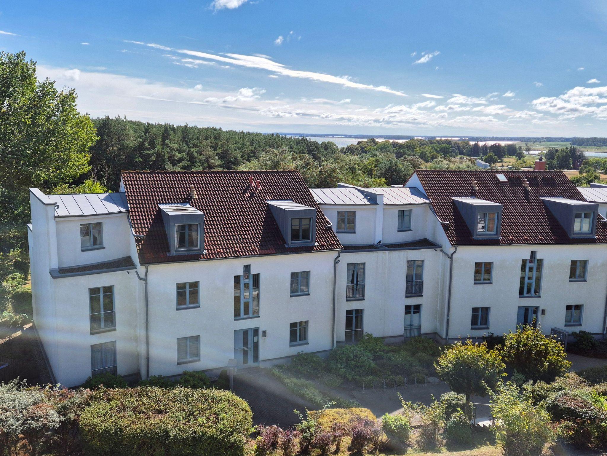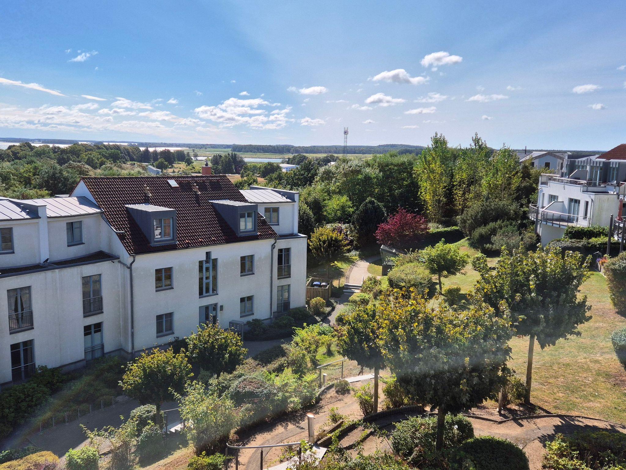 Diese 2-Zimmer-Ferienwohnung (Wohnung 12) befindet sich im 1. Obergeschoß in der Residenz Bellevue in 17454 Zinnowitz, Heimweg 8 und bietet einen schönen Blicke auf das Umfeld und die Landschaft, mit Wald und Achterwasser.