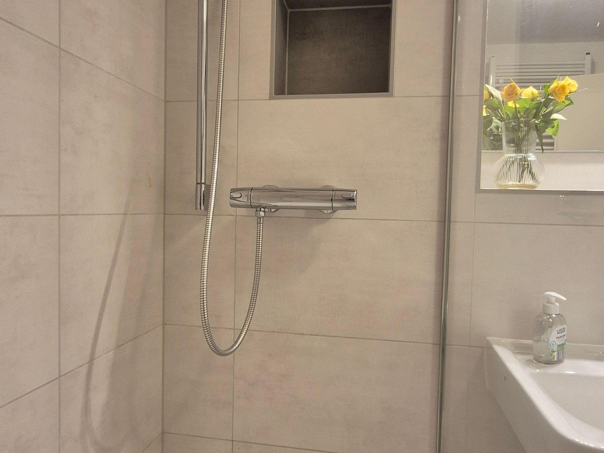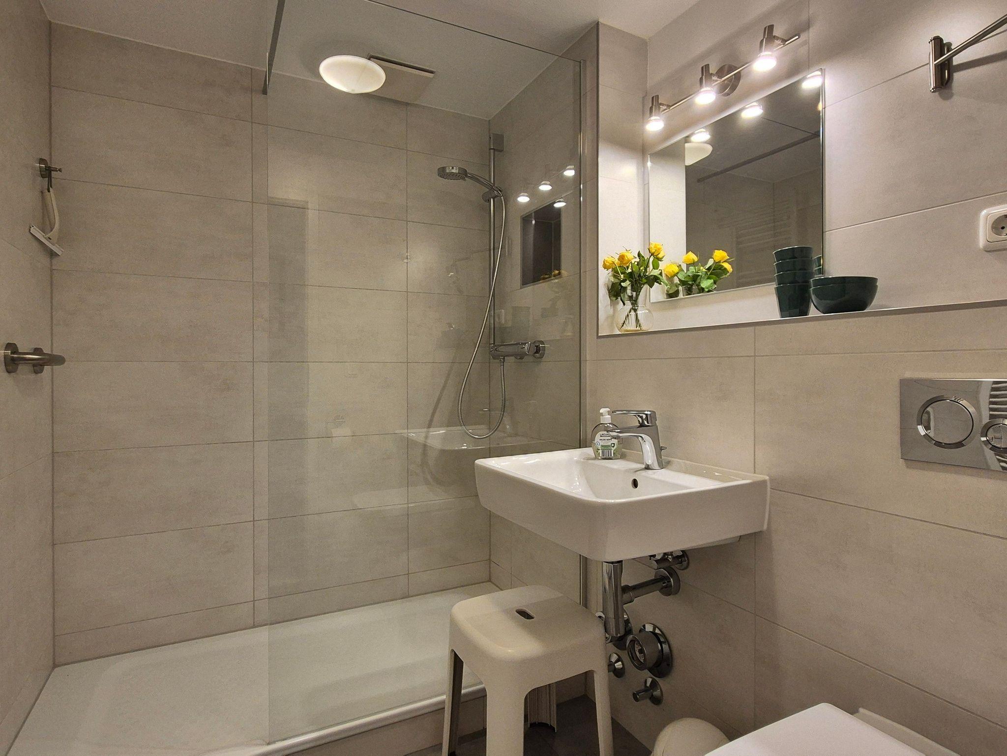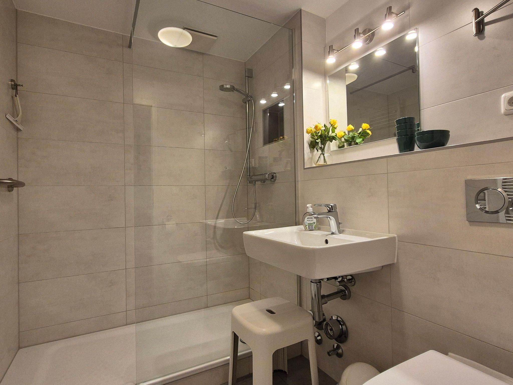 • Badezimmer (renoviert) mit großer ebenerdiger (Walk In Dusche) Dusche, einem Waschbecken, einem Spiegel, einem Kosmetikspiegel und einem WC.