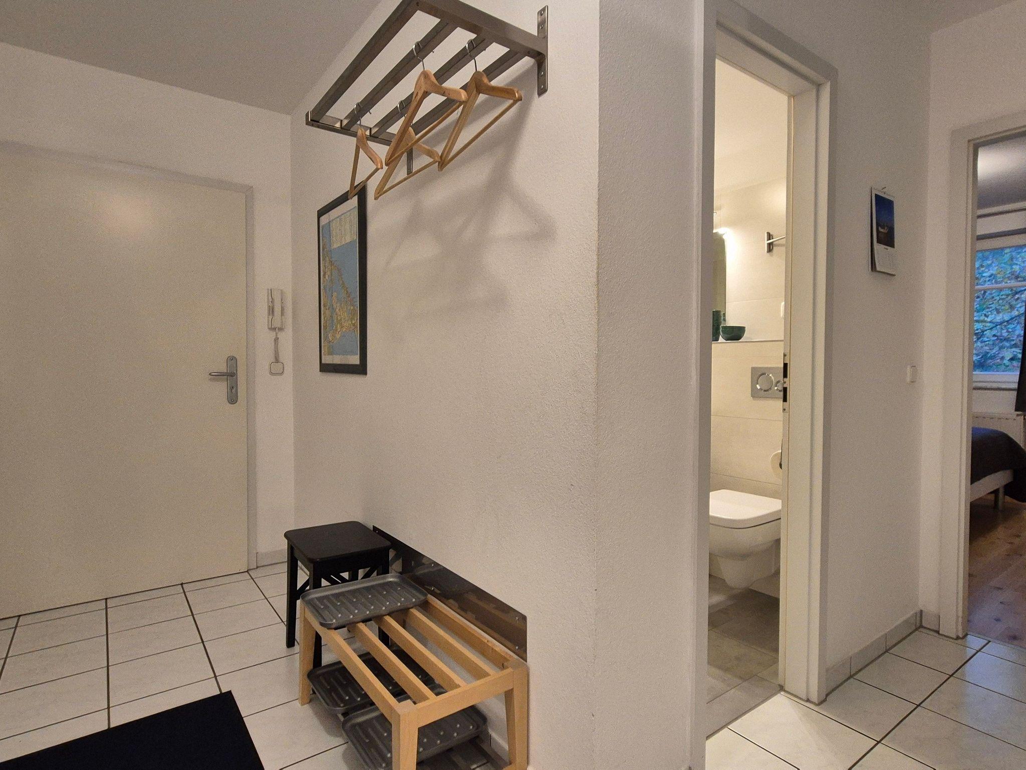 • Der Flur ist ausgestattet mit einer Garderobe, einem Spiegel und einer Ablage.