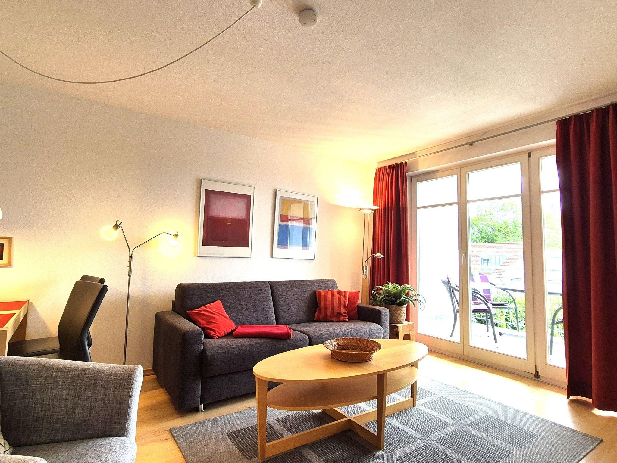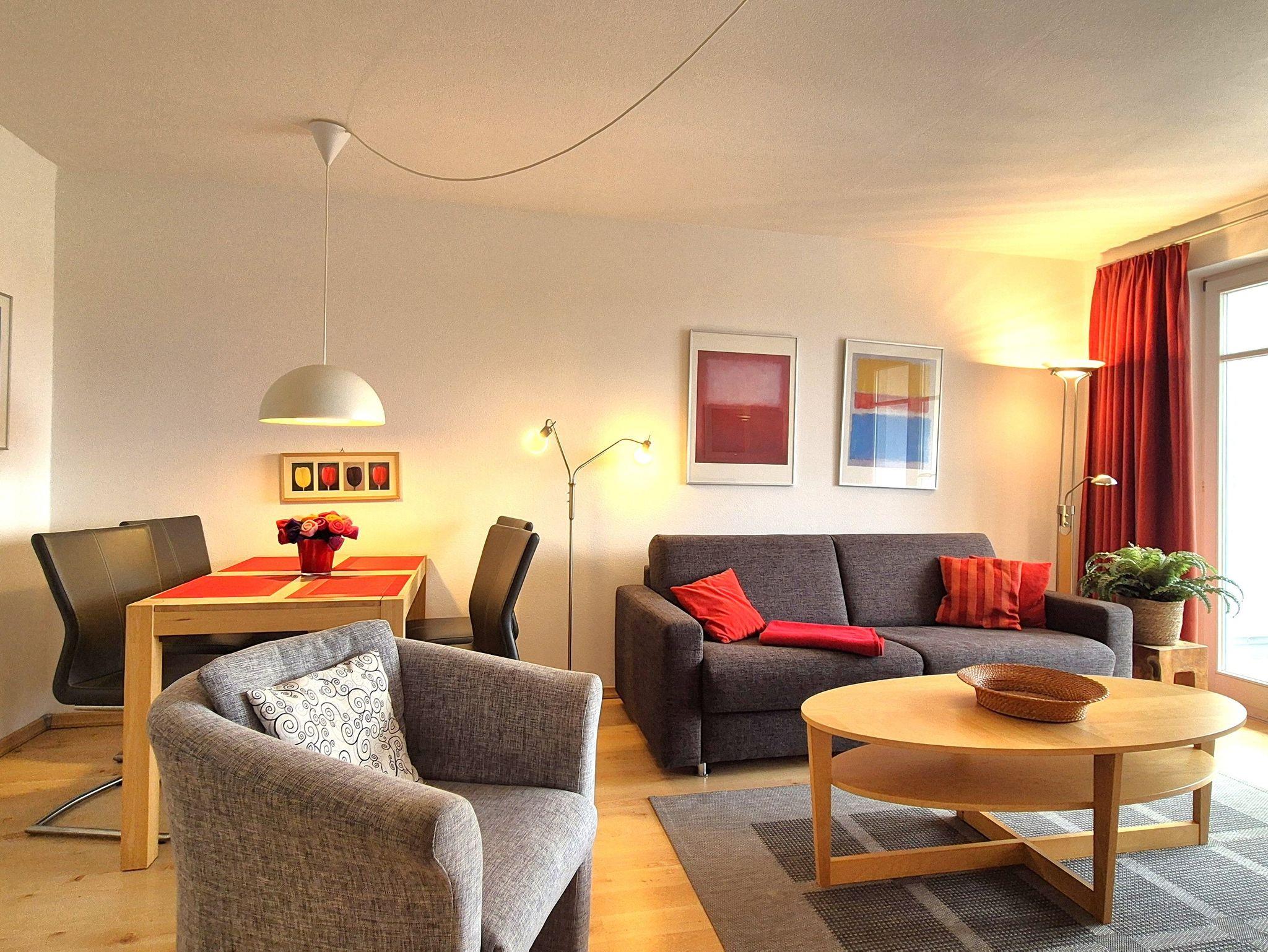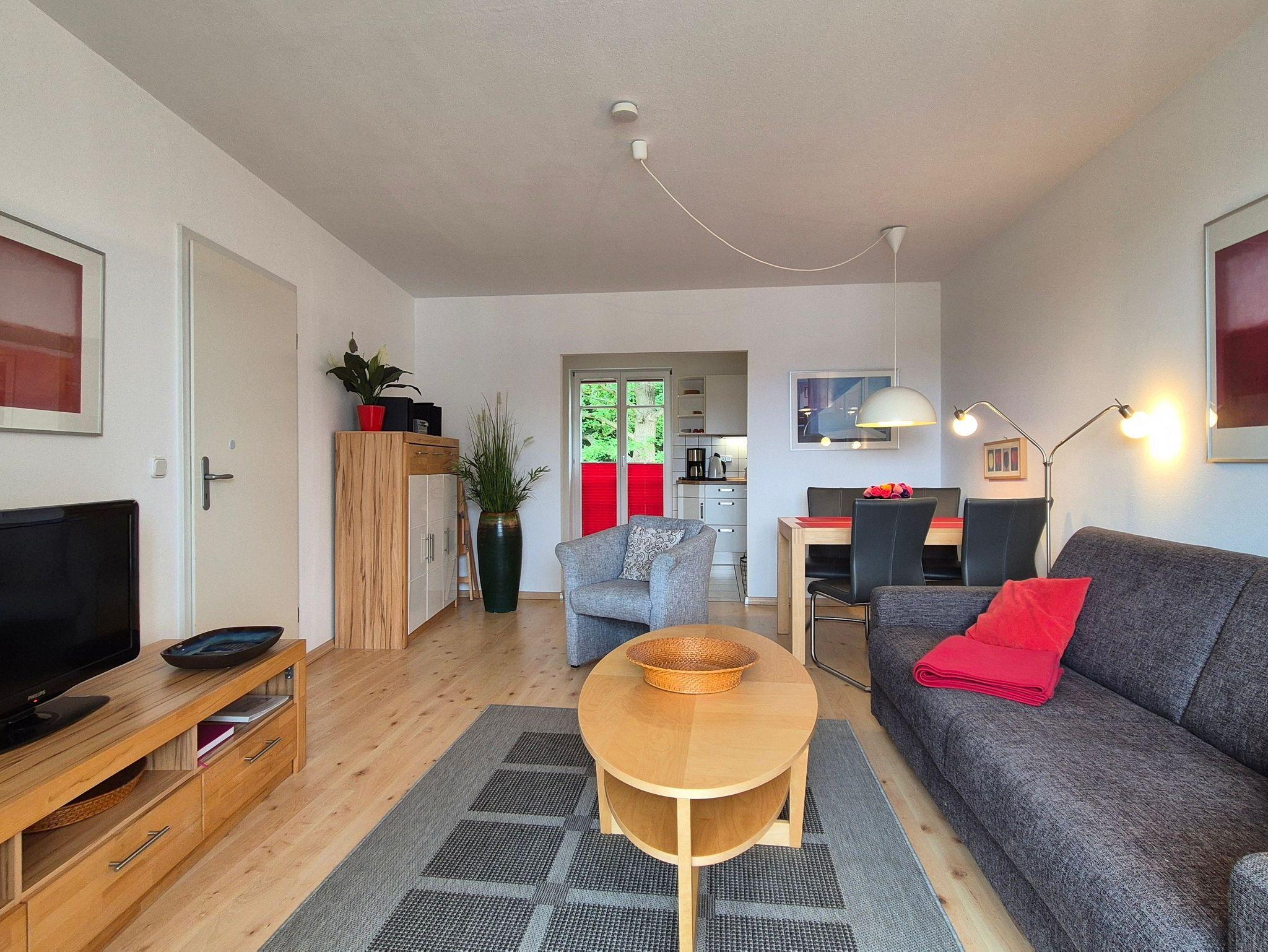 • Wohn- und Esszimmer eingerichtet mit einem hochwertigem bequemen Schlafsofa (Liegefläche 1,60 x 2,00 cm), einem modernem Sessel, einem Couchtisch, einer Kommode sowie ein Esstisch mit vier Stühlen und einem Hochschrank.