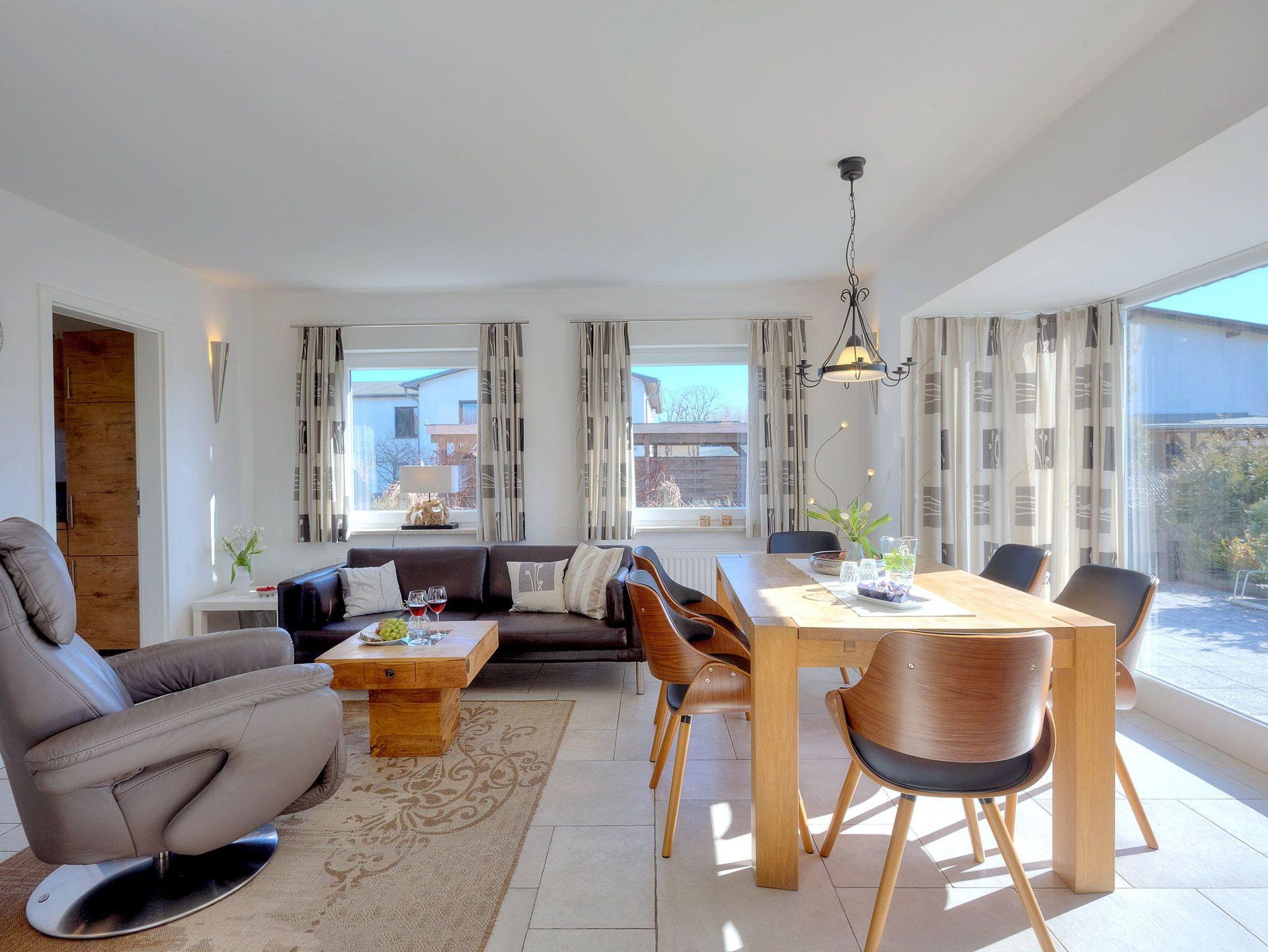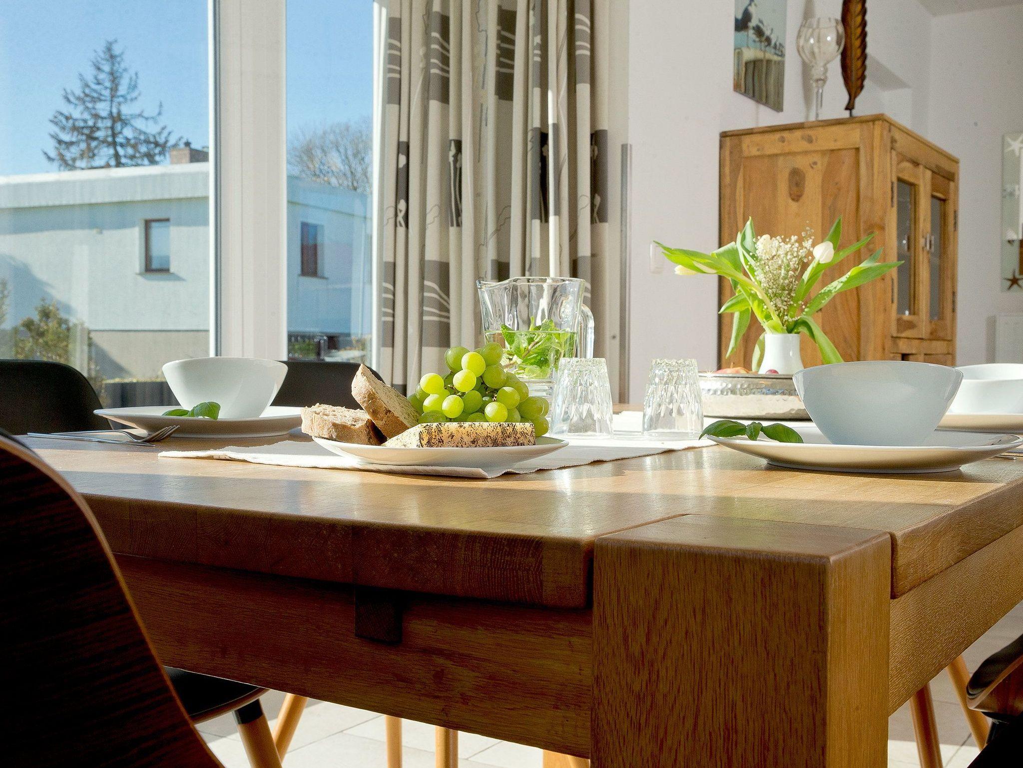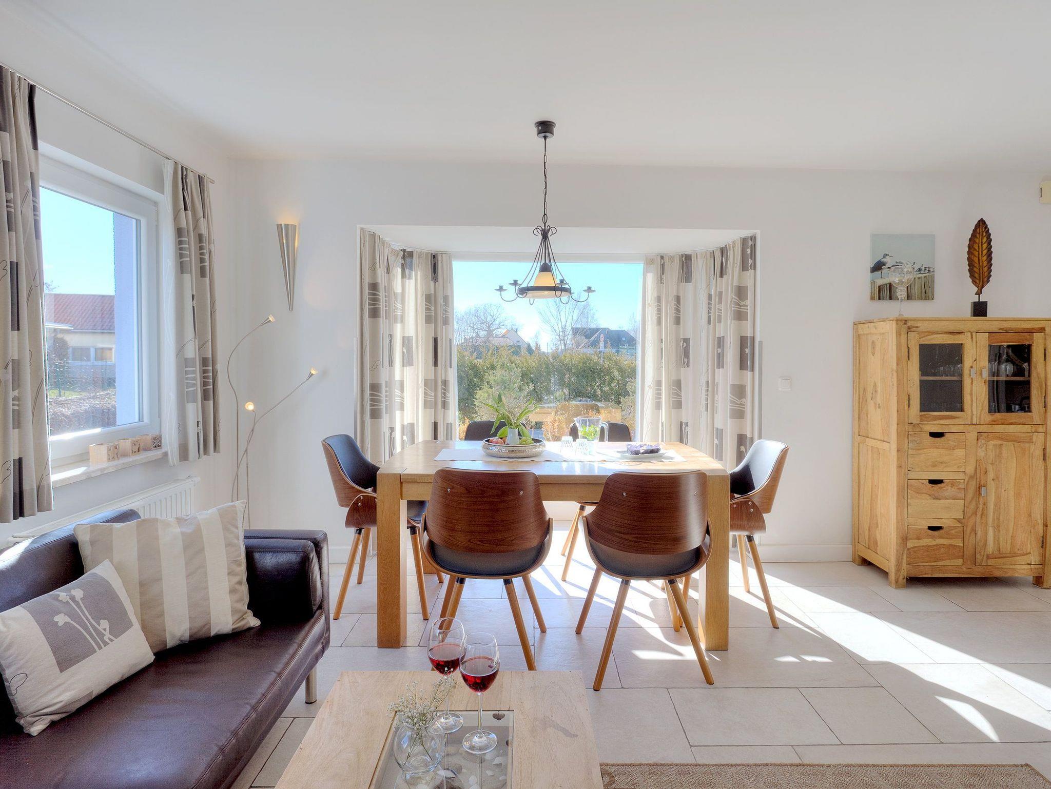 Im Erdgeschoss erwartet Sie ein lichtdurchfluteter Wohn- und Essbereich mit gemütlicher Couch, Flat-TV, Kamin und großem Esstisch ? der ideale Treffpunkt für gemeinsame Stunden. Von hier aus gelangen Sie direkt auf die Südterrasse, ein wunderbarer Platz zum Entspannen, Spielen oder für ein Frühstück an der frischen Ostseeluft.