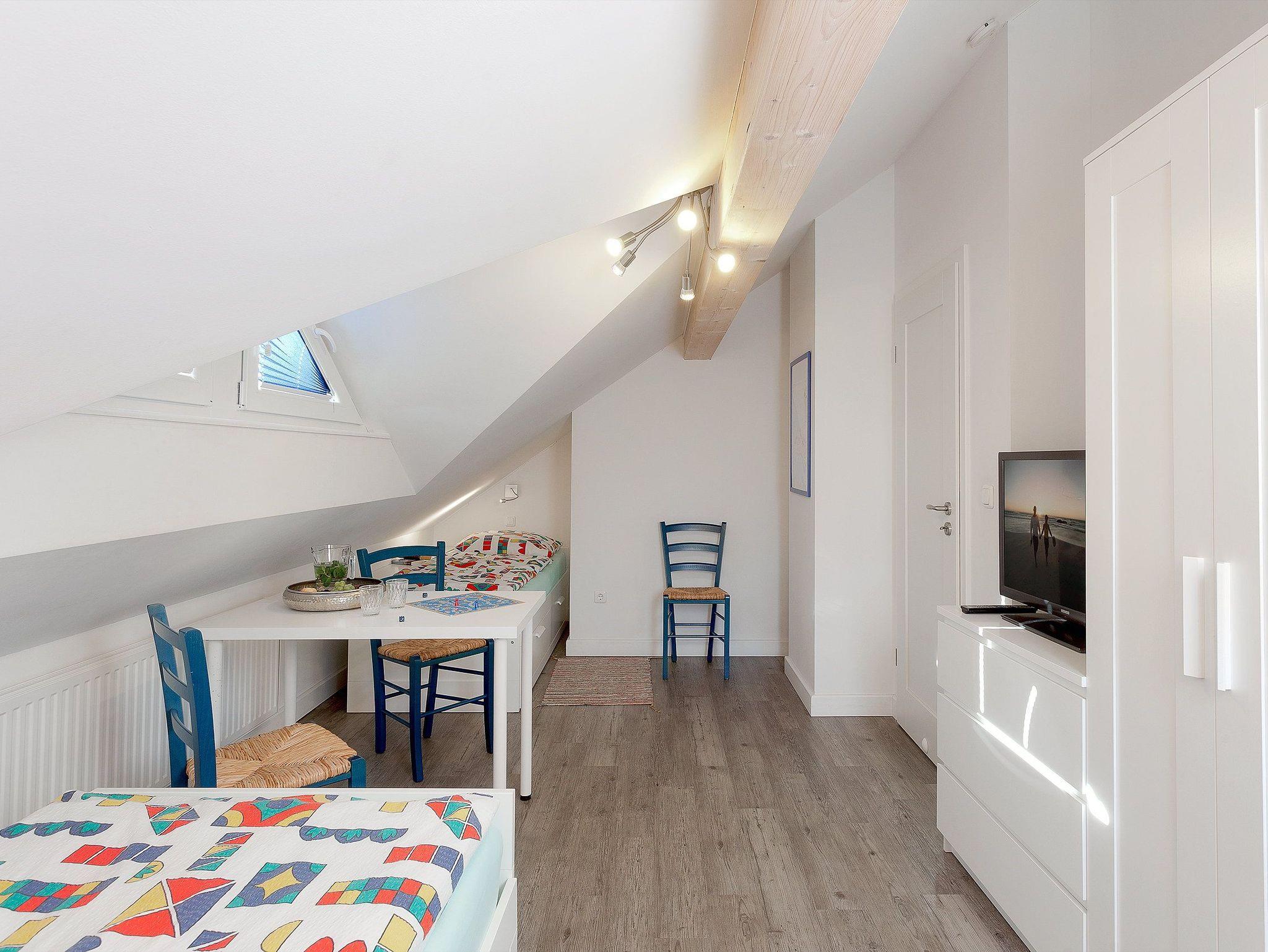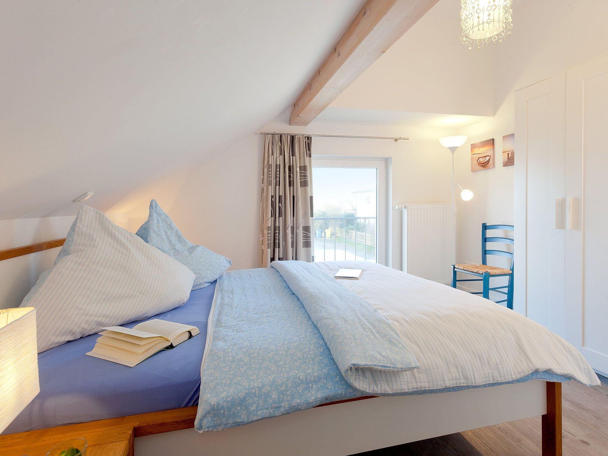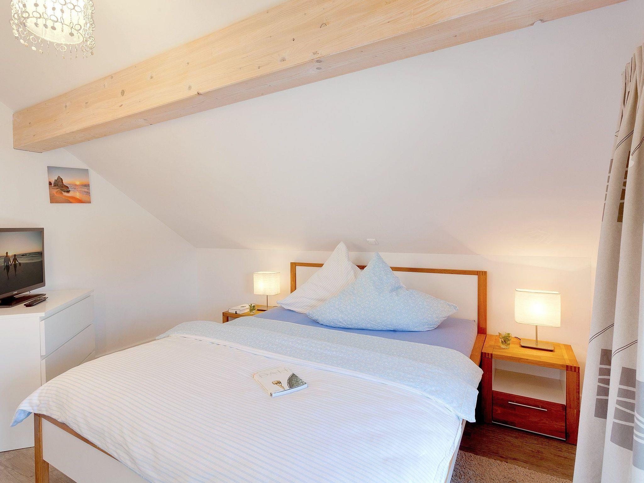 Im Obergeschoss befinden sich zwei weitere Schlafzimmer sowie ein Badezimmer mit Badewanne. Beide Schlafzimmer verfügen über einen Flat-TV. Während eines der Zimmer mit einem Doppelbett (160 × 200 cm) ausgestattet ist, bietet das zweite Schlafzimmer zwei Einzelbetten (je 80 × 200 cm), einen Schreibtisch und ausreichend Stauraum ideal als Kinder-, Spiel- oder Jugendzimmer. Eine Kleinkindausstattung mit Babyreisebett und Hochstuhl kann bei Bedarf kostenfrei hinzugebucht werden.