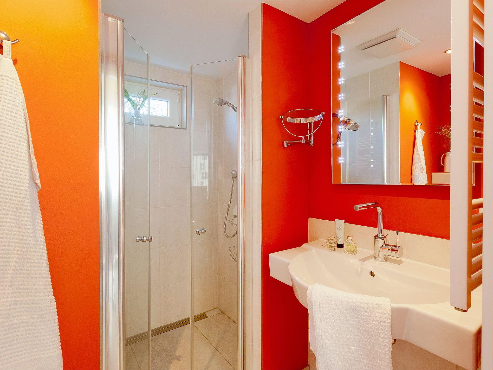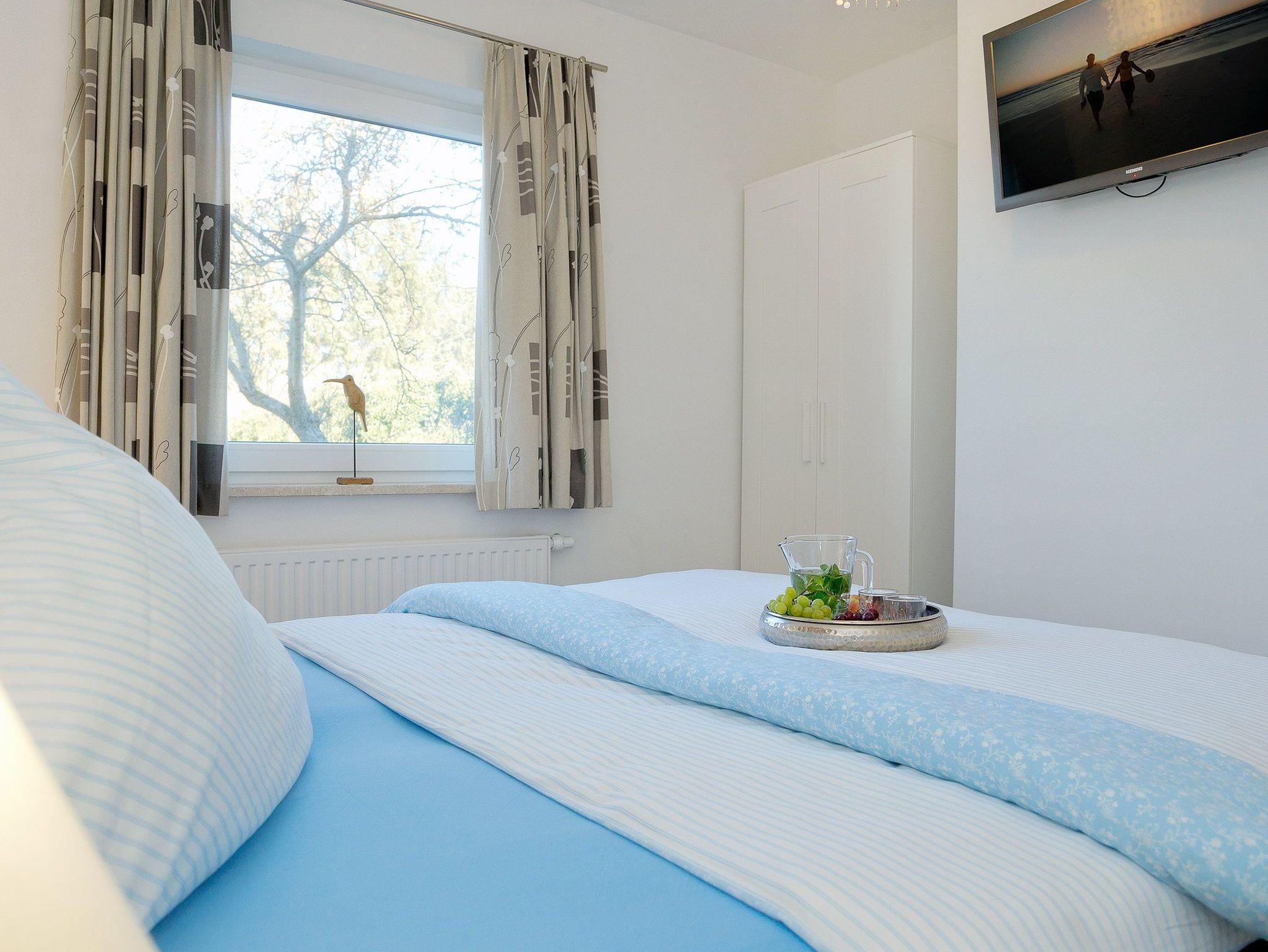 Ein Schlafzimmer mit Doppelbett (160 × 200 cm) und Flat-TV sowie ein Badezimmer mit Dusche, WC und Haartrockner komplettieren das Erdgeschoss.