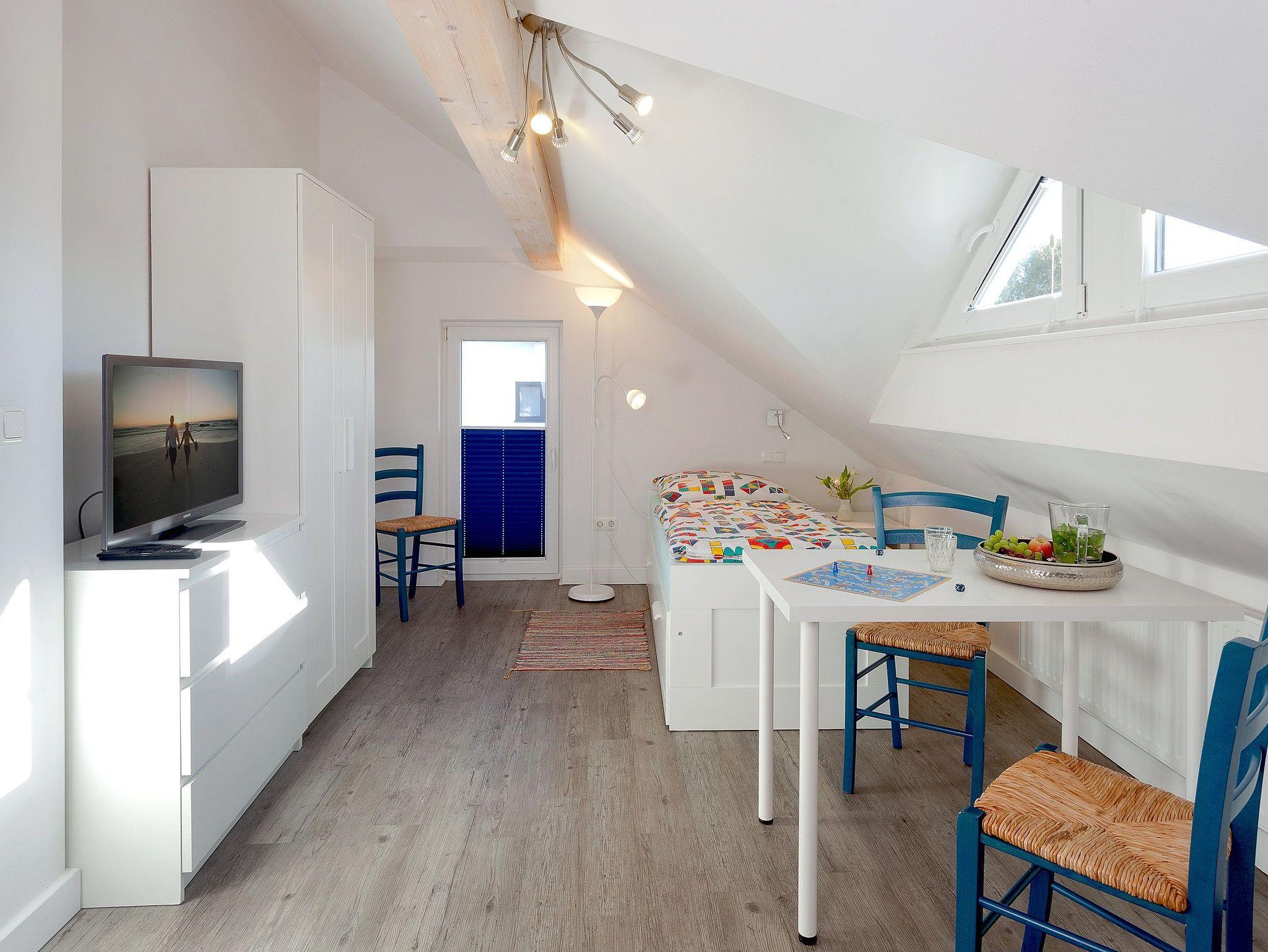 Im Obergeschoss befinden sich zwei weitere Schlafzimmer sowie ein Badezimmer mit Badewanne. Beide Schlafzimmer verfügen über einen Flat-TV. Während eines der Zimmer mit einem Doppelbett (160 × 200 cm) ausgestattet ist, bietet das zweite Schlafzimmer zwei Einzelbetten (je 80 × 200 cm), einen Schreibtisch und ausreichend Stauraum ? ideal als Kinder-, Spiel- oder Jugendzimmer. Eine Kleinkindausstattung mit Babyreisebett und Hochstuhl kann bei Bedarf kostenfrei hinzugebucht werden.
