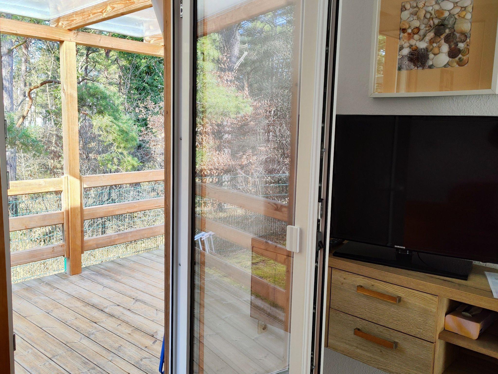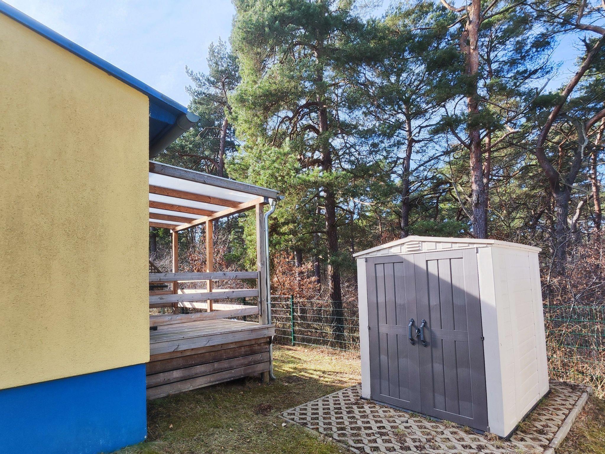 Die 10qm große überdachte Terrasse, umgeben von Kiefern in einer ruhigen Ferienanlage, lädt zum Relaxen und Verweilen ein. Hier können Sie die Natur genießen und den Alltag hinter sich lassen. Gartenmöbel stehen selbstverständlich für Sie bereit.