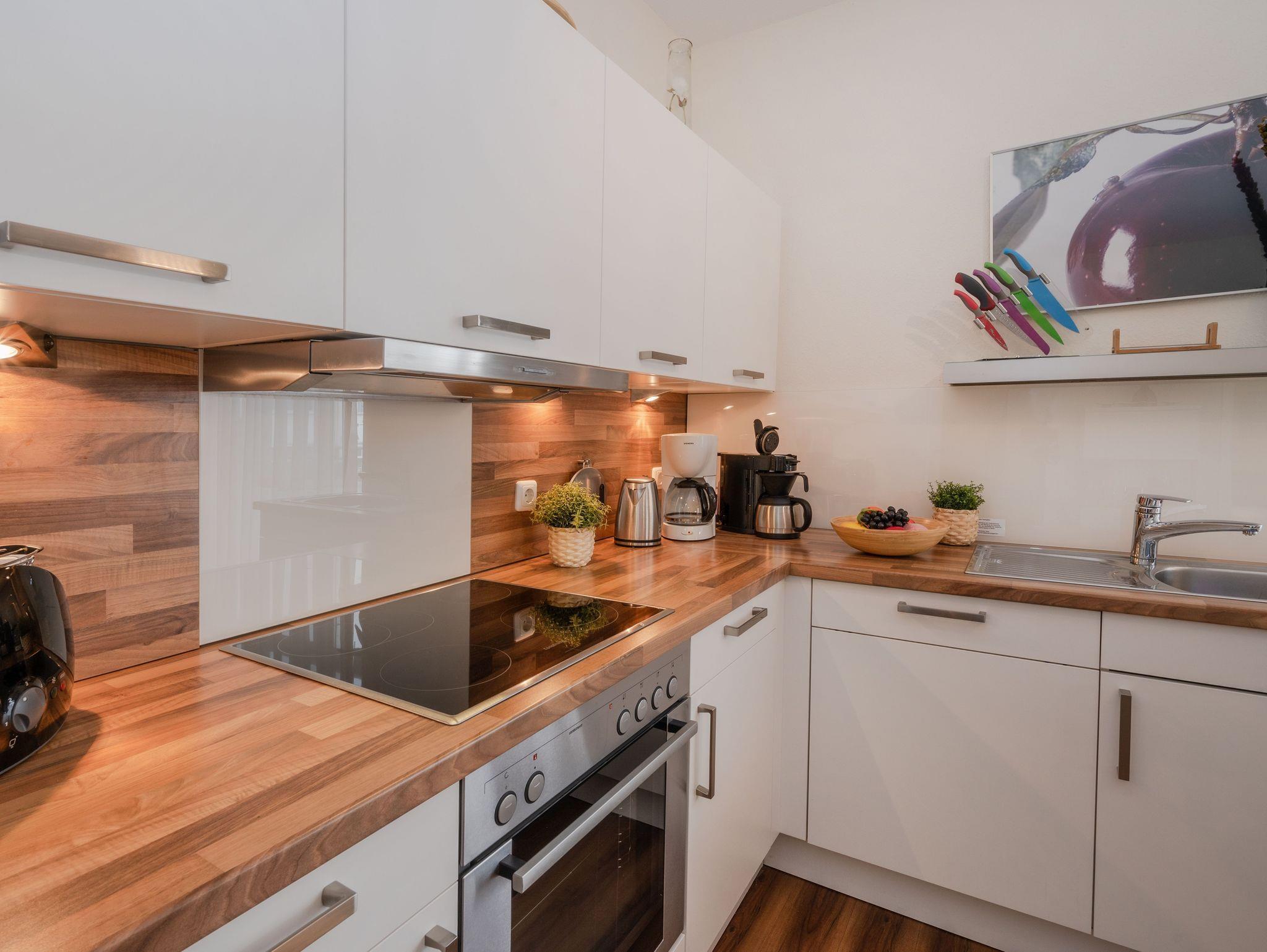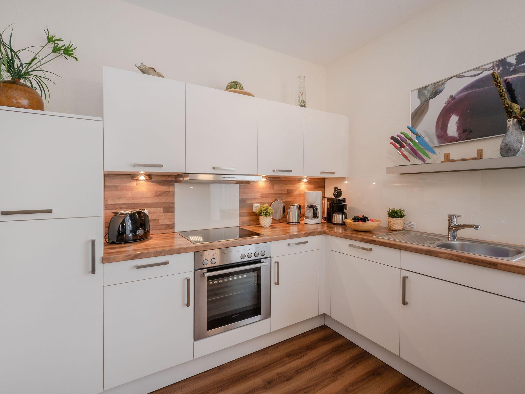 Die hier angrenzende Küchenzeile ist mit einem Kühlschrank mit Gefrierfach, einem Geschirrspüler und einem Backofen mit Cerankochfeld ausgestattet. Eine Kaffeemaschine, ein Toaster und ein Wasserkocher stehen Ihnen hier selbstverständlich zur Verfügung.