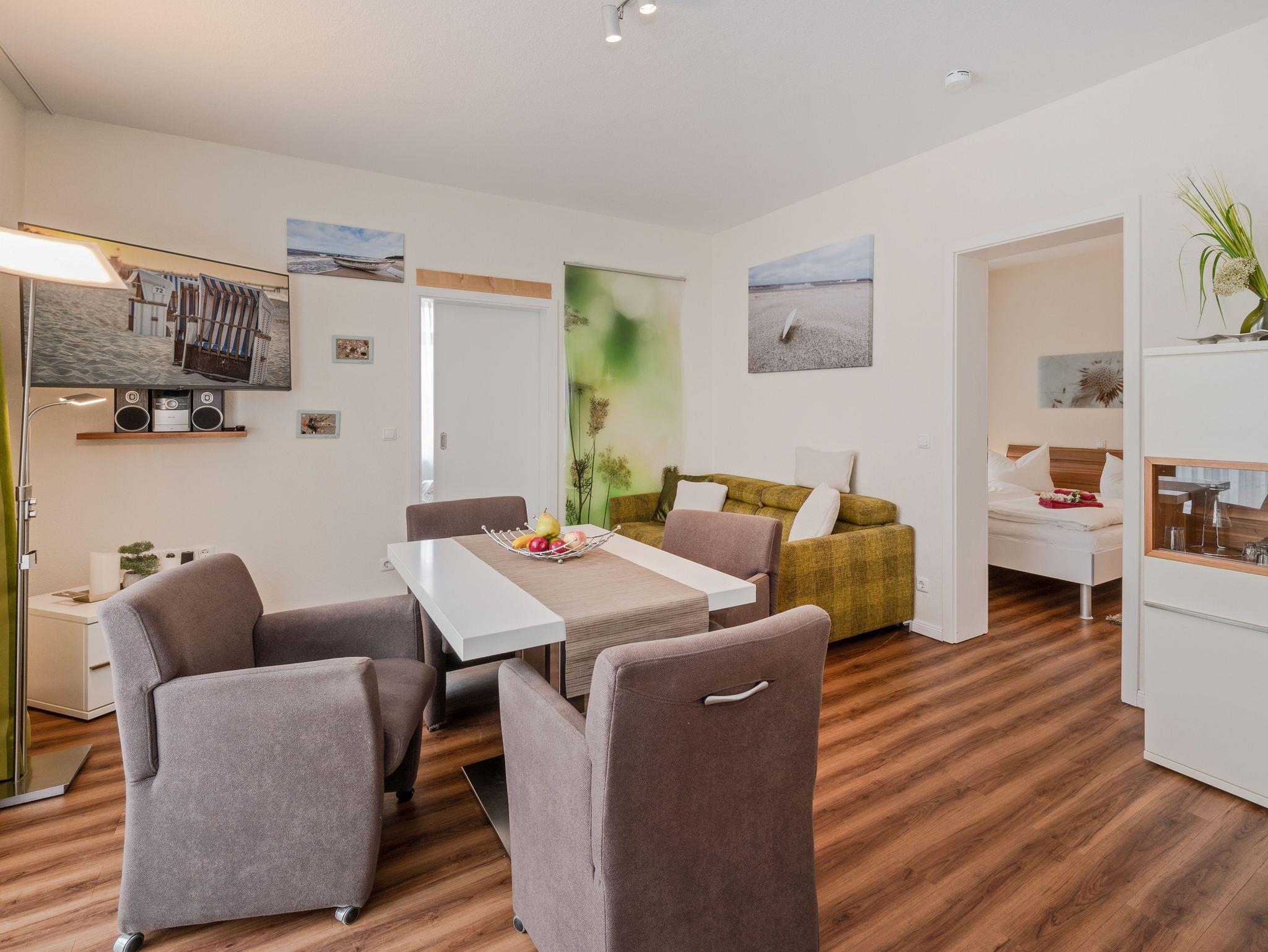 Im gemütlichen Wohnbereich laden bequeme Sessel, ein Schlafsofa und ein Flachbildfernseher zu geselligen Abenden ein. Der Essbereich ist im Wohnbereich integriert und bietet 4 Personen ausreichend Platz zum gemeinsamen Essen.