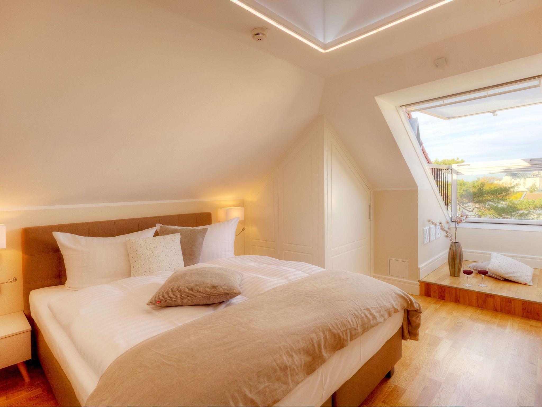 Nun haben Sie den höchsten Punkt der Villa erreicht. Genießen Sie den atemberaubenden Fernblick über Zinnowitzs Dächer bis hin zum Meer. Lassen Sie hier den Abend bei einem gemütlichen Glas Wein ausklingen und fühlen sich wie Gott auf Usedom. Für die wohlige Wärme zu jeder Jahreszeit sorgen Fußbodenheizung und Klimaanlage.