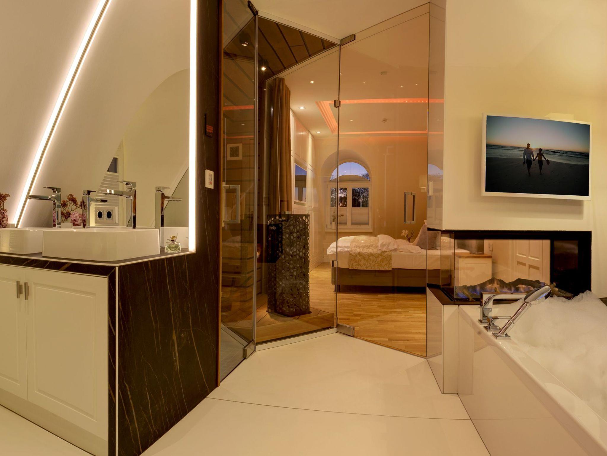 Das erste von vier Schlafzimmern mit Master-Bathroom ist ein Meisterwerk unseres Stylistenteams: Es wartet nicht nur mit einem der vier hochwertigen Boxspringbetten (200x200 cm) auf, sondern überzeugt ebenso mit einem Gaskamin und einer finnischen Sauna. In der Badewanne genießen Sie entweder das Flammenspiel des Gaskamins oder die TV Serie Ihrer Wahl. Komplettiert wird das Badezimmer mit einem Doppelwaschtisch, einer ebenerdigen Dusche sowie einem abgetrennten WC. Die Aufbettung für ein Kind ist im Schlafzimmer im Babyreisebett (max. 3 Jahre) möglich.