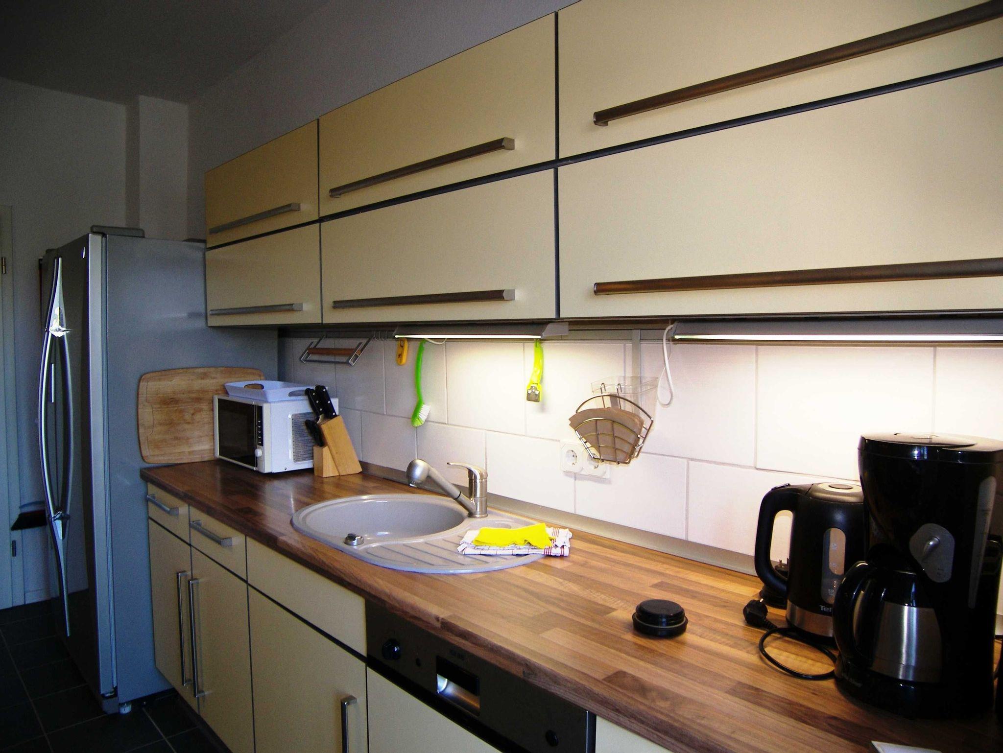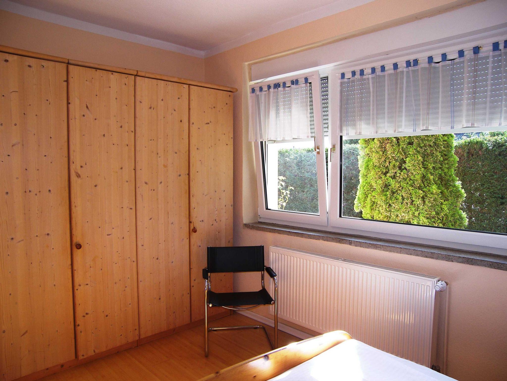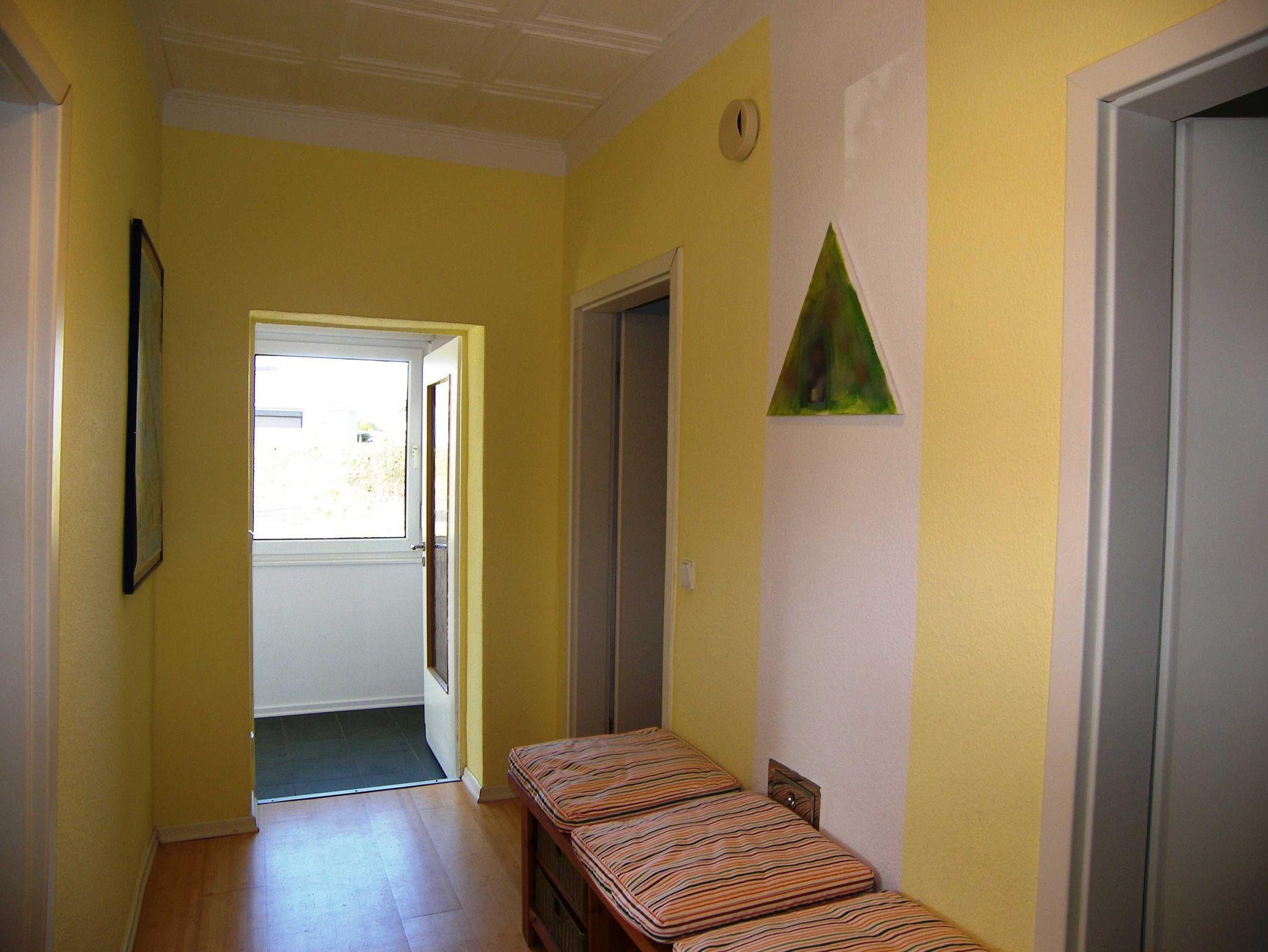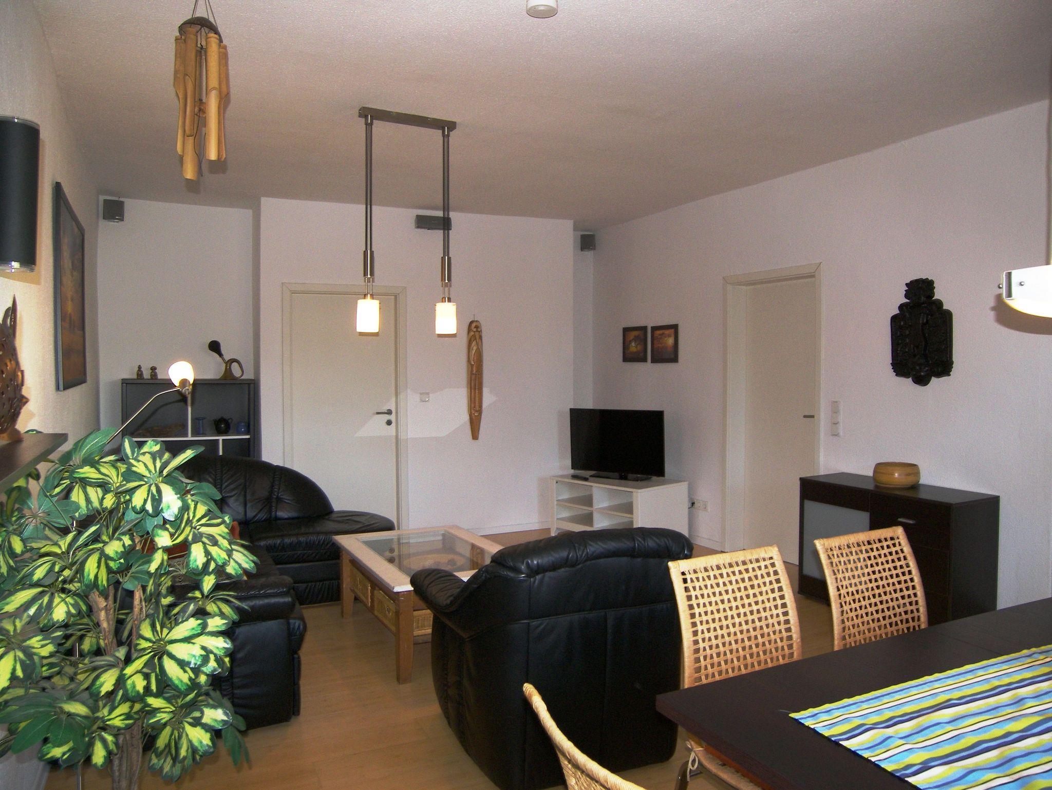 Großzügige Ferienwohnung (DHH) mit 2 Schlafzimmern, großem Wohnzimmer mit Essbereich, offener Küche, Terrasse und Bad mit Badewanne. Die Wohnung ist komplett mit Laminat und Fliesen ausgestattet. Ein Schlafzimmer (ca. 15m²) hat neben einem großen Kleiderschrank ein Doppelbett 1,80x2m und Platz für ein Kinderreisebett. Im zweiten Schlafzimmer (ca. 20m²) gibt es vier Schlafmöglichkeiten: ein Doppelbett 1,80x2m, ein Hochbett 0,90x2m, eine separate Schlafcouch max. 1,30x1,80m, sowie einen kleinen Kleiderschrank. Außerdem steht hier ein Kindergitterbett 70x140. Der Essbereich ist in das Wohnzimmer integriert und bietet Platz bis 6 Personen. Die angrenzende Küche hat eine Kochinsel mit 4 Platten Ceranfeld, einen Backofen mit Grill, eine Mikrowelle, einen großen Kühlschrank (Side by Side) mit Gefrierschrank und eine Spülmaschine. Eine große Terrasse lädt zum Frühstücken ein. Bettwäsche und Handtücher bekommen Sie gegen eine Gebühr vor Ort, wenn Sie das wünschen. Zwei überdachte Parkplätze (Doppelcarport) sind am Haus vorhanden (für normale PKW bis VW-Bus Größe ohne Dachbox ö.Ä.).