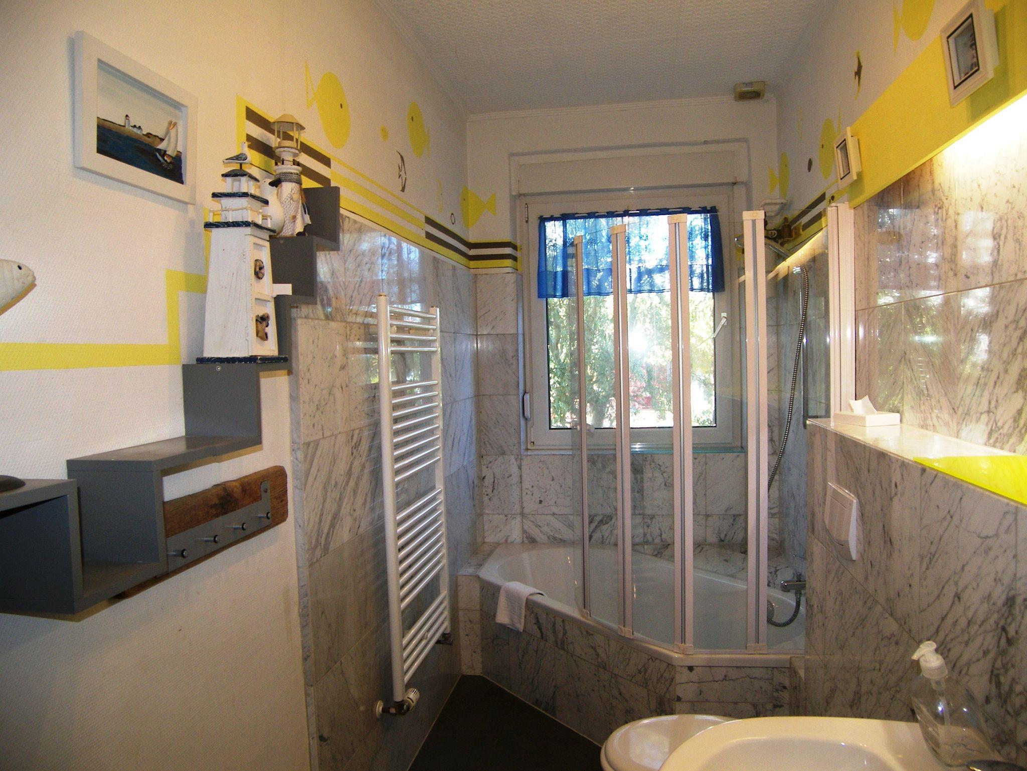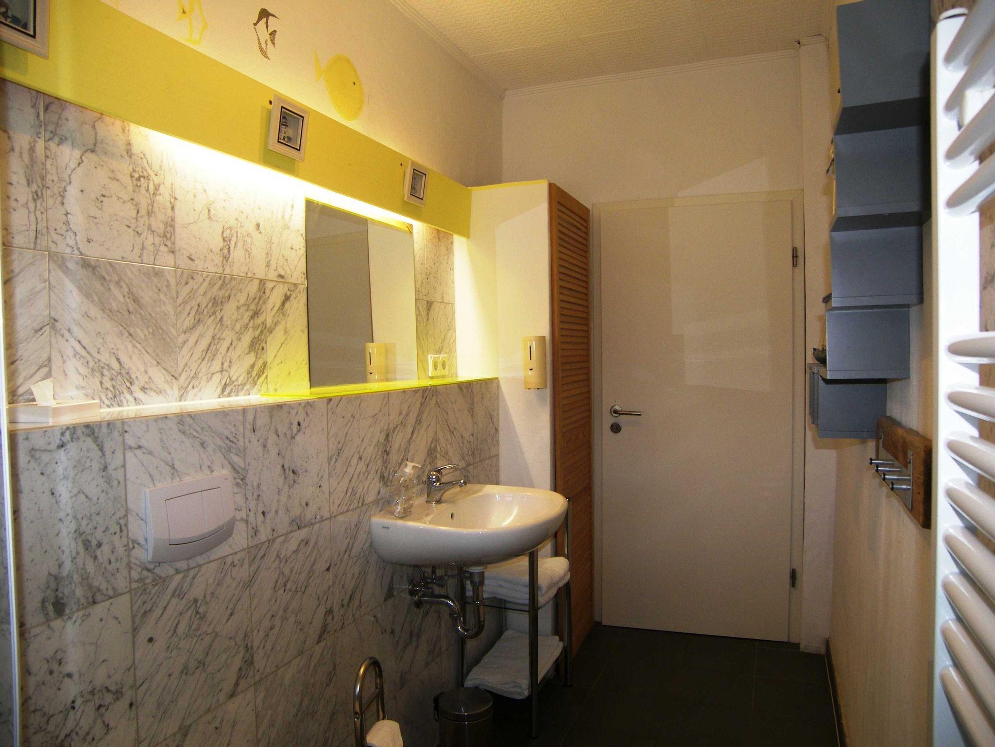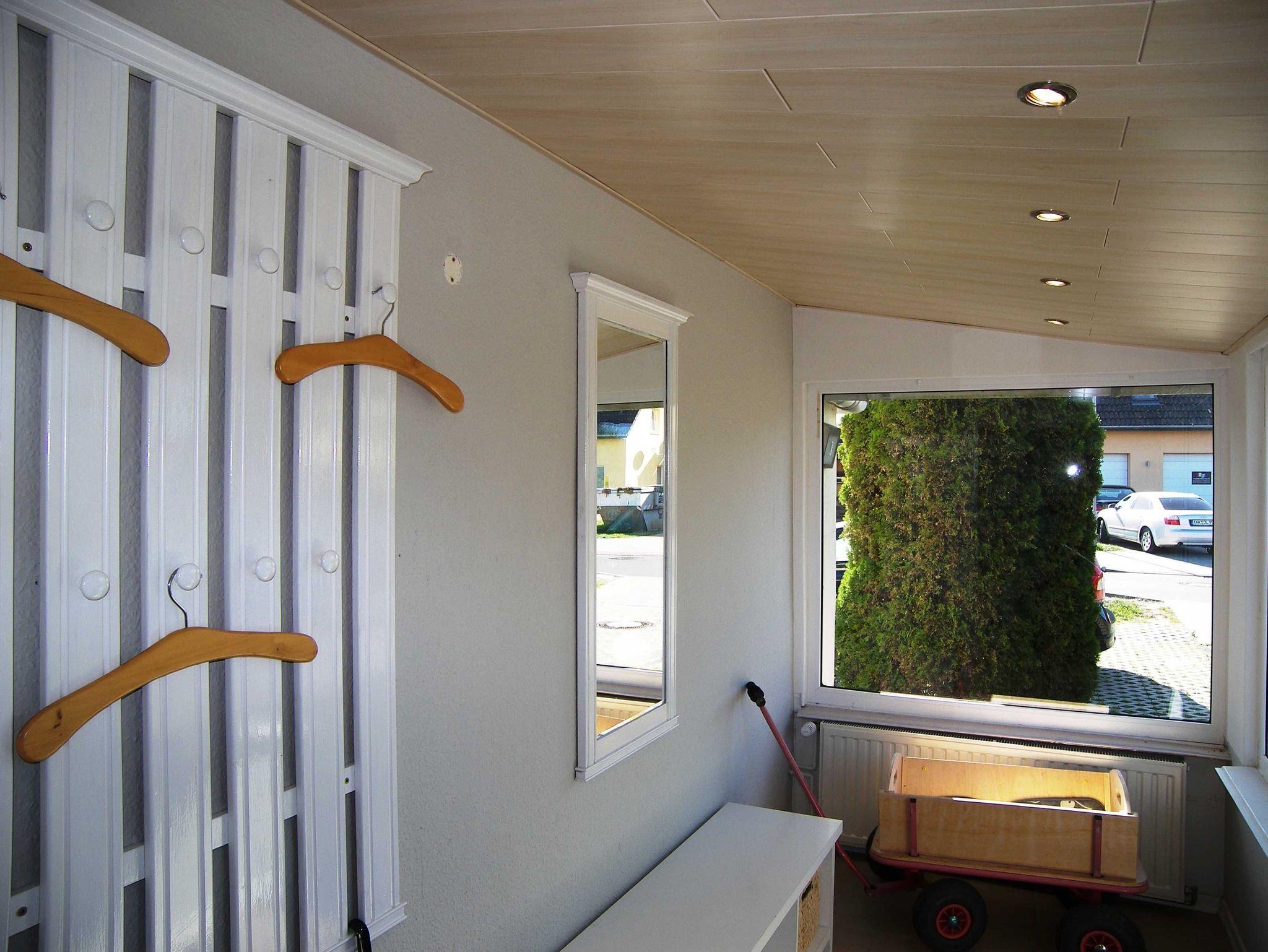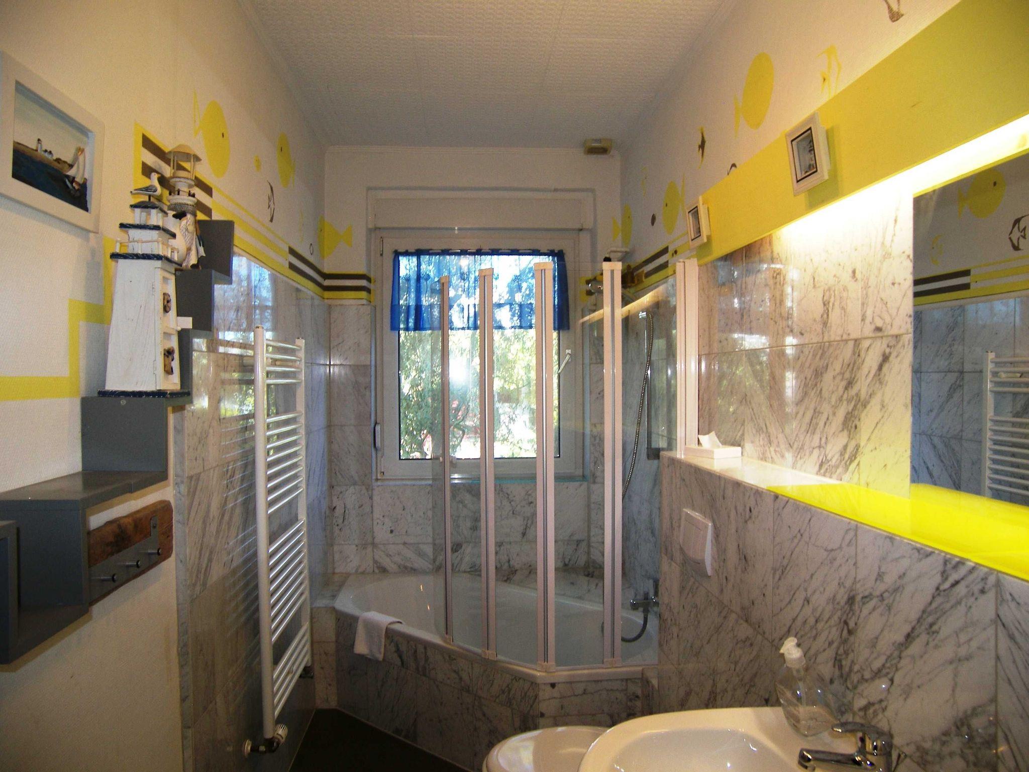 Großzügige Ferienwohnung (DHH) mit 2 Schlafzimmern, großem Wohnzimmer mit Essbereich, offener Küche, Terrasse und Bad mit Badewanne. Die Wohnung ist komplett mit Laminat und Fliesen ausgestattet. Ein Schlafzimmer (ca. 15m²) hat neben einem großen Kleiderschrank ein Doppelbett 1,80x2m und Platz für ein Kinderreisebett. Im zweiten Schlafzimmer (ca. 20m²) gibt es vier Schlafmöglichkeiten: ein Doppelbett 1,80x2m, ein Hochbett 0,90x2m, eine separate Schlafcouch max. 1,30x1,80m, sowie einen kleinen Kleiderschrank. Außerdem steht hier ein Kindergitterbett 70x140. Der Essbereich ist in das Wohnzimmer integriert und bietet Platz bis 6 Personen. Die angrenzende Küche hat eine Kochinsel mit 4 Platten Ceranfeld, einen Backofen mit Grill, eine Mikrowelle, einen großen Kühlschrank (Side by Side) mit Gefrierschrank und eine Spülmaschine. Eine große Terrasse lädt zum Frühstücken ein. Bettwäsche und Handtücher bekommen Sie gegen eine Gebühr vor Ort, wenn Sie das wünschen. Zwei überdachte Parkplätze (Doppelcarport) sind am Haus vorhanden (für normale PKW bis VW-Bus Größe ohne Dachbox ö.Ä.).