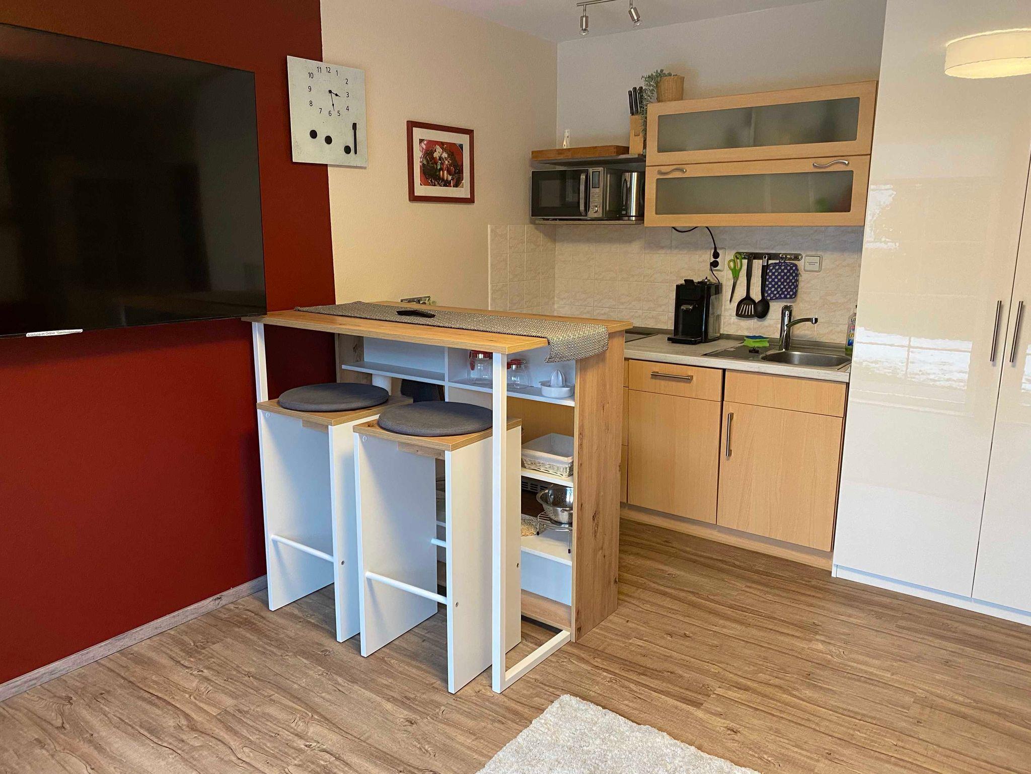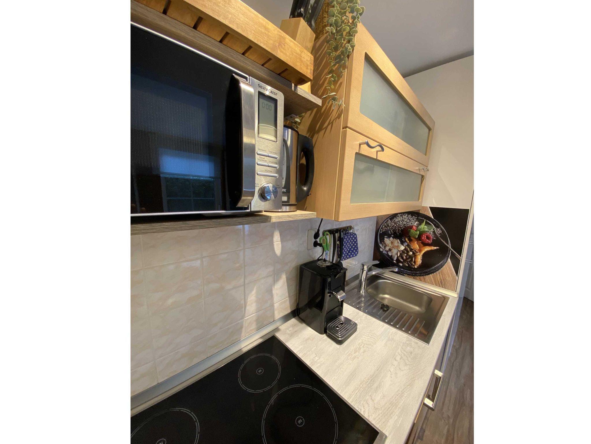 - gut ausgestattete Küchenzeile mit Kühlschrank, Spülmaschine, 4 Platten Induktionsherd, Mikrowelle, Kaffeemaschine, Toaster und Wasserkocher,