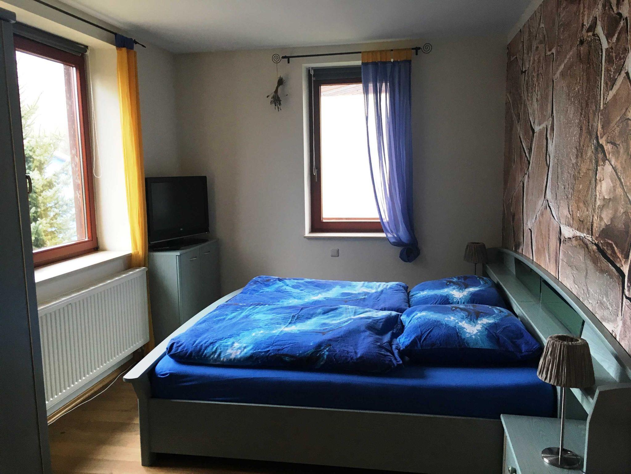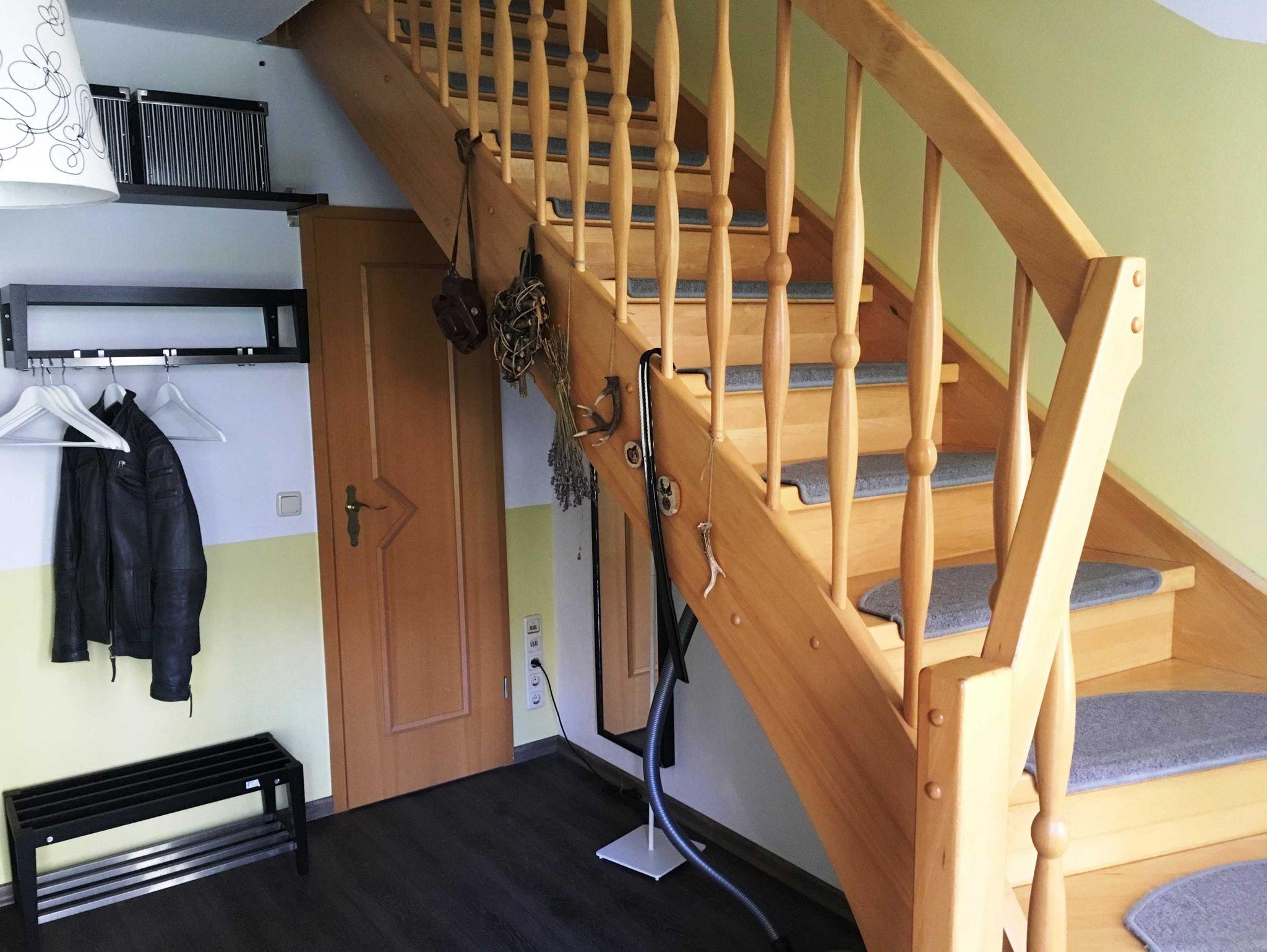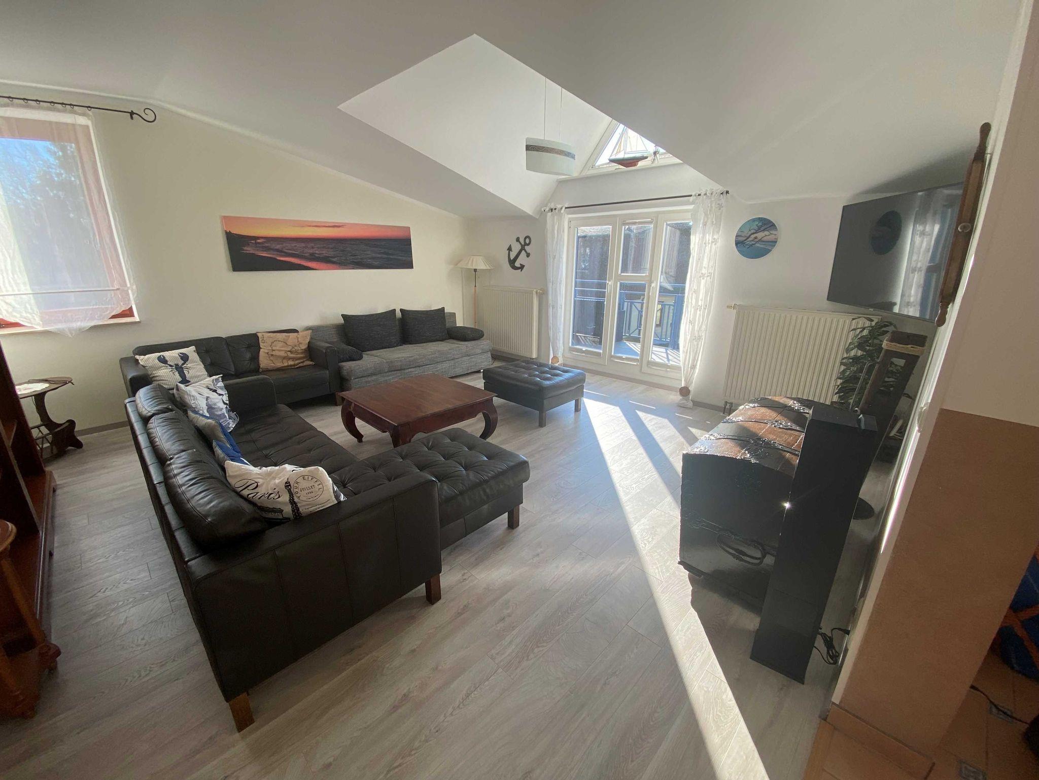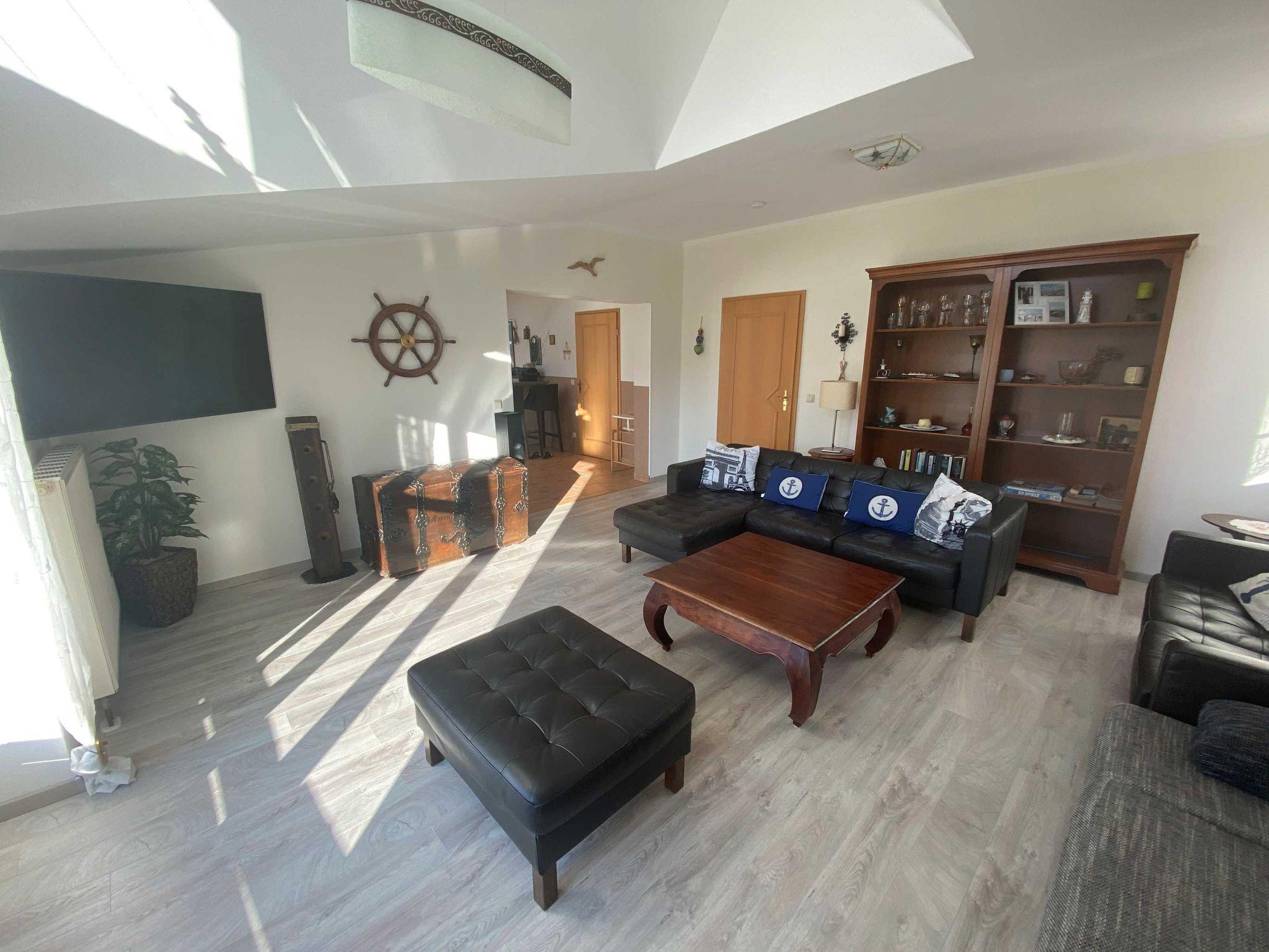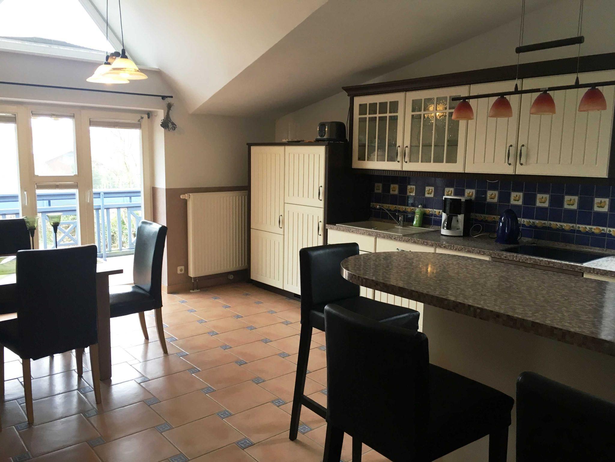Die Ferienwohnung erstreckt sich über zwei Etagen. In der unteren Etage befindet sich der Eingangsbereich. Auf der zweiten Ebene befindet sich der Wohnbereich mit offener Küche und der Essbereich. Das große Wohnzimmer bietet genügend Platz für 6 Personen und verfügt über einen Flachbildfernseher und eine ausziehbare Couch. Die Küchenzeile ist voll ausgestattet mit einem Backofen, Kühlschrank, Mikrowelle und einer Spülmaschine.