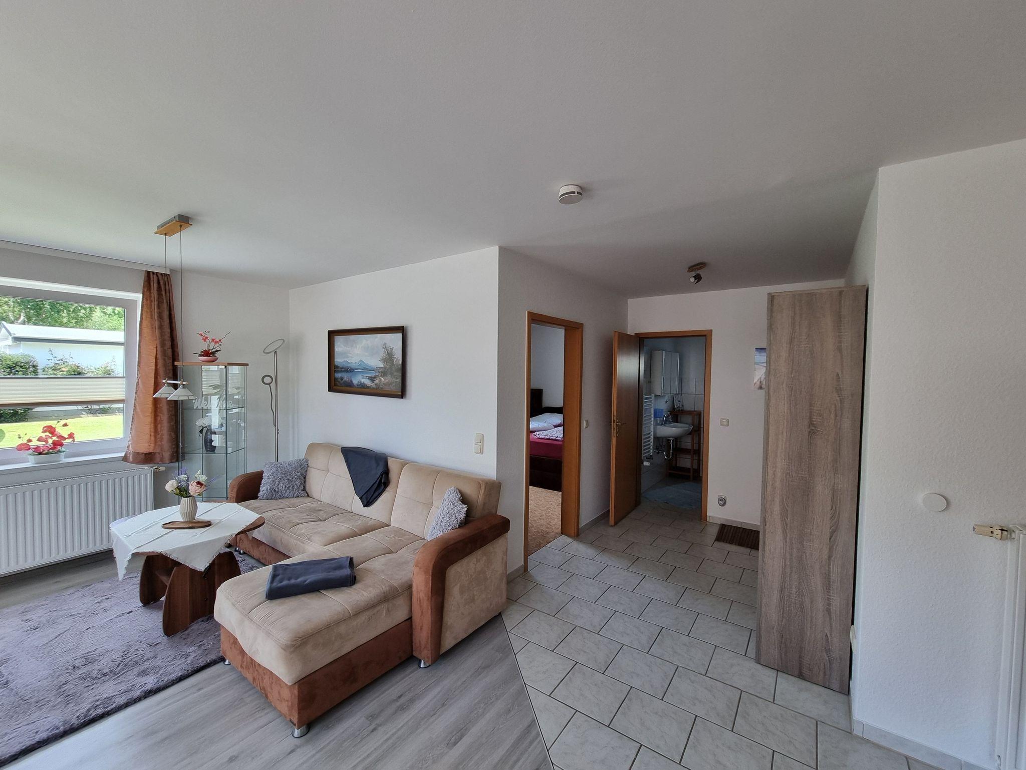 Die Ferienwohnung hat ein Schlafzimmer mit einem großen Doppelbett und ein Wohnbereich mit offener Küche. Es gibt eine gemütliche Couch, SAT-TV und eine gut ausgestattete Küche mit Essbereich.