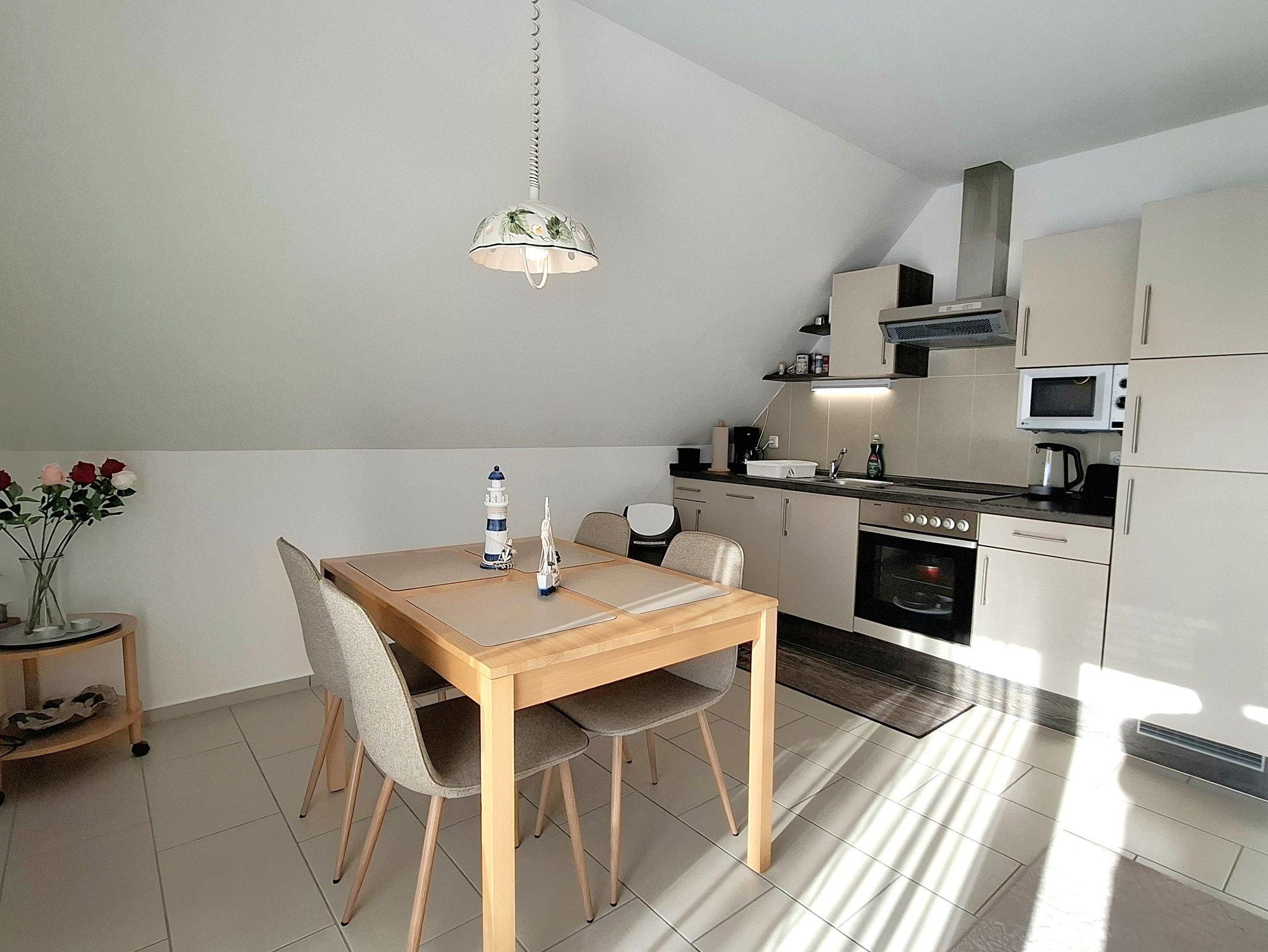 Die offene Küche ist mit Cerankochfeld, Backofen, Geschirrspüler, Kühlschrankgefrier- Kombination, Mikrowelle, Kaffeemaschine, Wasserkocher und Toaster ausgestattet und es wird Ihnen eine Erstausstattung mit Spülmittel, Schwamm, Tuch, Geschirrtuch und Spülmaschinentabs, Kaffee und Kaffeefilter bereitgestellt.