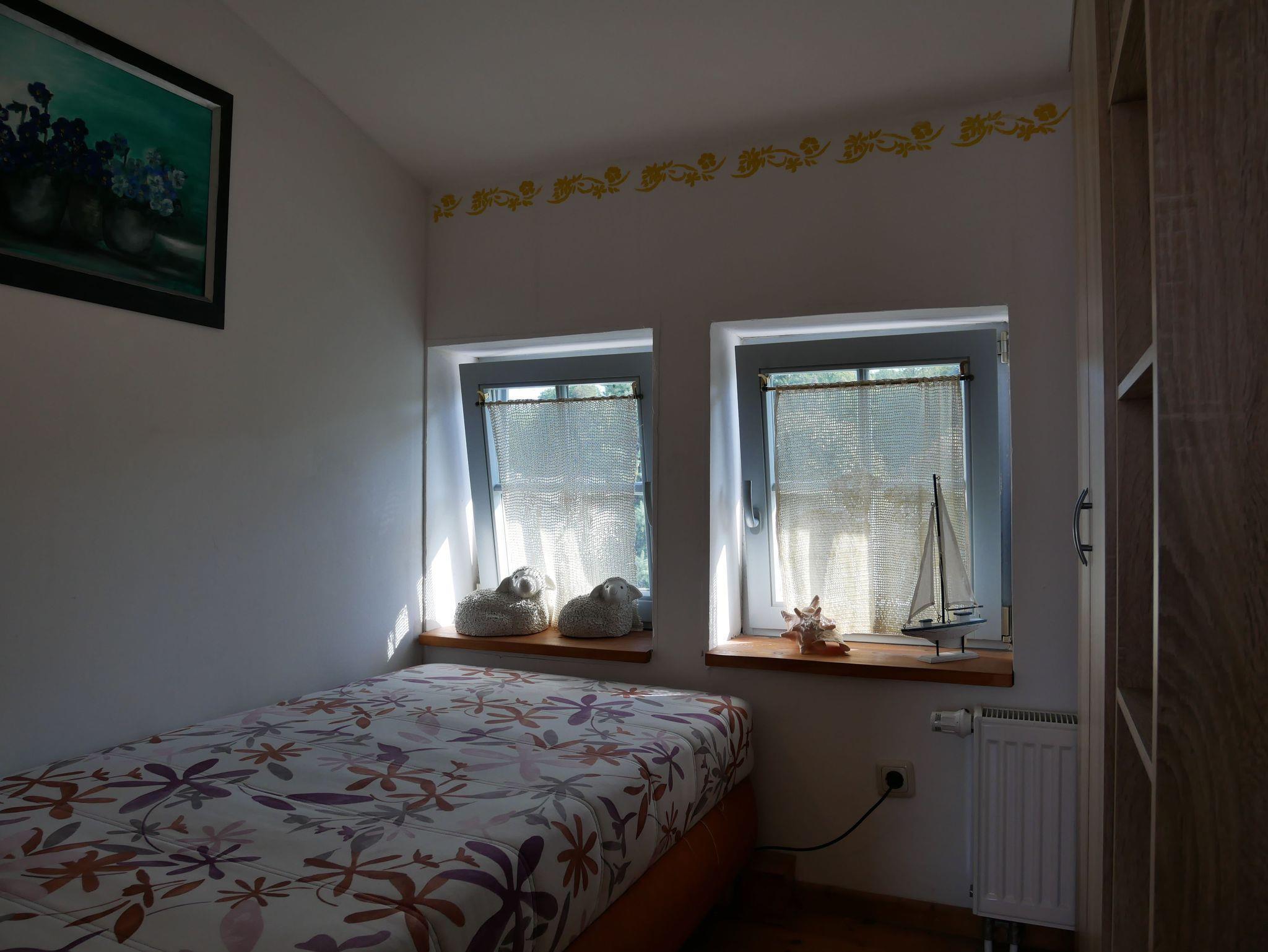 Die Ferienwohnung liegt im Dachgeschoss (2.OG) und ist für bis zu 3 Personen gut geeignet. Sie teilt sich auf in einen Wohnraum mit Küche, zwei abgeteilten Schlafräumen mit Doppel- bzw. Einzelbett und Kleiderschrank, sowie einem Bad mit Dusche und WC. Die Küche ist mit einem Elektroherd mit Ceranfeld, Kaffeemaschine, Wasserkocher, Toaster, Kühlschrank und Geschirrspüler ausgestattet.