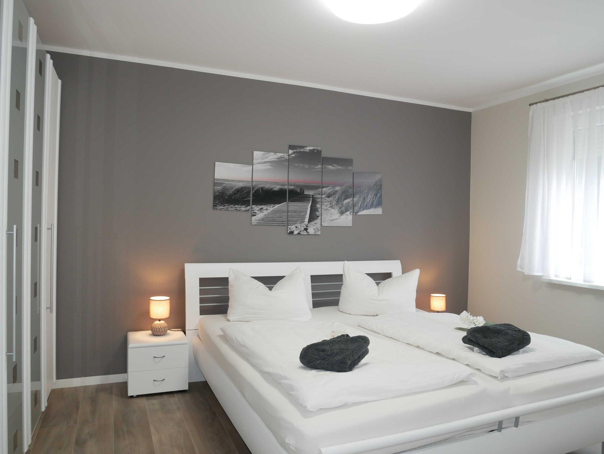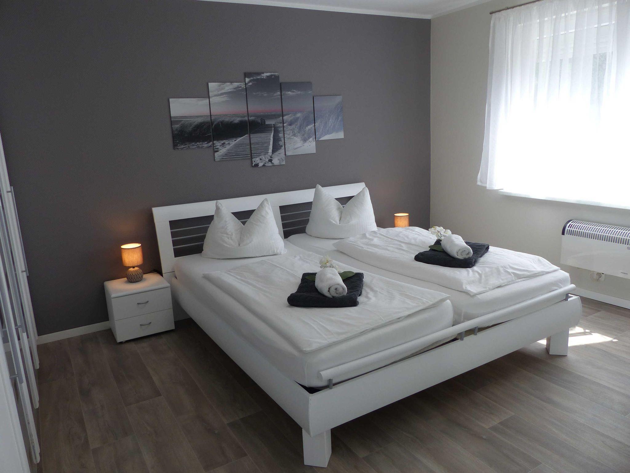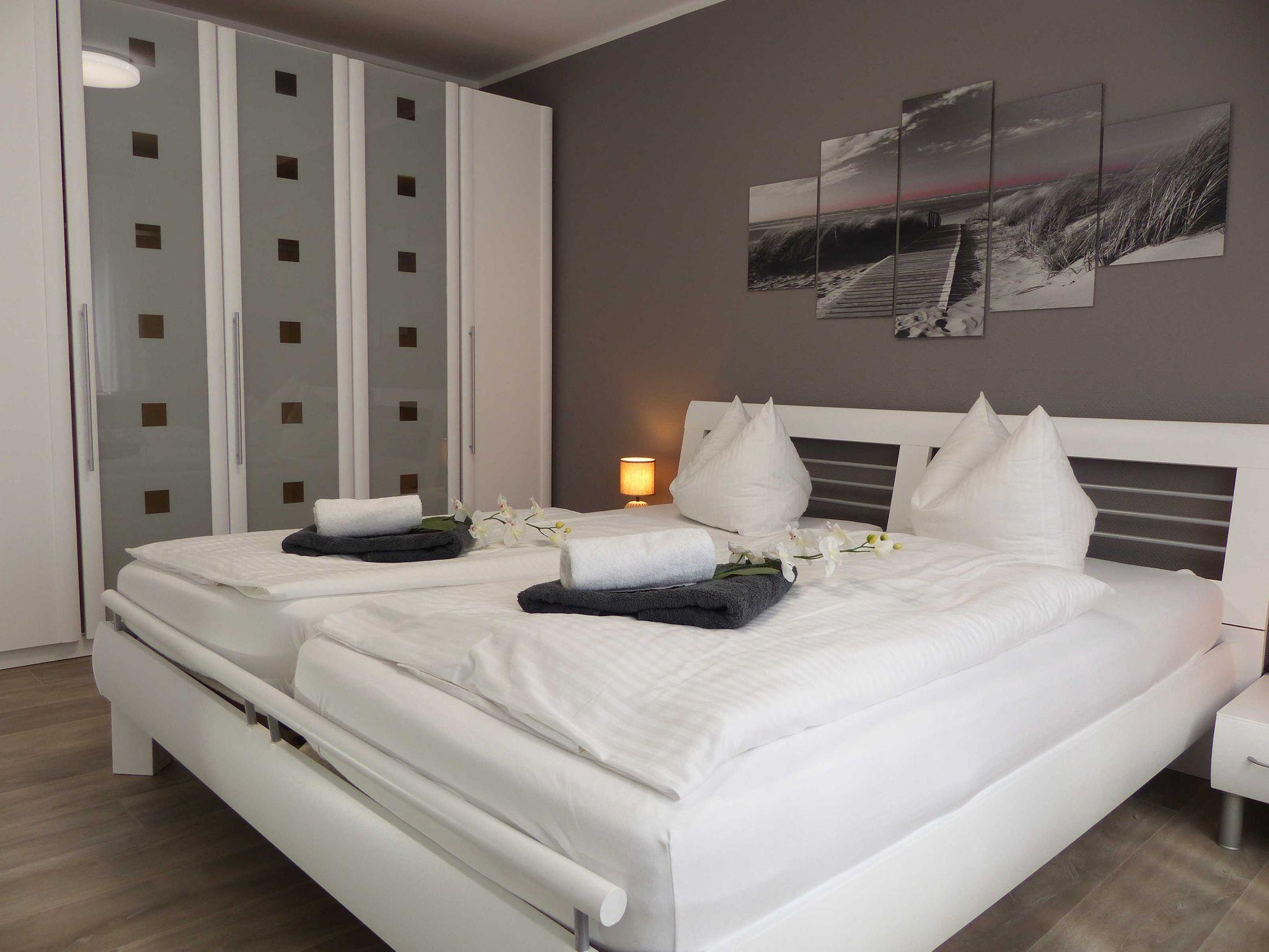 Ein Schlafzimmer ist mit einem Doppelbett, und einem Kleiderschrank ausgestattet. Das zweite Schlafzimmer verfügt über zwei Einzelbetten und einen Kleiderschrank.