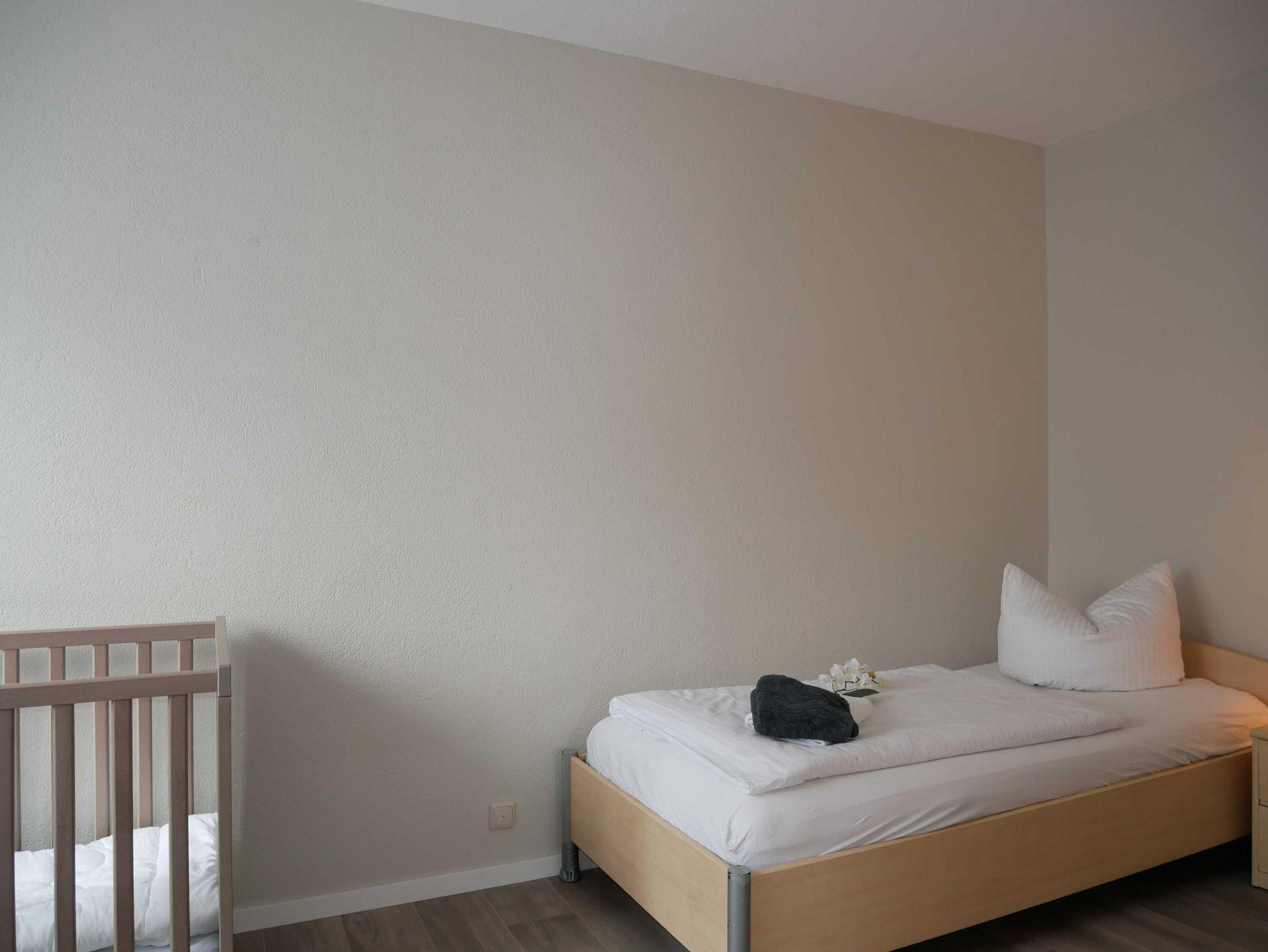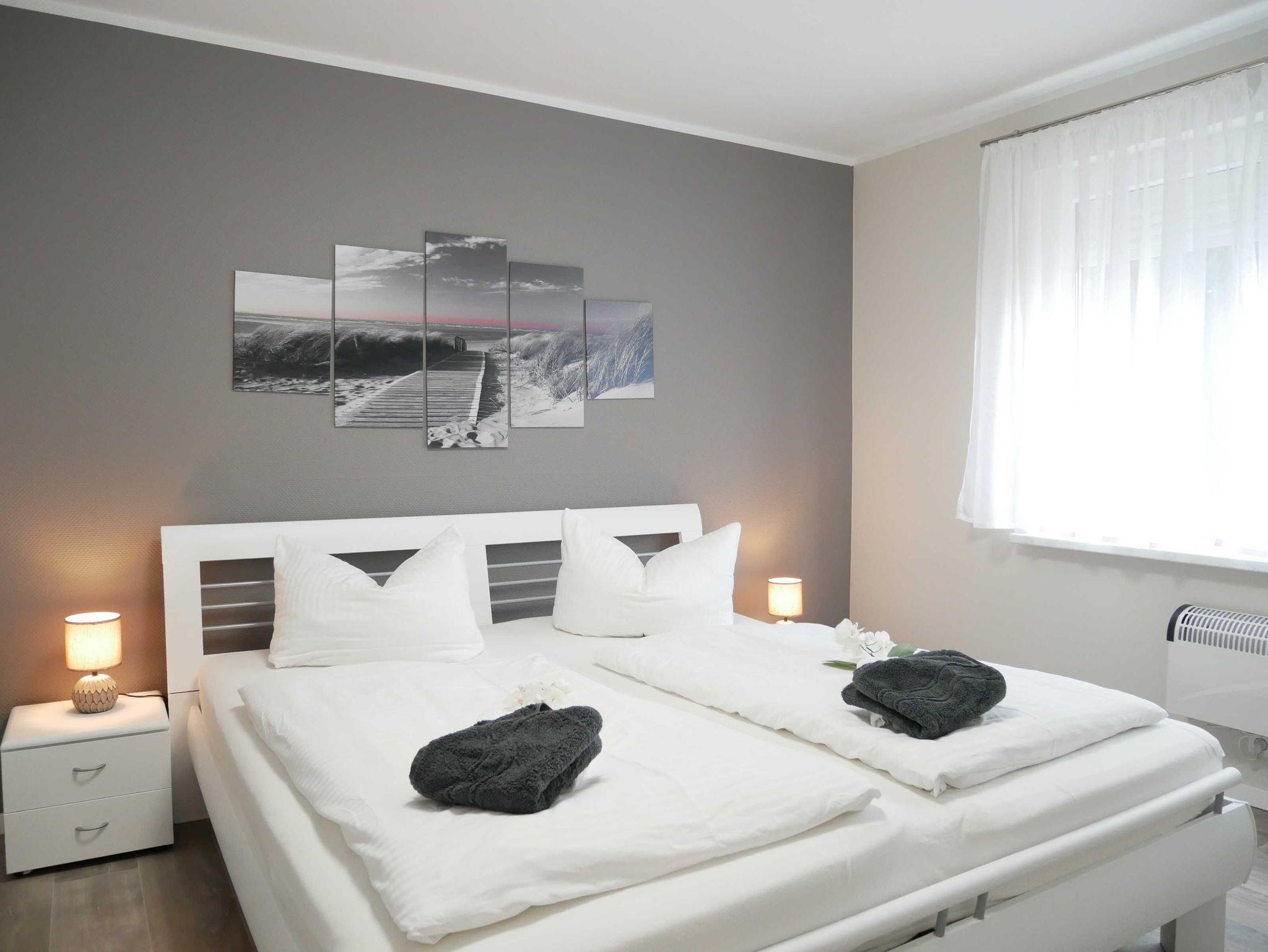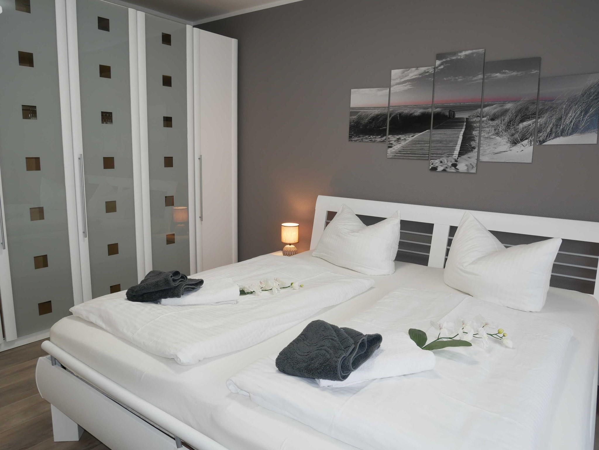 Ein Schlafzimmer ist mit einem Doppelbett, und einem Kleiderschrank ausgestattet. Das zweite Schlafzimmer verfügt über zwei Einzelbetten und einen Kleiderschrank.