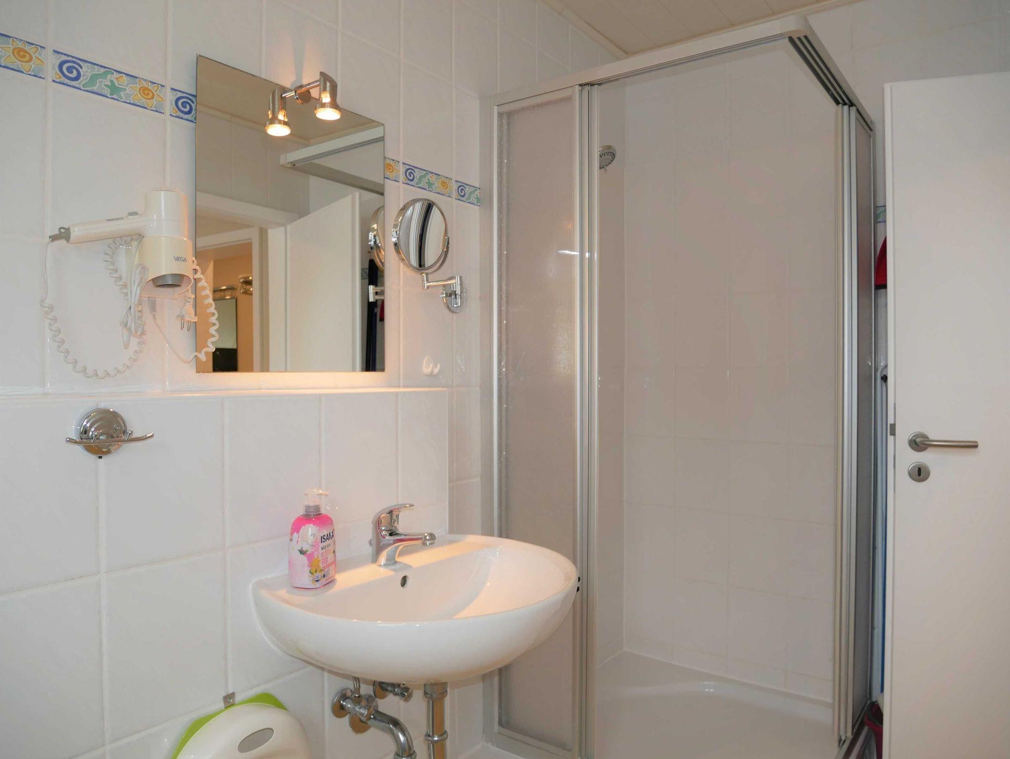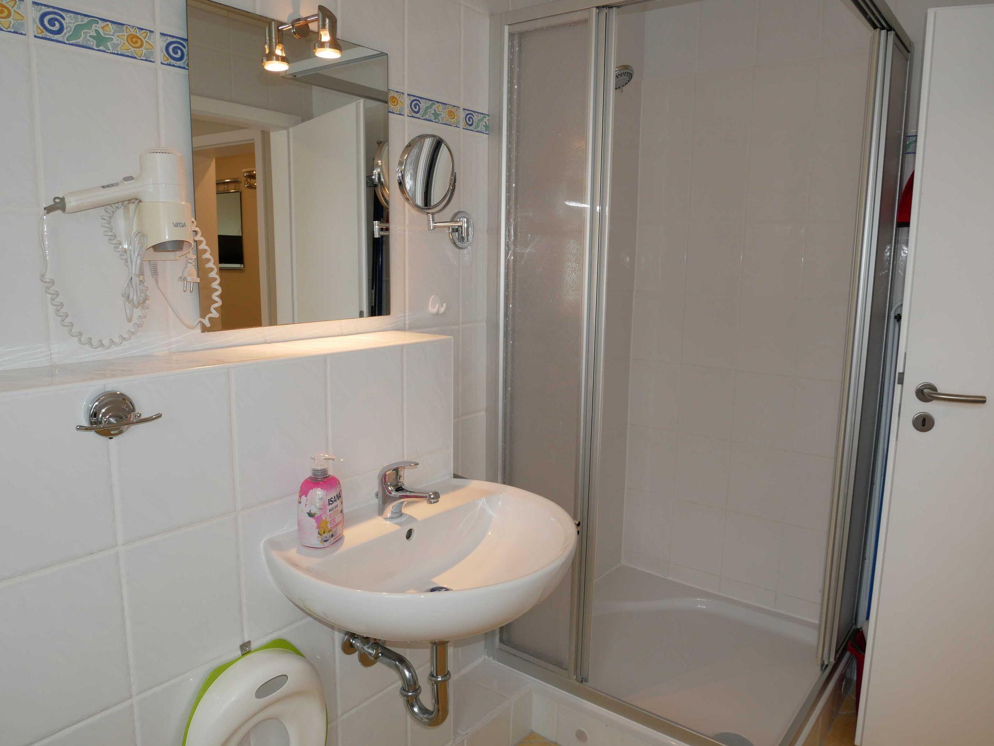 Das Badezimmer ist mit einer Dusche, Haartrockner, separatem Schminkspiegel und einer zusätzlichen Beleuchtung über dem Spiegel ausgestattet.