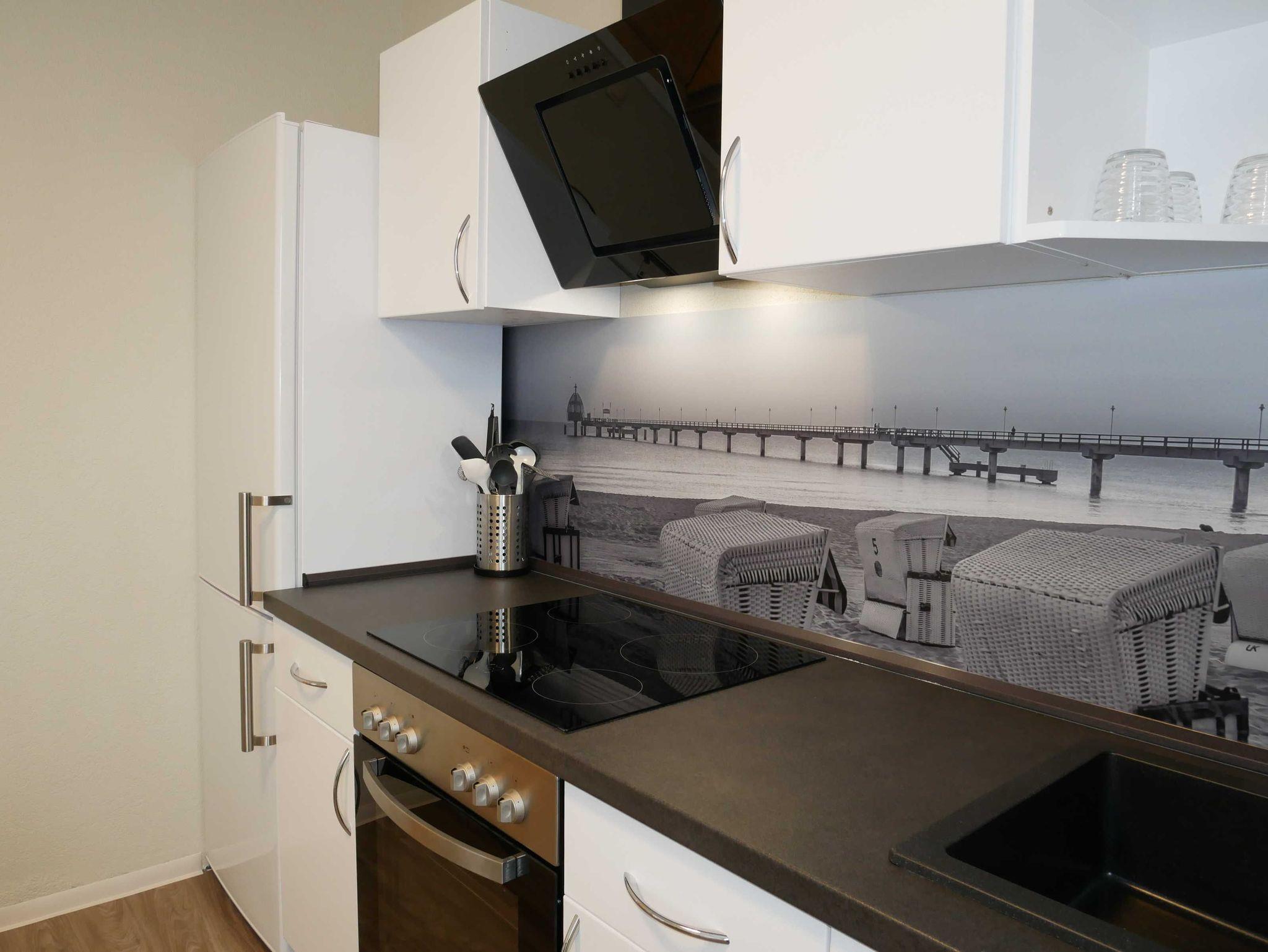 Die Küche bietet die Möglichkeit mit einem Herd (4 Kochplatten), dem Backofen und der Dunstabzugshaube ausgiebig zu kochen oder zu backen. Die Küche verfügt außerdem über einen Toaster, Kaffeemaschine, Wasserkocher, Kühlschrank mit Gefrierfach, Mikrowelle und einen Geschirrspüler.