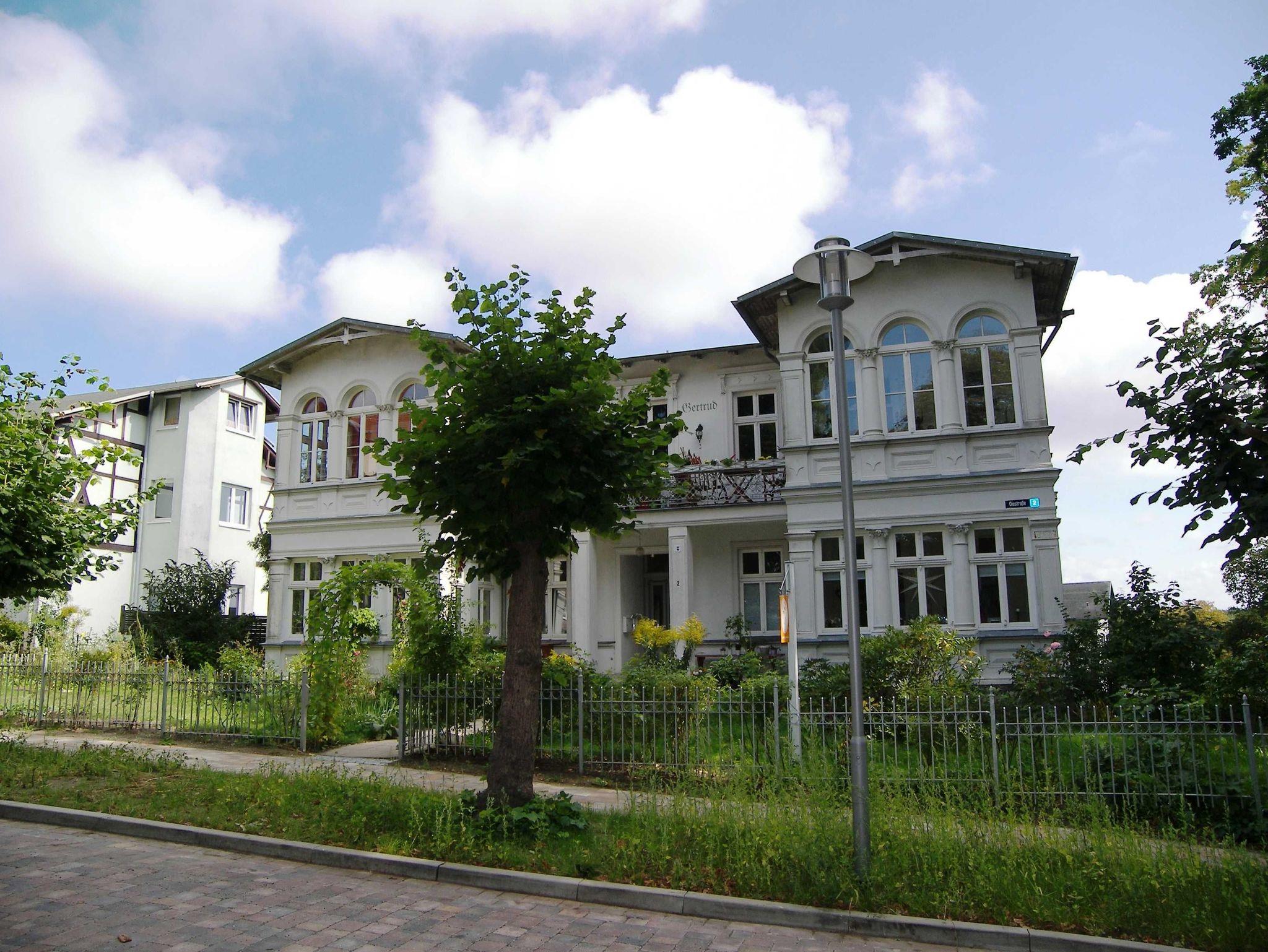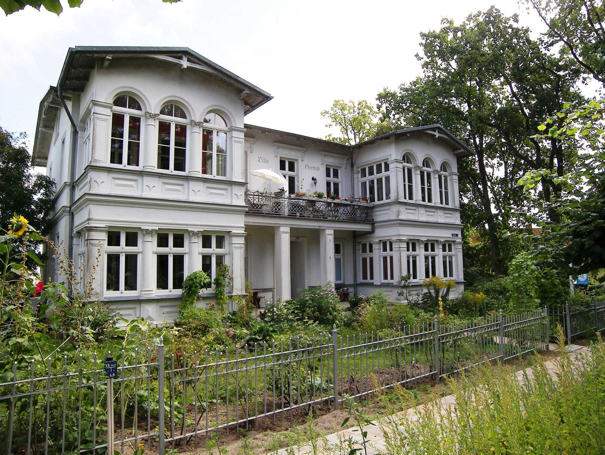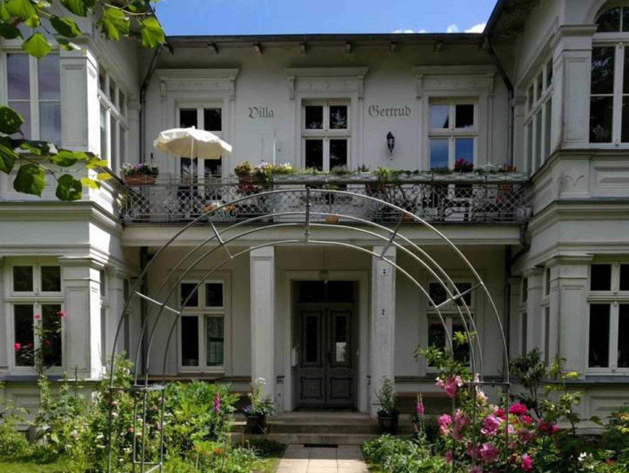 Die denkmalgeschützte Villa Gertrud ist ruhig auf dem Glienberg (ca. 32 Meter ü. NN) in Zinnowitz gelegenen. Durch den Wald gelangt man in knapp 10 Gehminuten zum feinsandigen Ostseestrand. Das Ortszentrum von Zinnowitz mit zahlreichen Geschäften, Restaurants, Theater und Tennisplatz ist ebenfalls in wenigen Minuten zu Fuß zu erreichen. Die Ferienwohnung Kaiser und die Ferienwohnung Rudolph liegen auf der Rückseite des Hauses am südöstlichen Garten mit Terrassen. Sie verfügen über einen jeweils separaten Eingang. Die Ferienwohnung Rudolph ist barrierefrei. Ein Parkplatz pro Wohnung ist vorhanden.