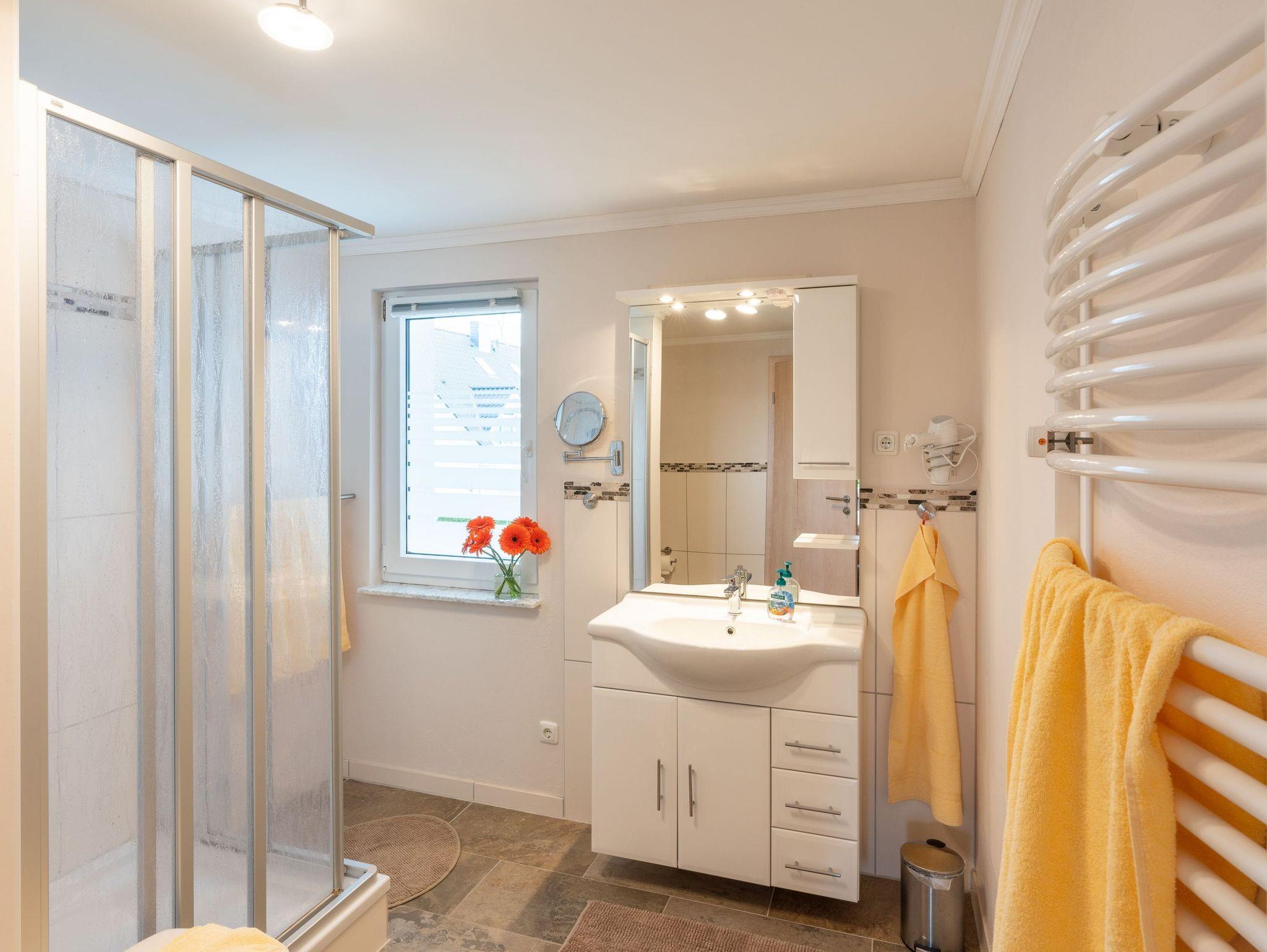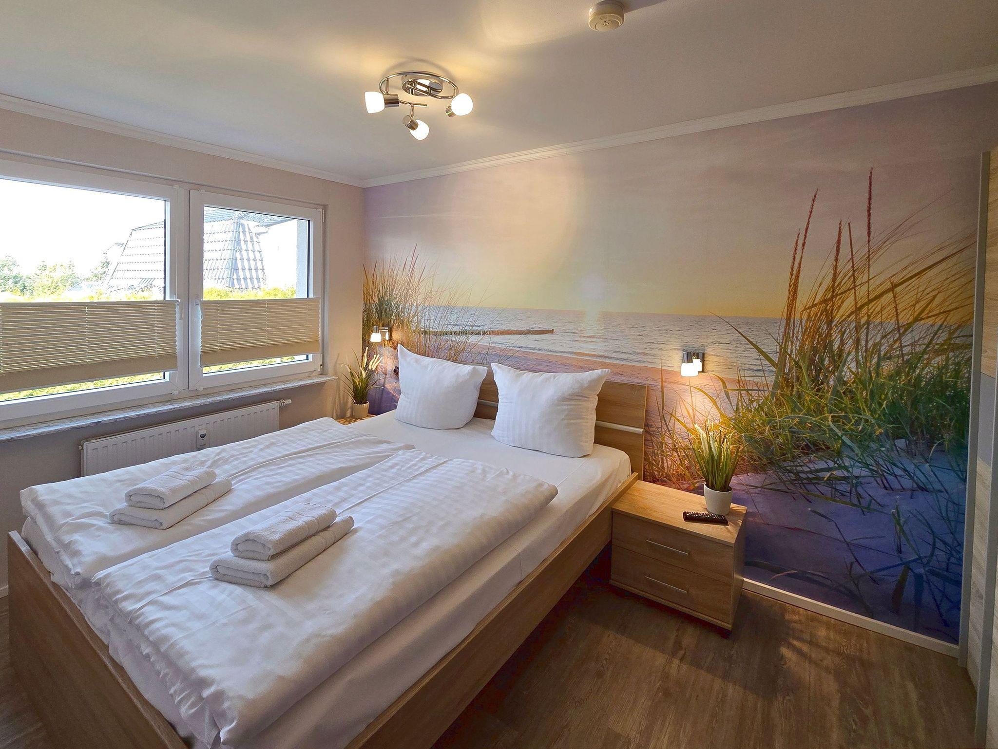 Im großzügigem Schlafzimmer mit FlatTV erwartet Sie ein bequemes Doppelbett (160 x 200cm / zwei getrennte Matratzen) zur Nachtruhe, damit Sie entspannt und erholt in den nächsten Urlaubstag starten können. Damit Sie Ihre wohlverdiente Urlaubszeit bereits am Anreisetag in vollen Zügen genießen können, haben wir das Bett für Sie und das für Ihre lieben Mitreisenden bereits bezogen und ein Duschtuch sowie ein kleines Handtuch bereitgelegt. Das angrenzende Badezimmer ist mit Dusche, WC und einem Haartrockner ausgestattet.