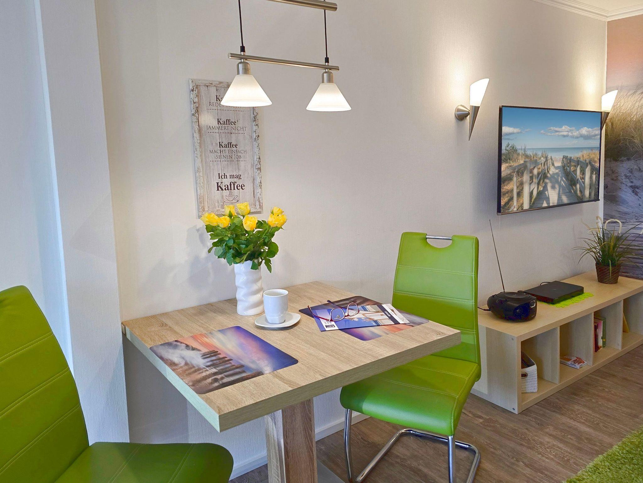 Ein bequemes Sofa, FlatTV und ein Bluray Player sowie ein Esstisch für zwei Personen runden den Urlaubskomfort dieses Appartements ab. Auf dem Grundstück lädt eine gemütliche Sitzecke mit Südwestausrichtung im Grünen mit eigenem Grill zum Ausklingen des erlebnisreichen Urlaubstages bei einem sommerlichen Abendbrot ein.