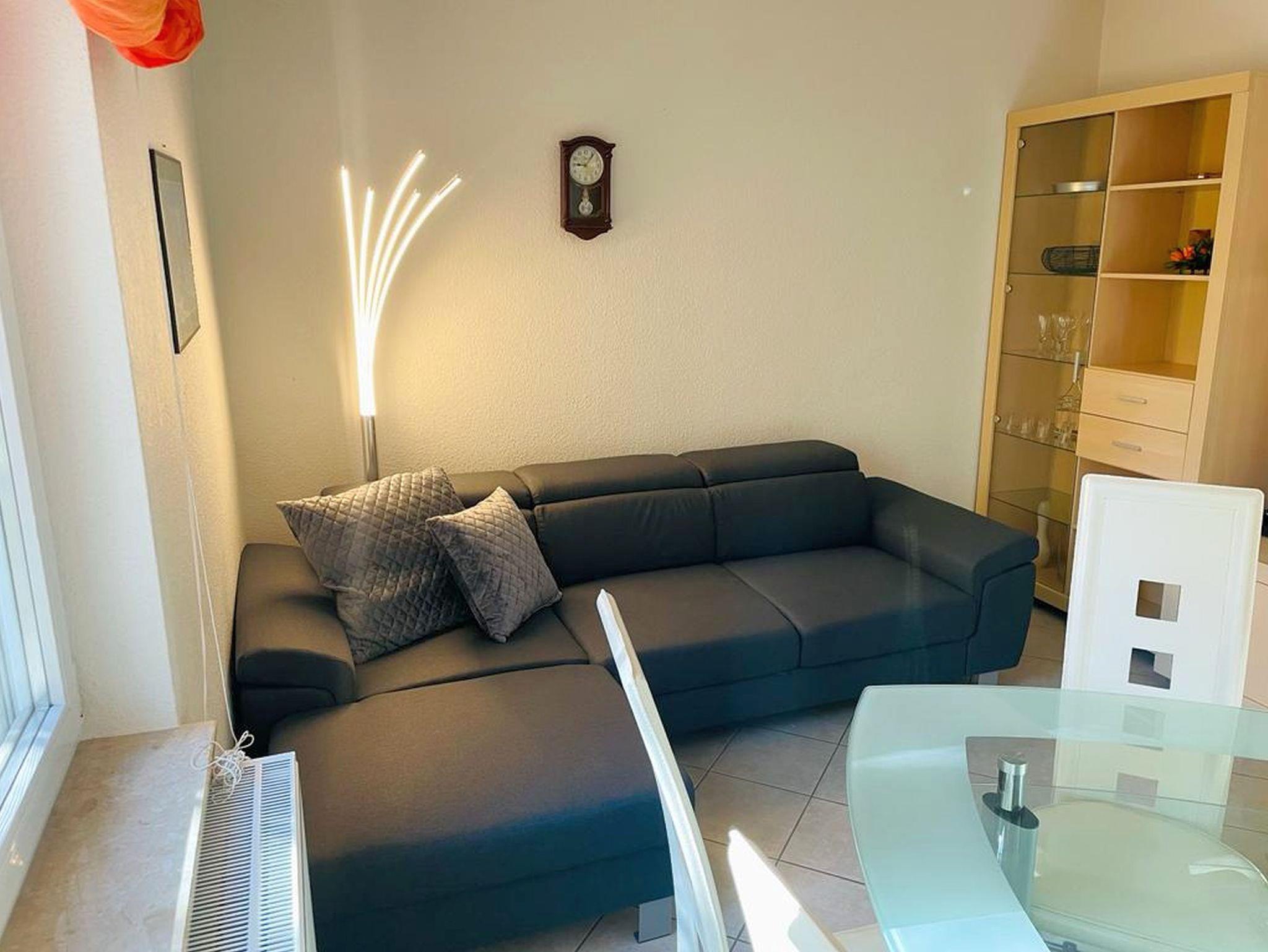 Im Wohnzimmer finden Sie eine gemütliche Sitzecke (umwandelbar zum Bett für 1 Erwachsenen oder 2 Kinder bis ca. 14 Jahre), TV und Radio sowie eine offene Küche mit Essplatz für 6 Personen. Die Küchenzeile bietet alles für den Urlaub: Geschirrspüler, Kühlschrank mit Gefrierfach, Ceranherd mit Backofen, Kaffeemaschine, Toaster und mehr.