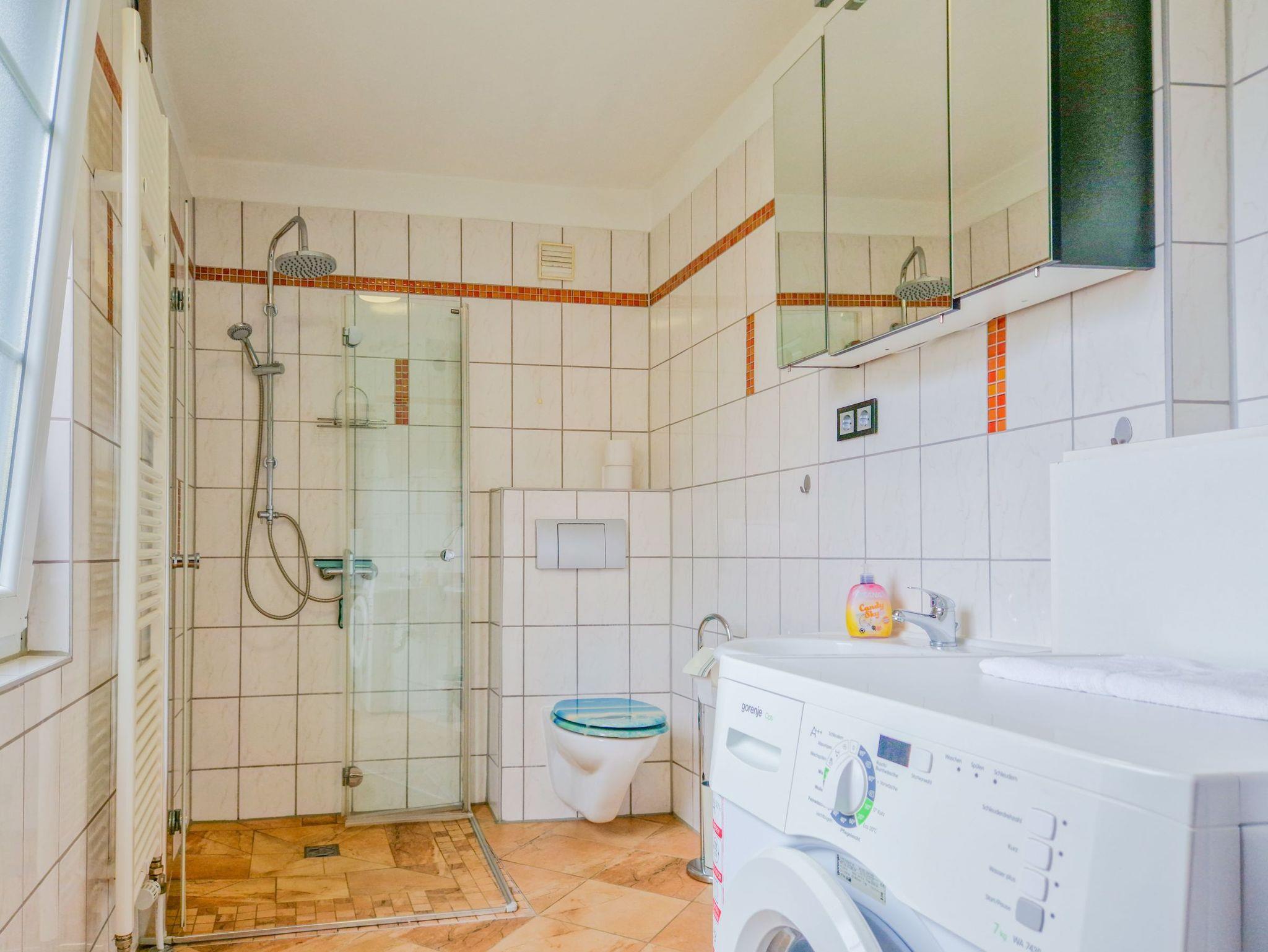 Das moderne Badezimmer mit Dusche, WC, Waschbecken und sogar einer Waschmaschine sorgt dafür, dass es Ihnen an nichts fehlt, auch nicht bei der Wäsche.