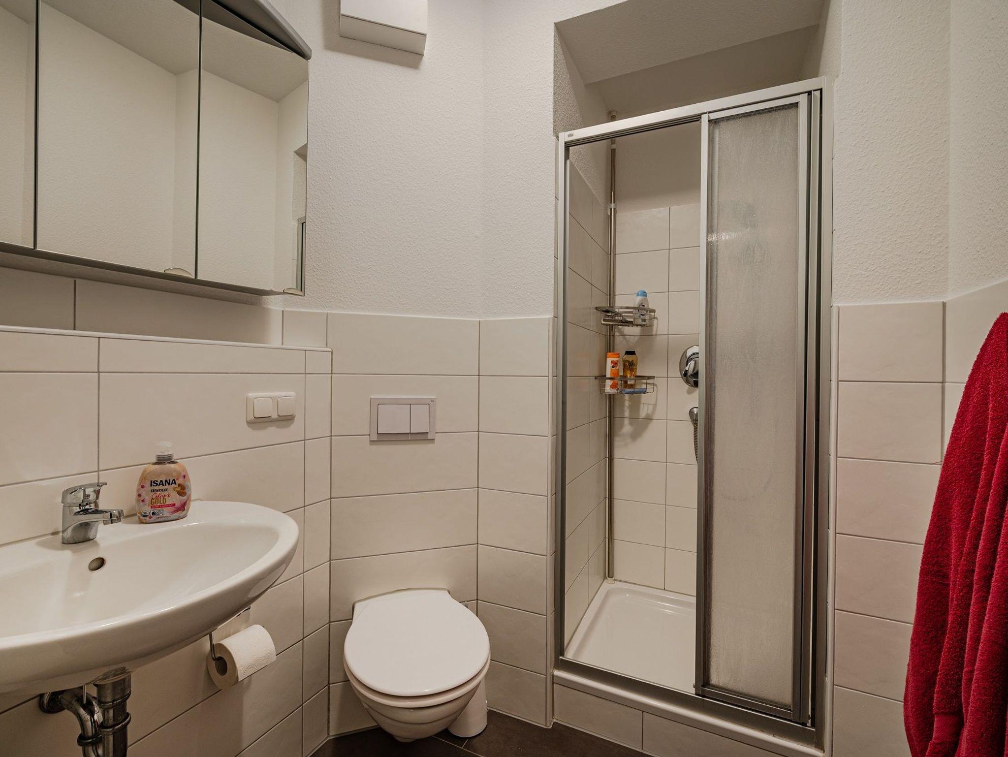 Das Badezimmer verfügt über eine Dusche (mit Duschwanne) und WC.