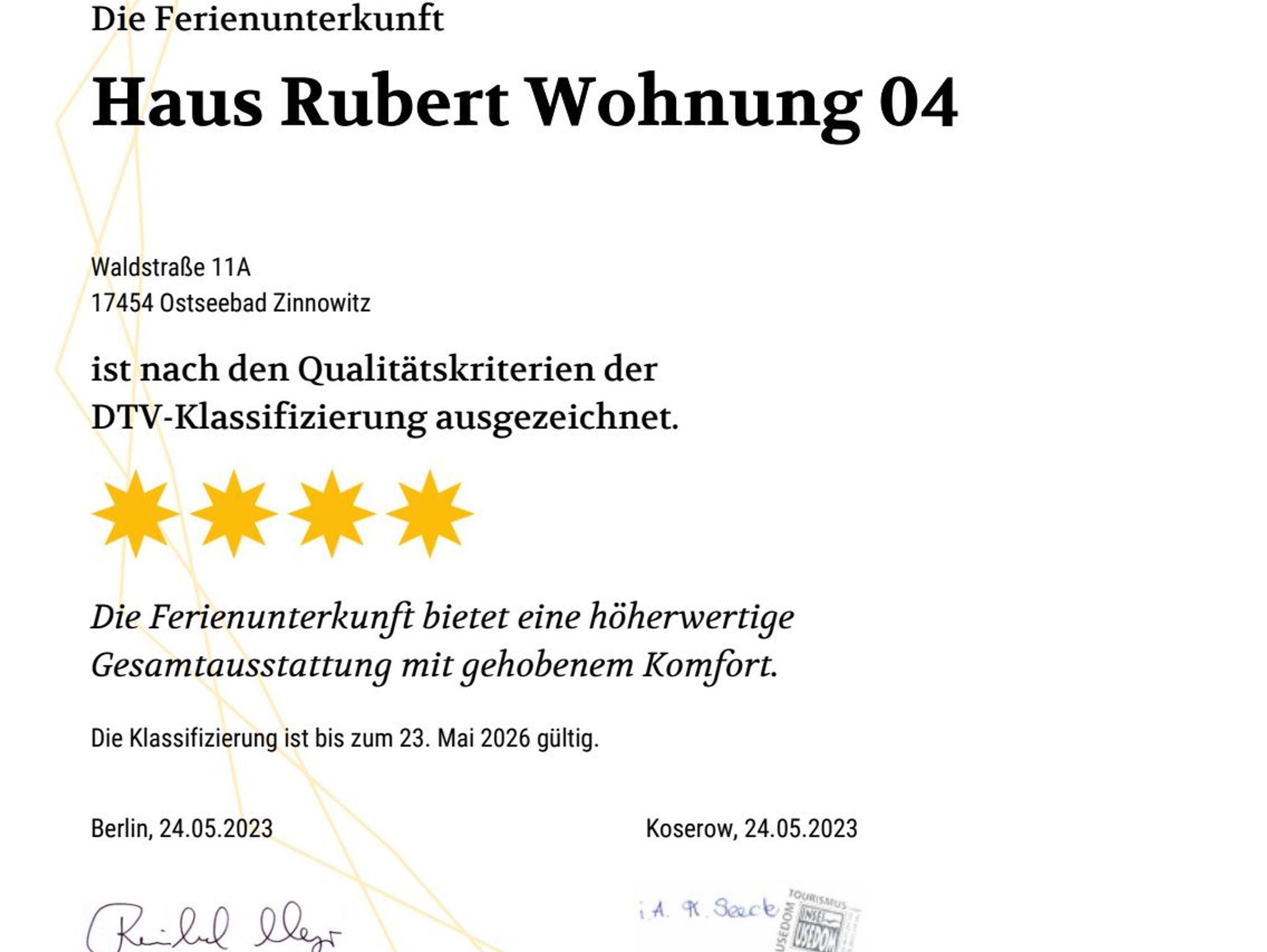 • Diese Wohnung wurde vom DTV (Deutscher Tourismusverband) mit 4-Sternen bei einer Belegung mit 2 Personen klassifiziert. Bei einer Belegung von mehr als 2 Personen ist der DTV-Sterne-Standard von 4-Sternen nicht mehr gewährleistet.