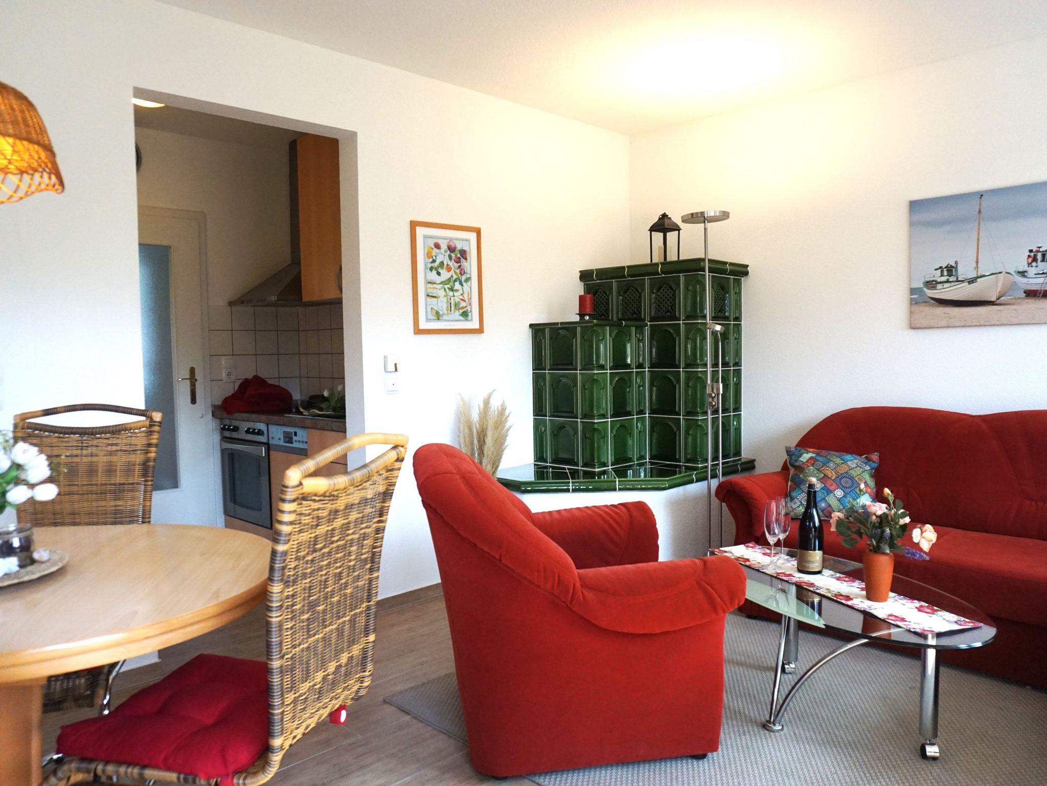 1 Wohnraum + elektr. Kaminofen, Küche und Essbereich