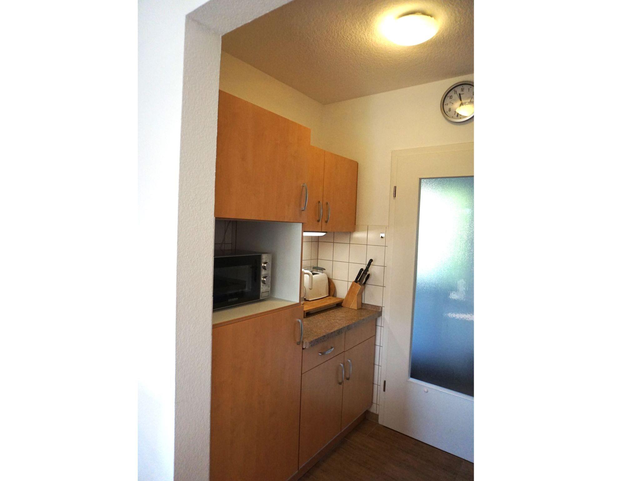 gut eingerichtete Küche mit Ceranherd, Wasserkocher, Backofen, Geschirr, Besteck, Gläser, Kaffeemaschine, Toaster, Kühlschrank, Mikrowelle, Staubsauger, TV, Mini-Stereoanlage mit CD-Player, WLAN